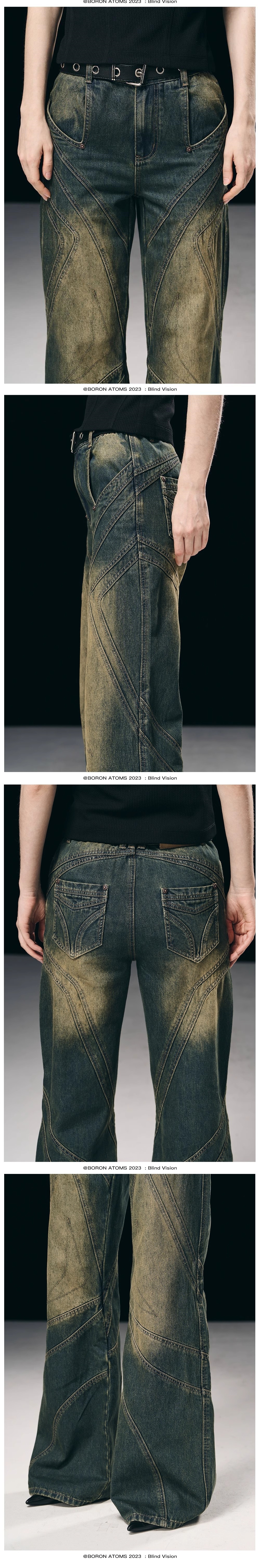 - Multi-panel asymmetrical design, precise cutting, perfect fit, and a slight flare at the hem. The overall garment is treated with distressed and washed water processes, creating a visually rich and stylish look that is versatile for various occasions.