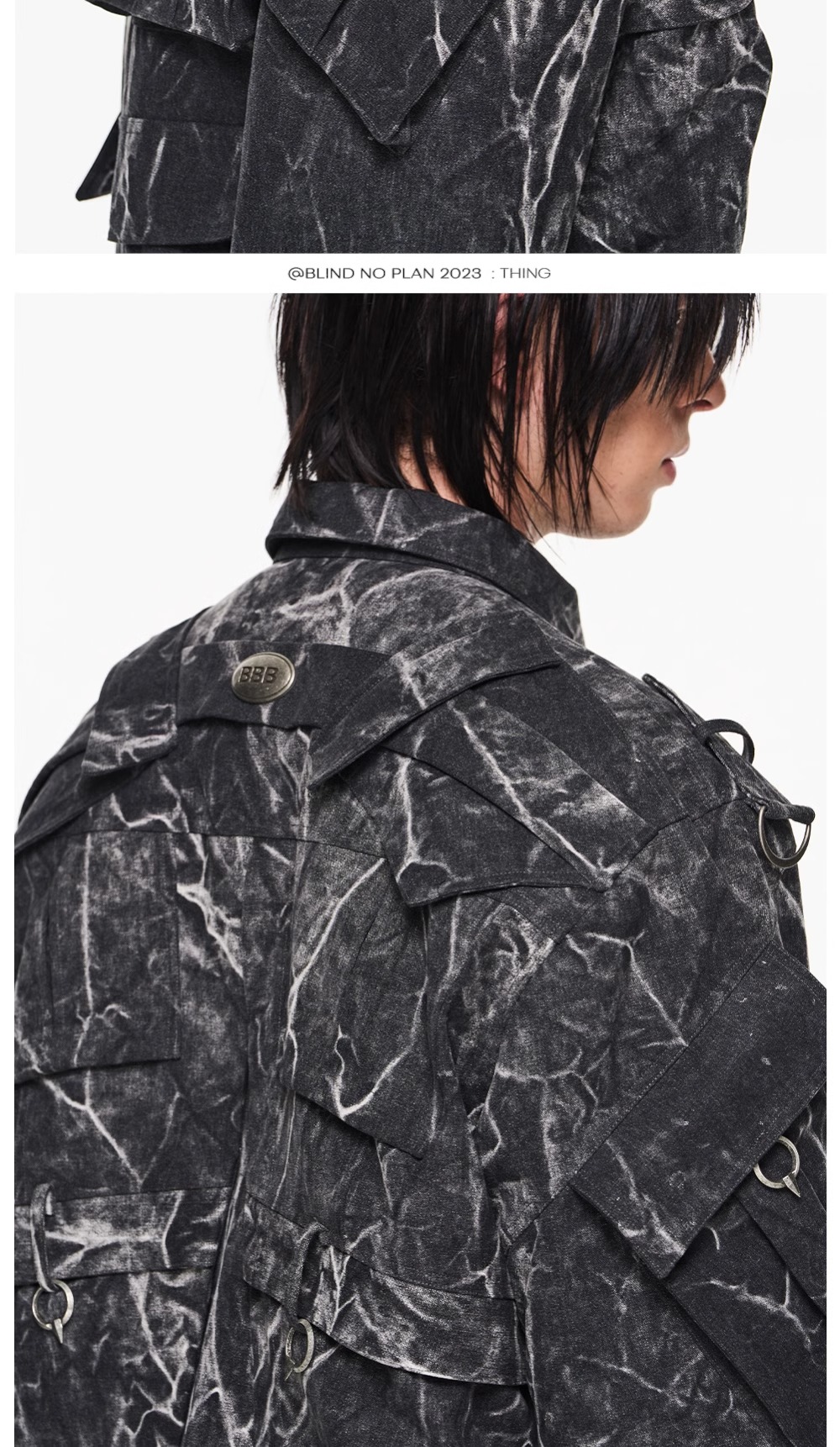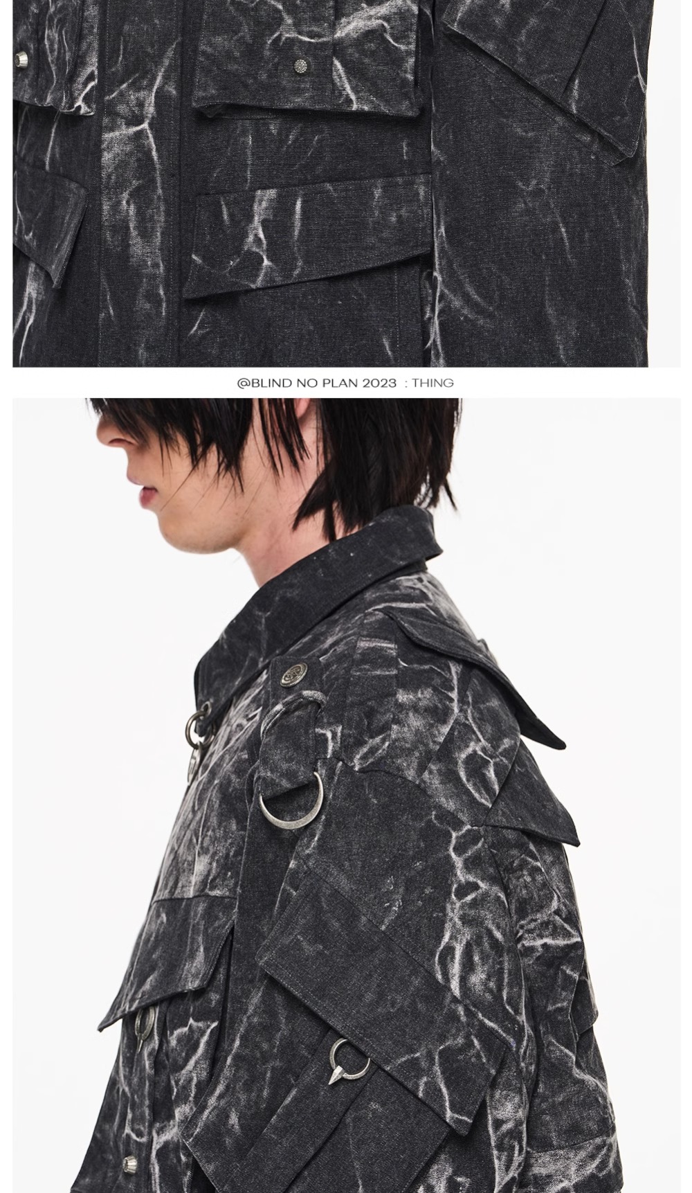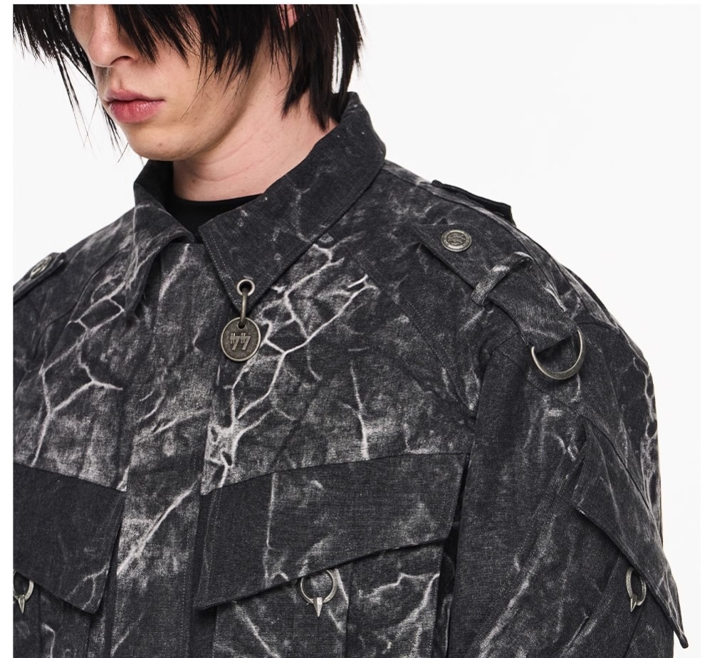 Design Details: Utilizing washed and distressed textured fabric, the garment features utility pockets, custom buckles, rings, and rivet accessories. The cuffs and front closure are secured with magic tape, and the padded lining provides warmth and comfort. The overall design exudes a highly stylized aesthetic.