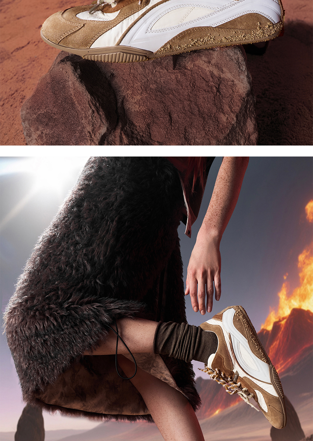 - Crafted with a mix of suede, mesh, and leather panels, this sneaker embodies a racing spirit with sleek silver stripes along the sides. The dual-layer lacing system and metallic logo add striking details. Premium suede offers high color saturation and a refined vintage finish, with a soft, velvety texture and breathable fiber structure for enhanced comfort and a lightweight fit compared to traditi