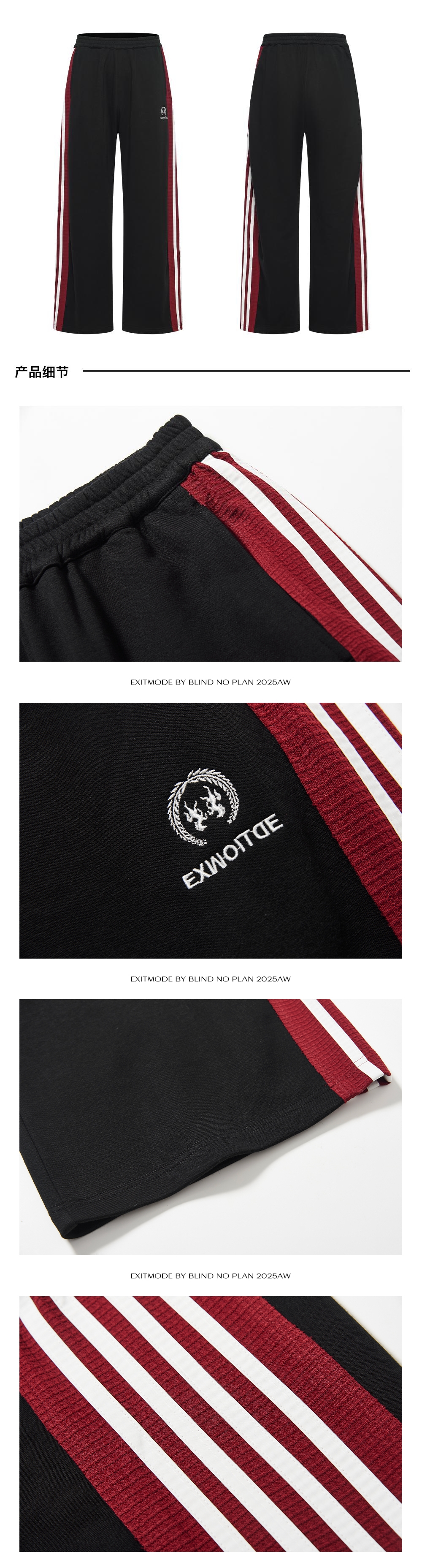 Design Details: These sweatpants feature a relaxed fit with raw-edge contrasting stripe panels. Accented with sporty embroidery details, the design combines casual comfort with layered texture and stylish highlights.