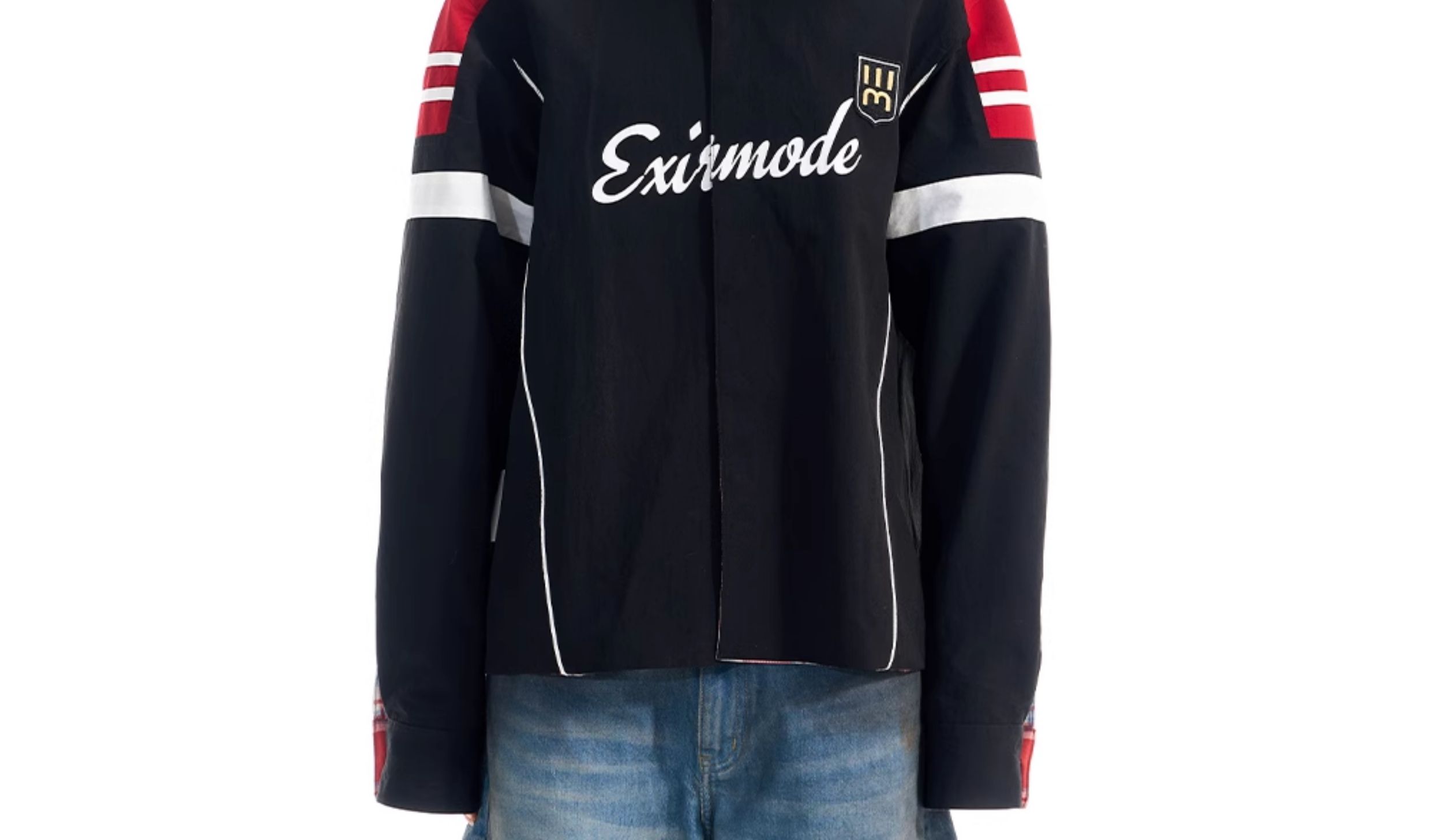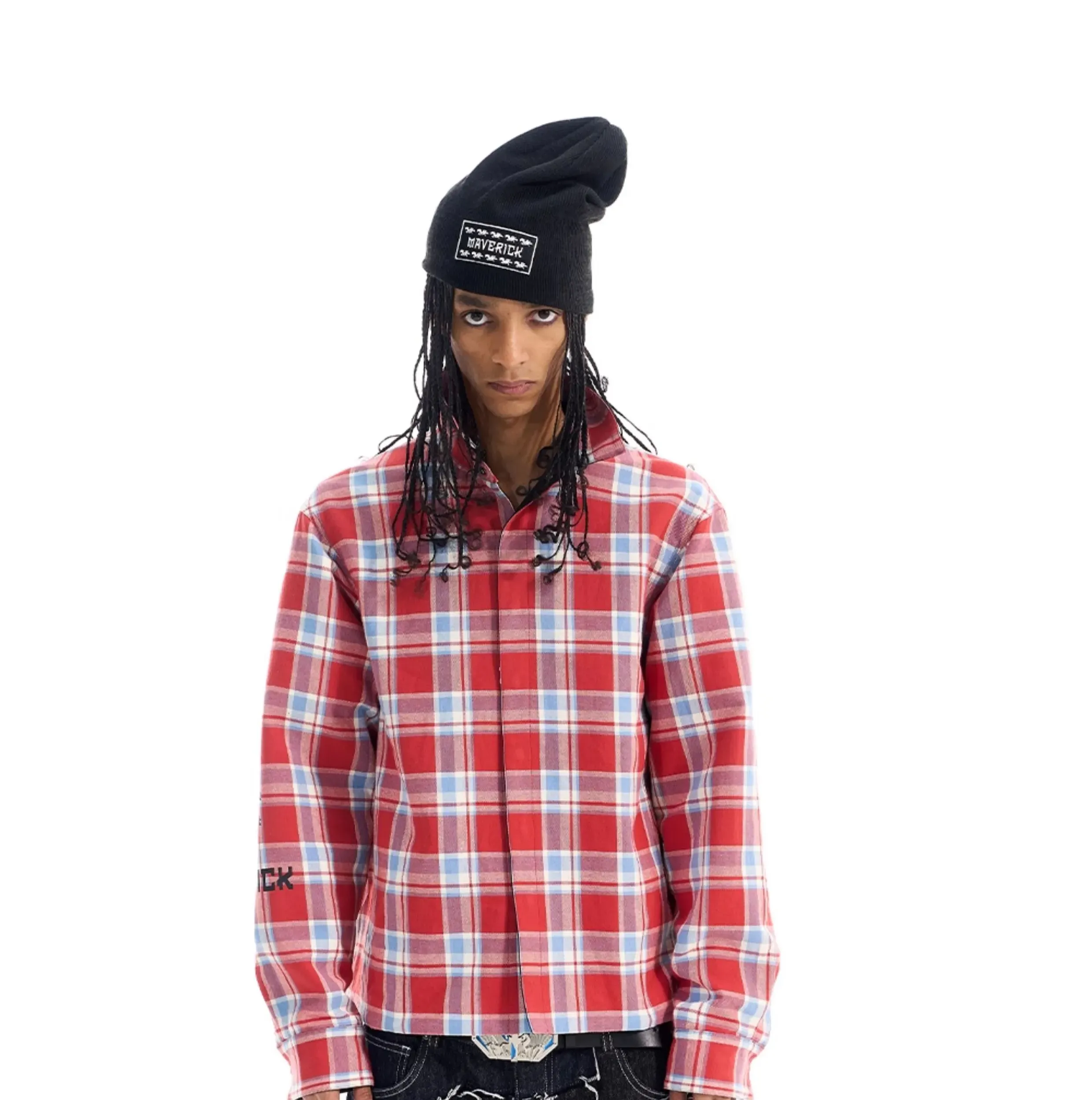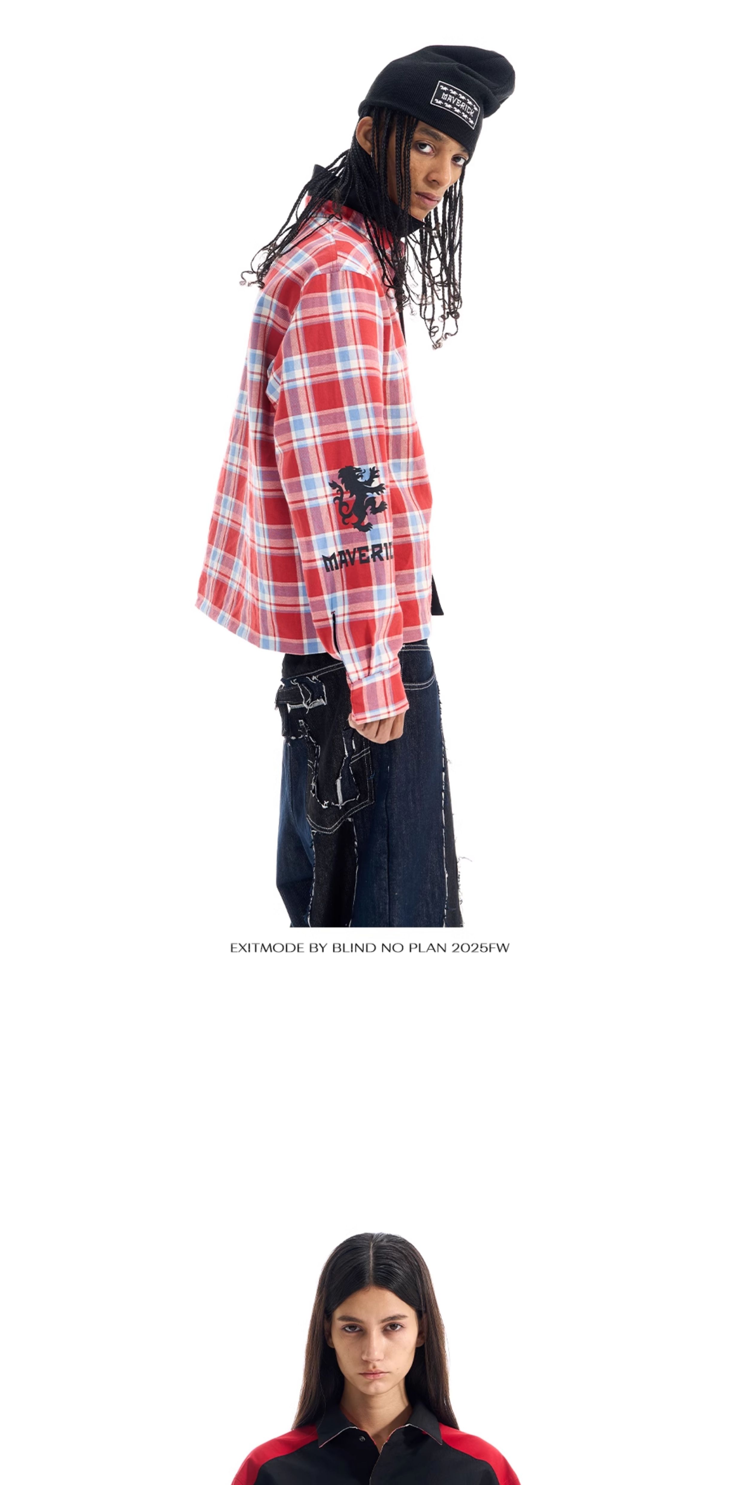 - Designed with a reversible construction, this shirt offers two distinct looks. One side features a classic plaid pattern with a screen-printed detail on a single sleeve. The reverse side presents a woven contrast sports-style patchwork design, highlighted with both screen-print and embroidery techniques for added visual richness.