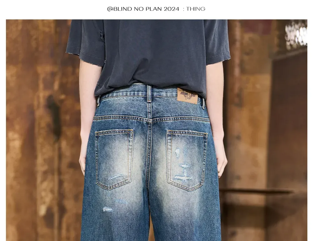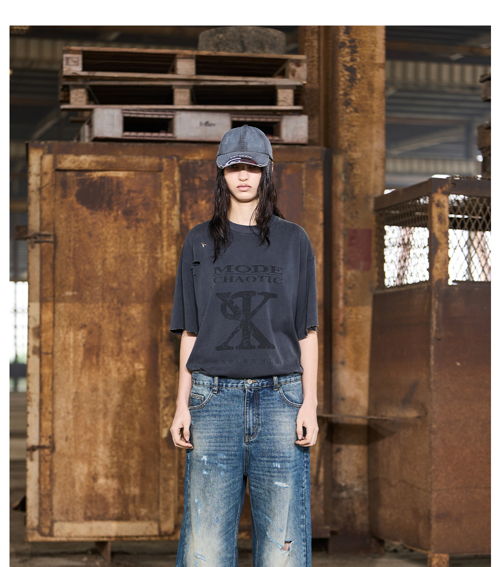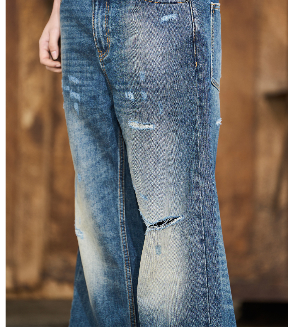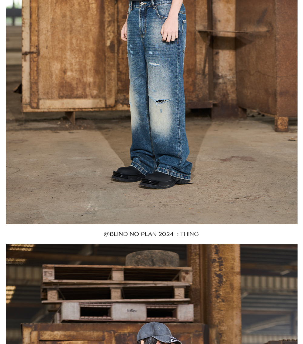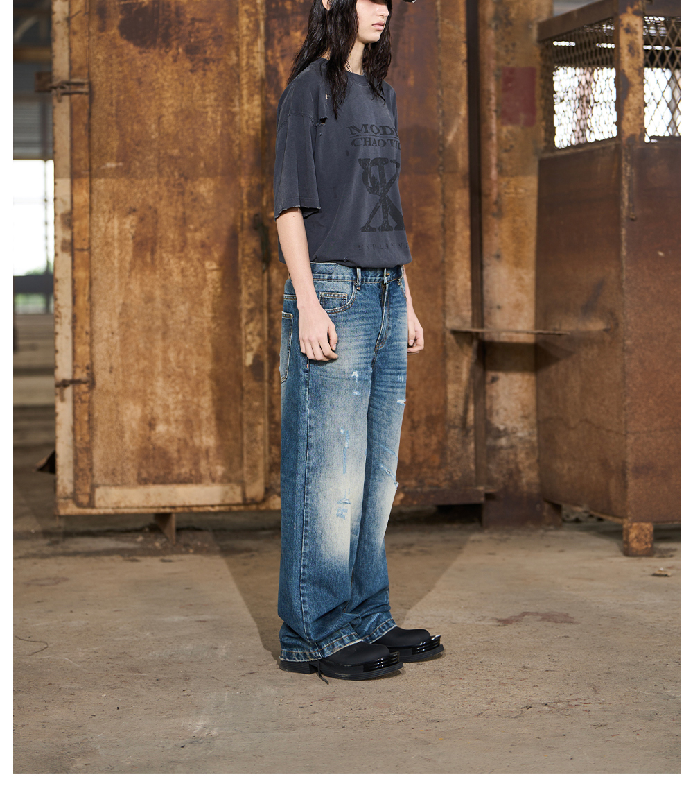 - Loose straight-leg fit with a washed distressed finish, featuring hand-ripped details and abrasions for added visual impact.