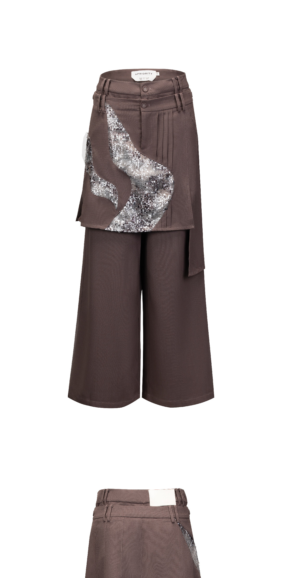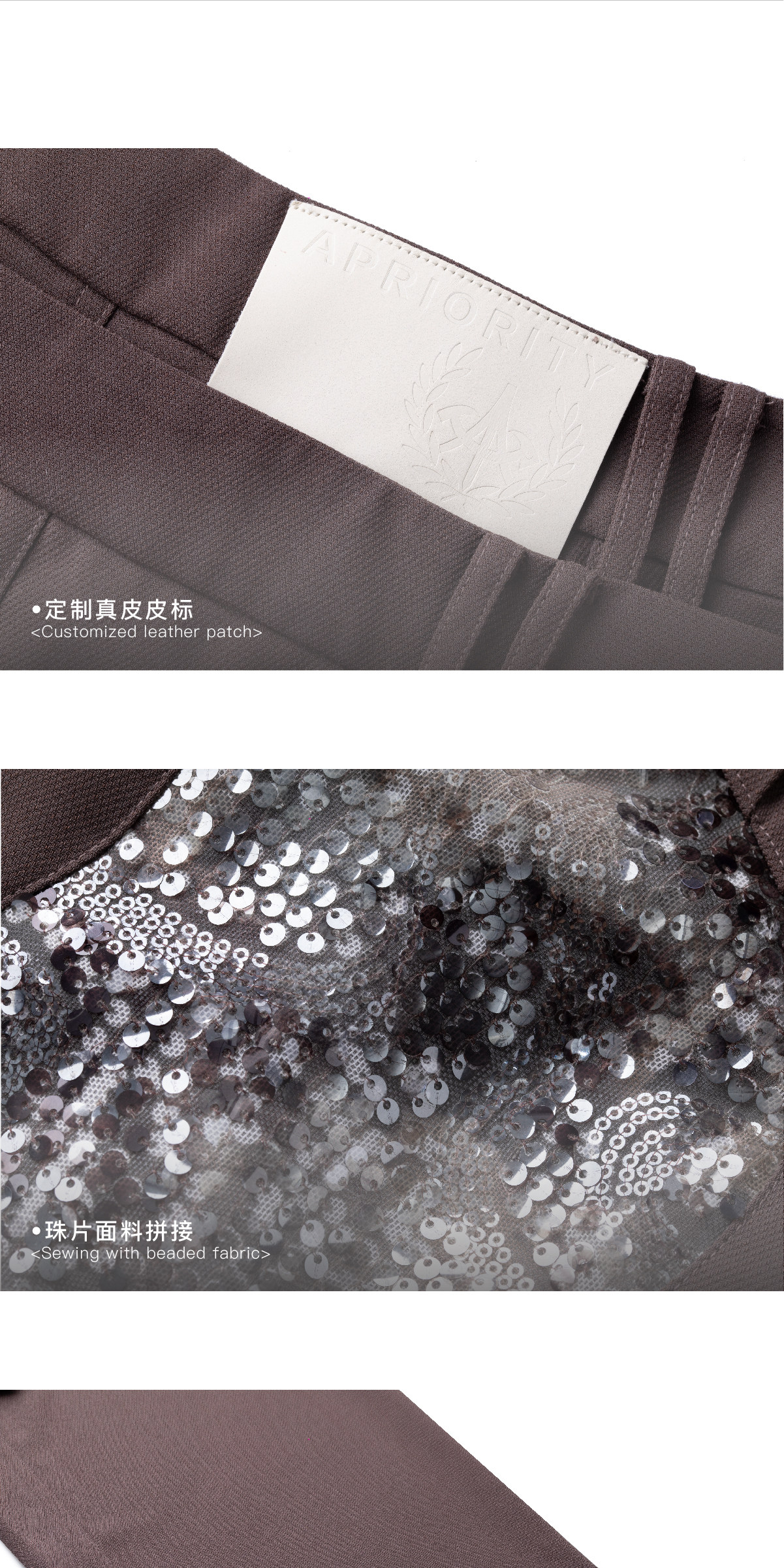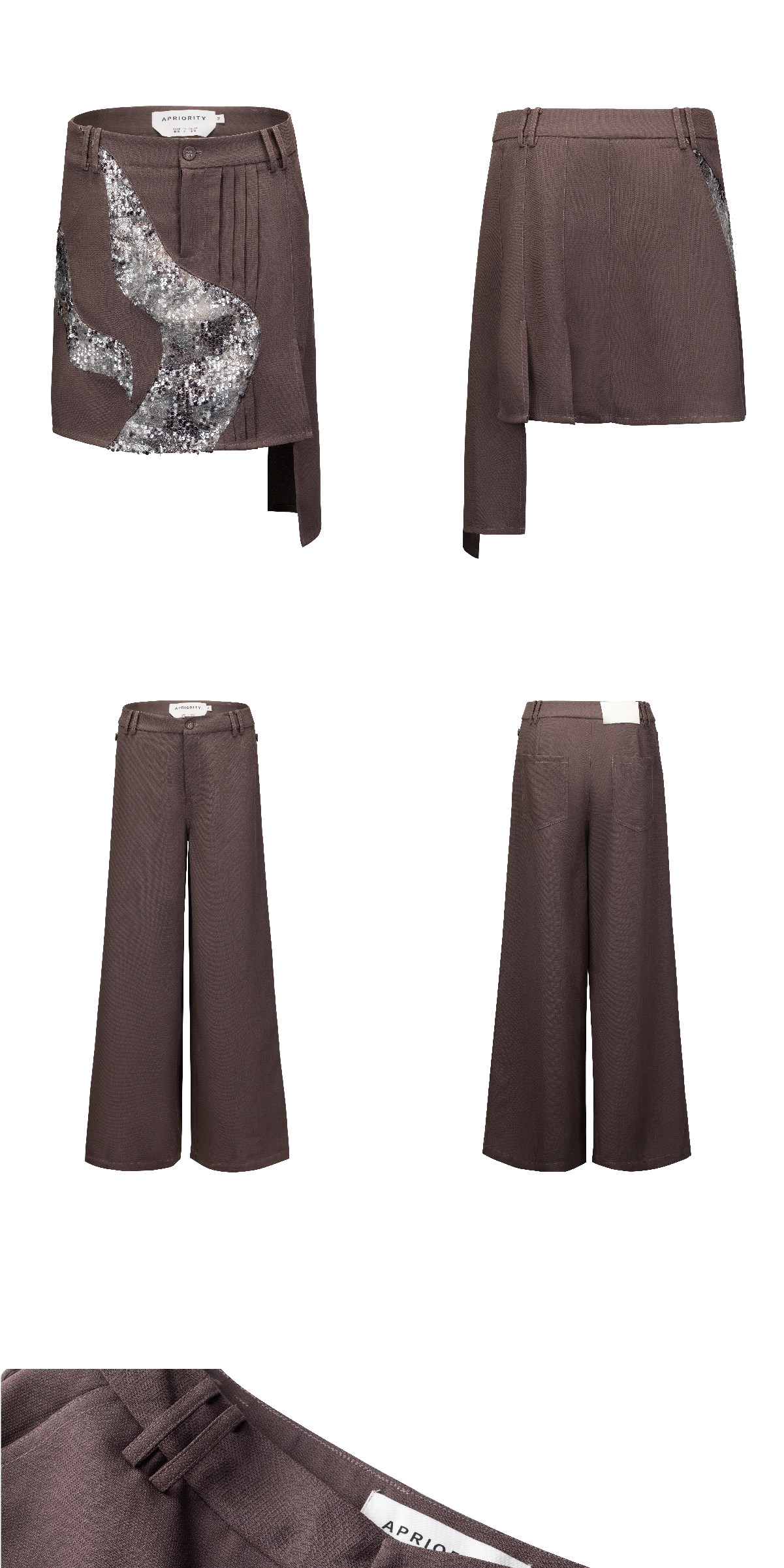 Design Details: Linen-like fabric; "River" cut graphic design. Signature sequin fabric paneling design; detachable multi-wear design; custom genuine leather patch. Asymmetric slit hem; multi-layered pleat detailing; fabric-covered buttons.