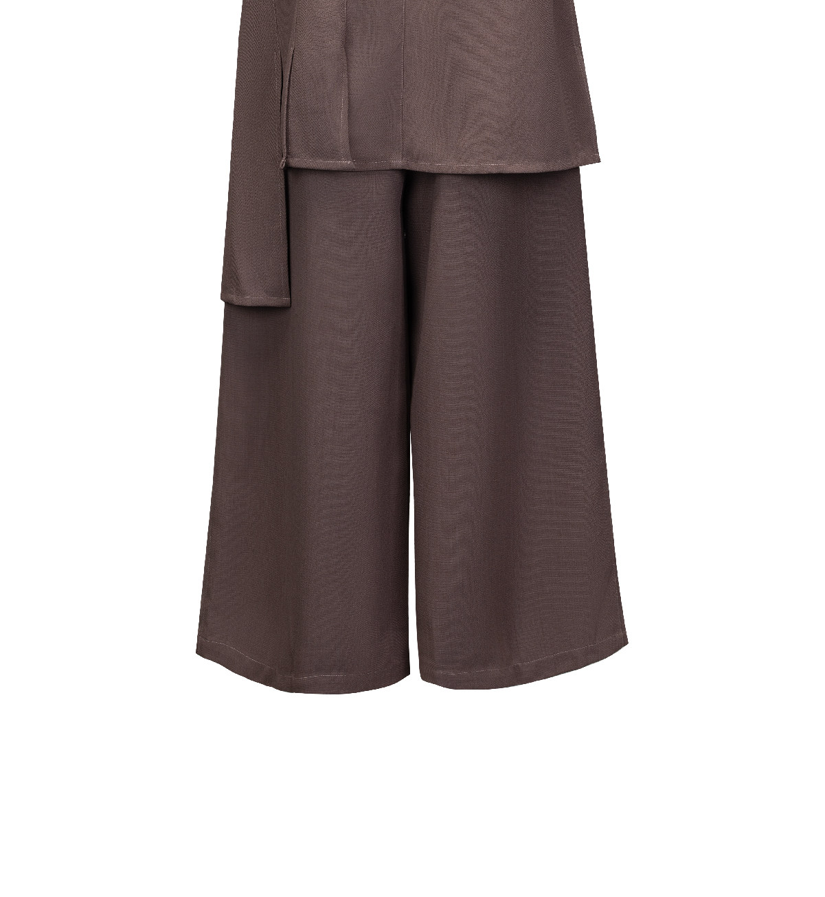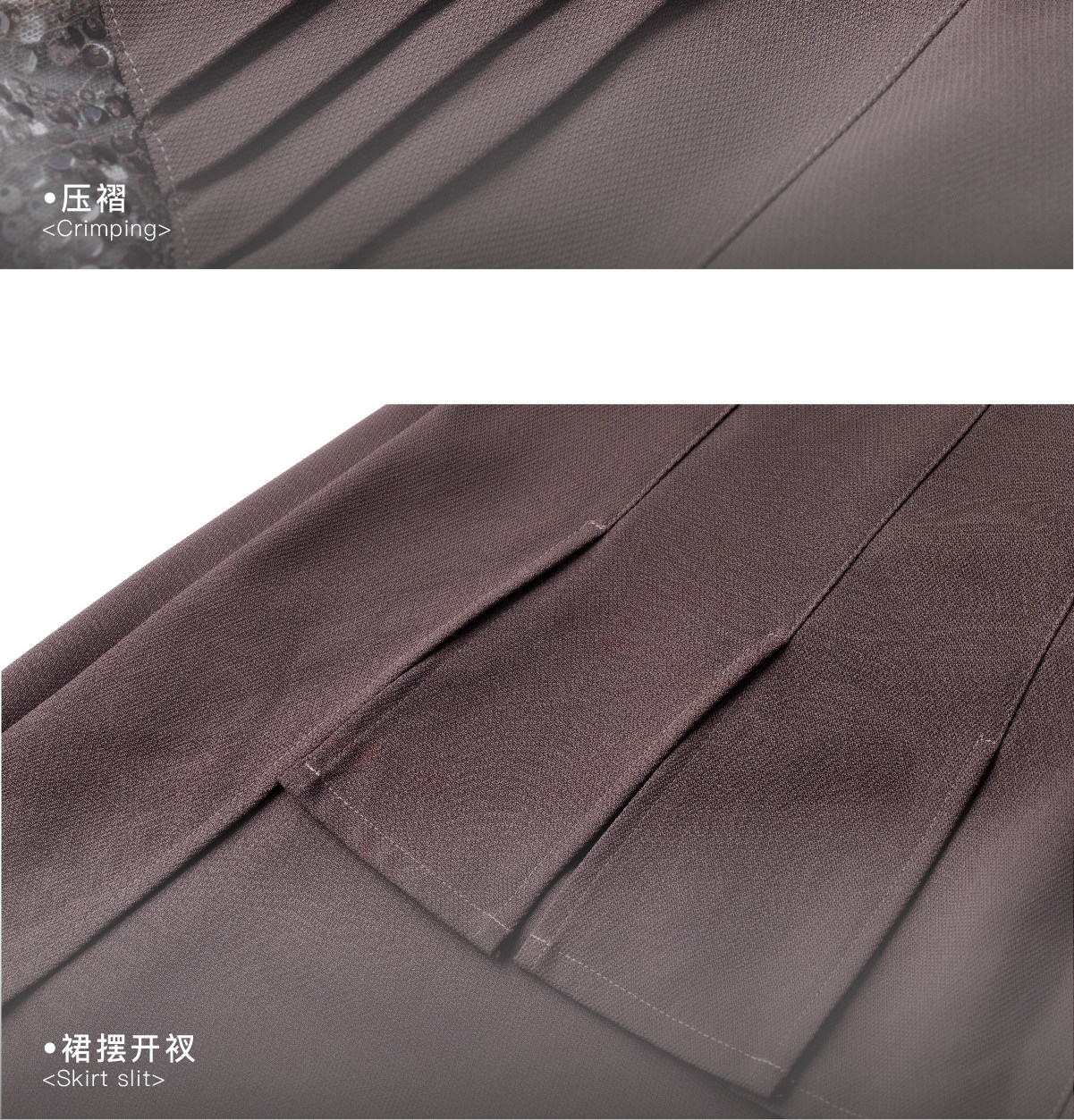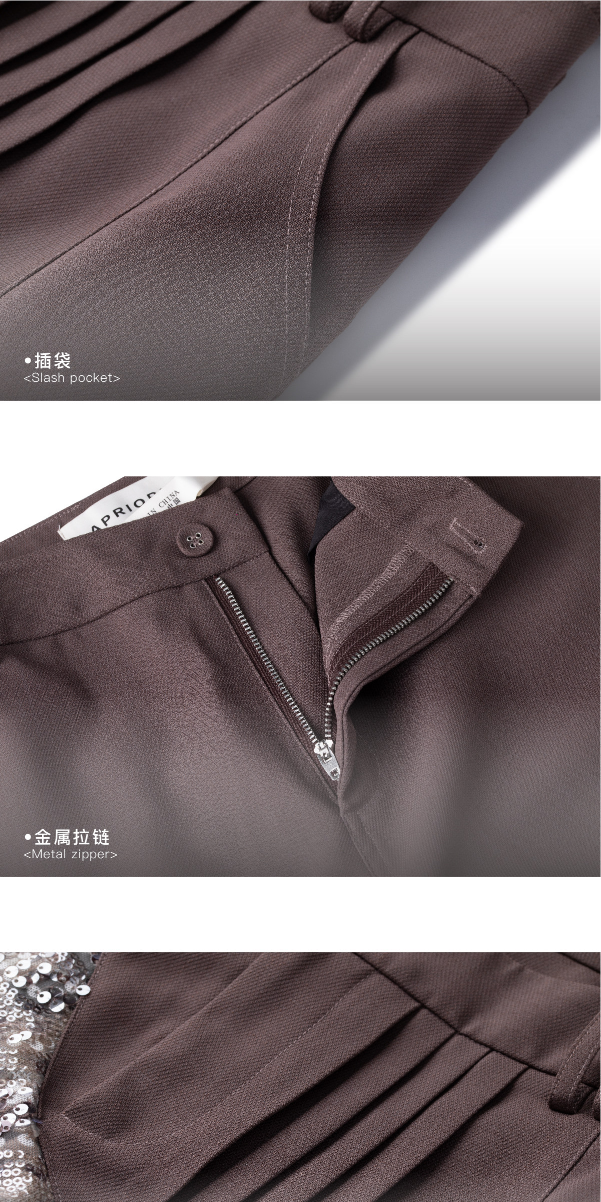 Design Details: Linen-like fabric; "River" cut graphic design. Signature sequin fabric paneling design; detachable multi-wear design; custom genuine leather patch. Asymmetric slit hem; multi-layered pleat detailing; fabric-covered buttons.