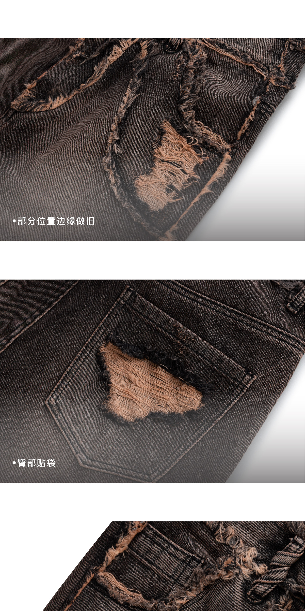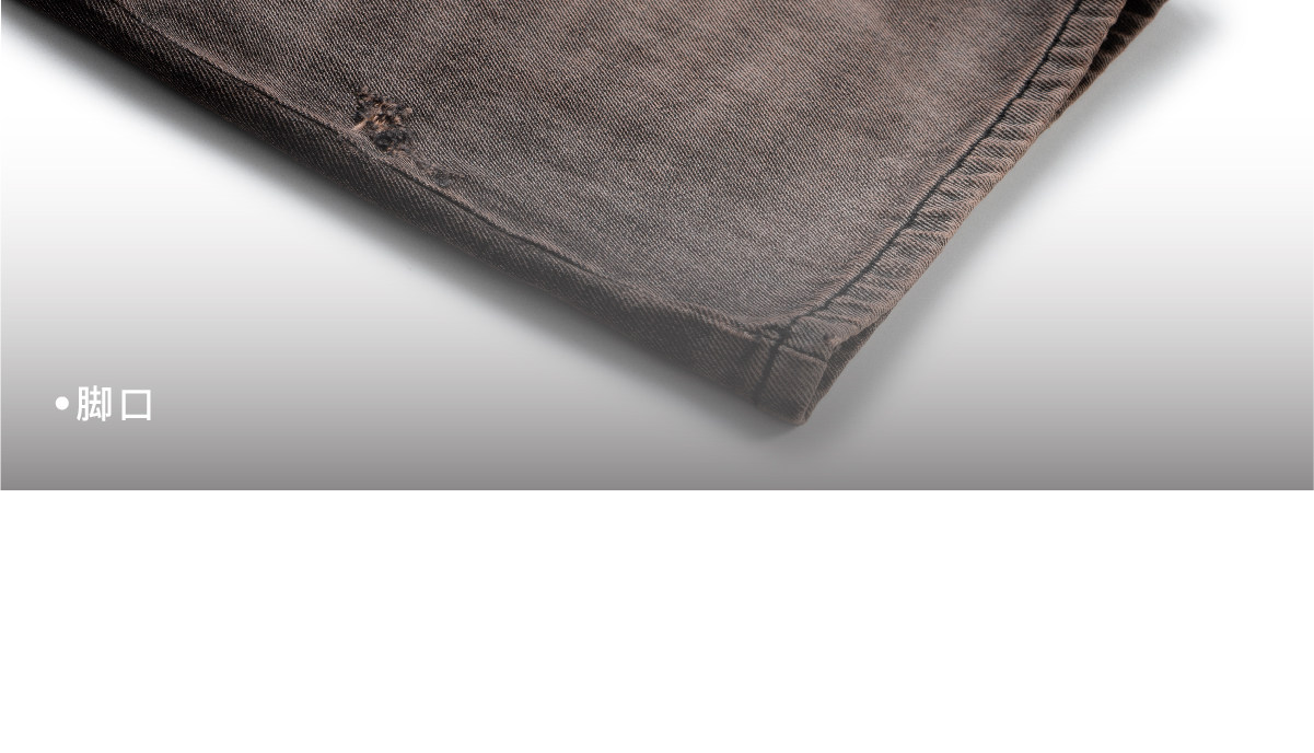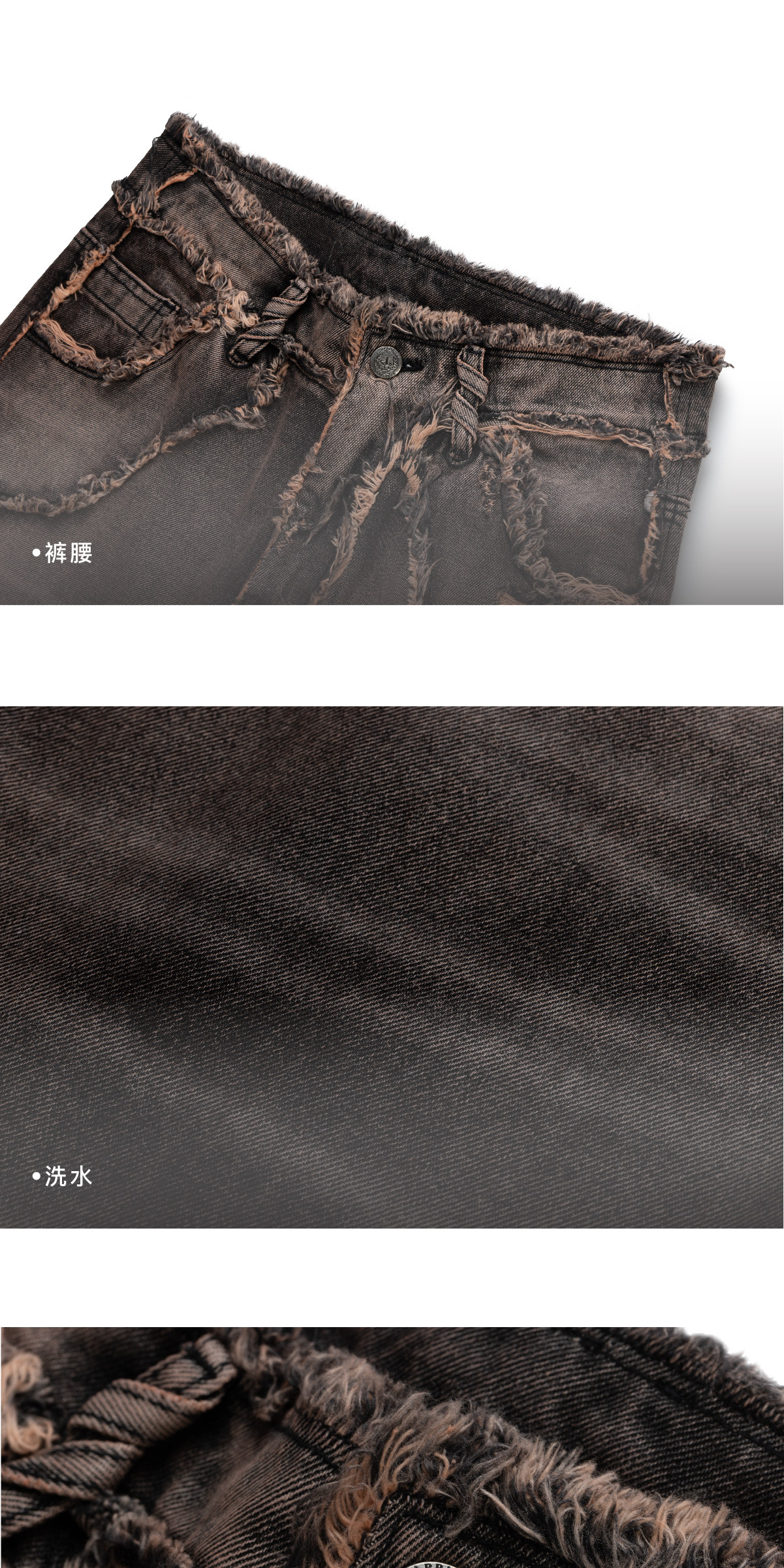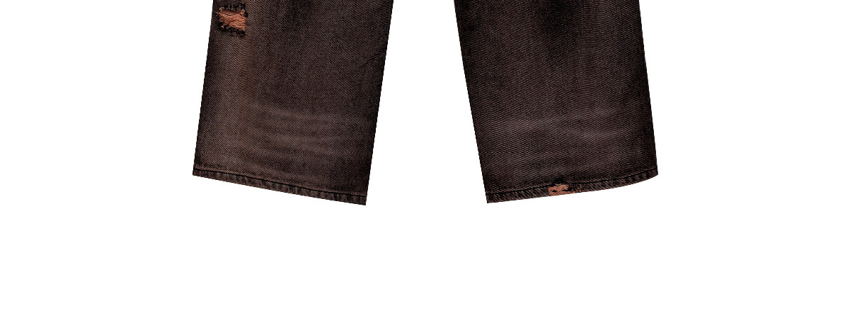 Design Details: Treated with monkey wash, layered dye, and whiskering techniques. Extensive hand-distressing throughout. Original wrapped belt loop design by designer. Horse leather patch featuring ODVAHA motif sewn on back patch pocket. Original pocket cut design. YKK metal zipper at fly. Raw-edge distressing details at selected areas.