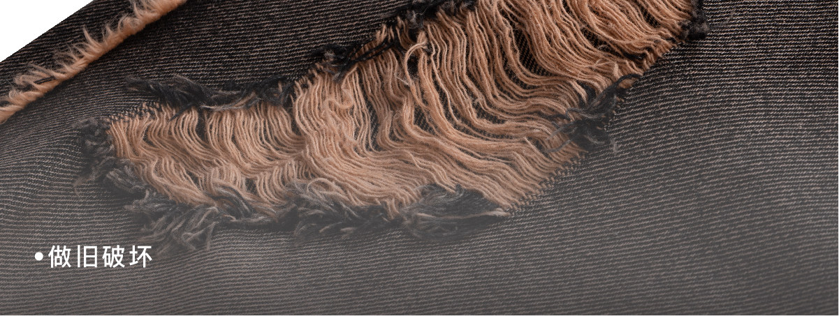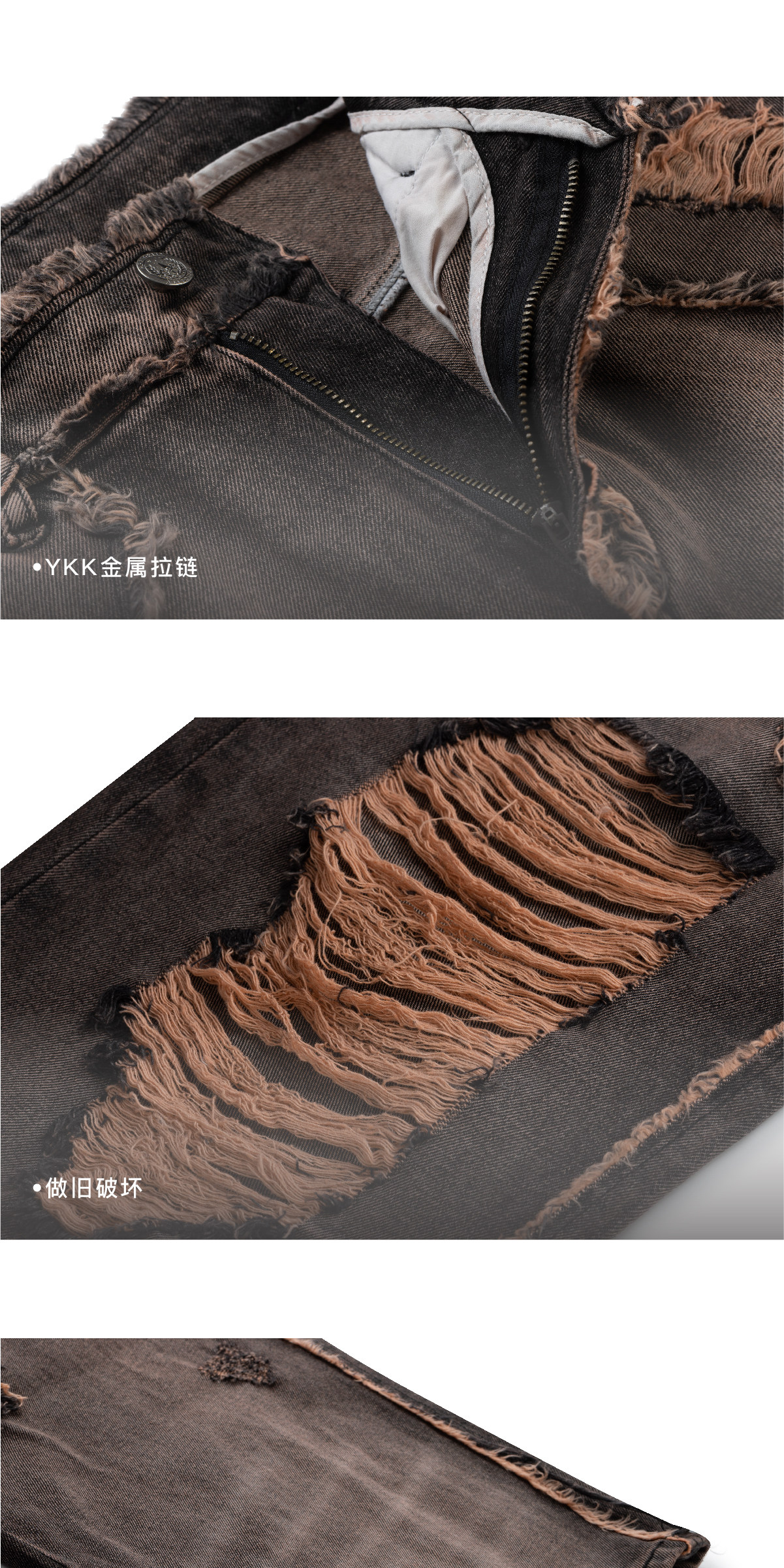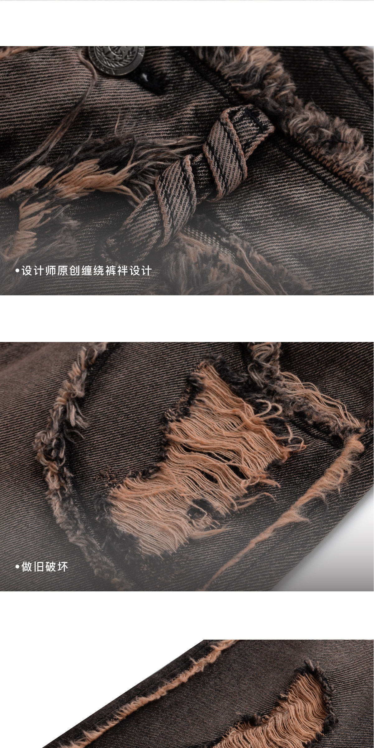 Design Details: Treated with monkey wash, layered dye, and whiskering techniques. Extensive hand-distressing throughout. Original wrapped belt loop design by designer. Horse leather patch featuring ODVAHA motif sewn on back patch pocket. Original pocket cut design. YKK metal zipper at fly. Raw-edge distressing details at selected areas.