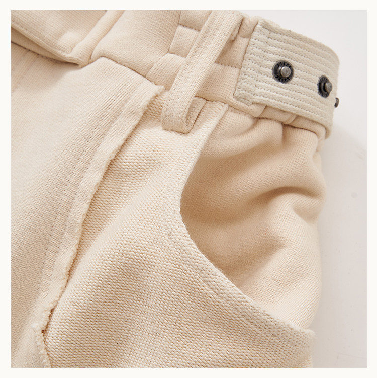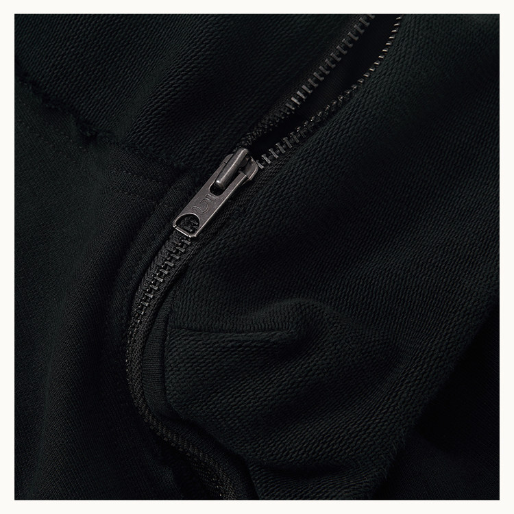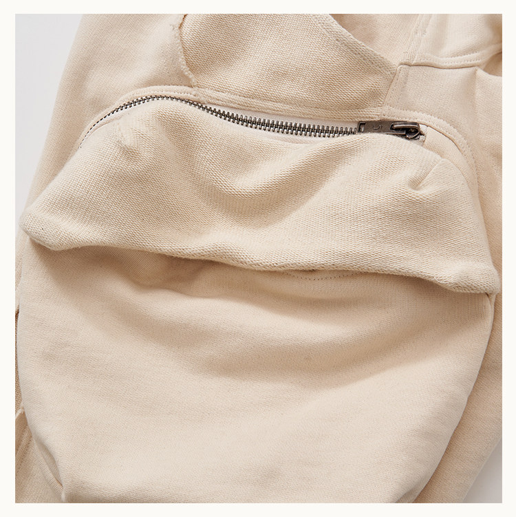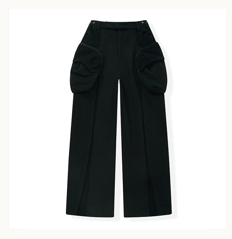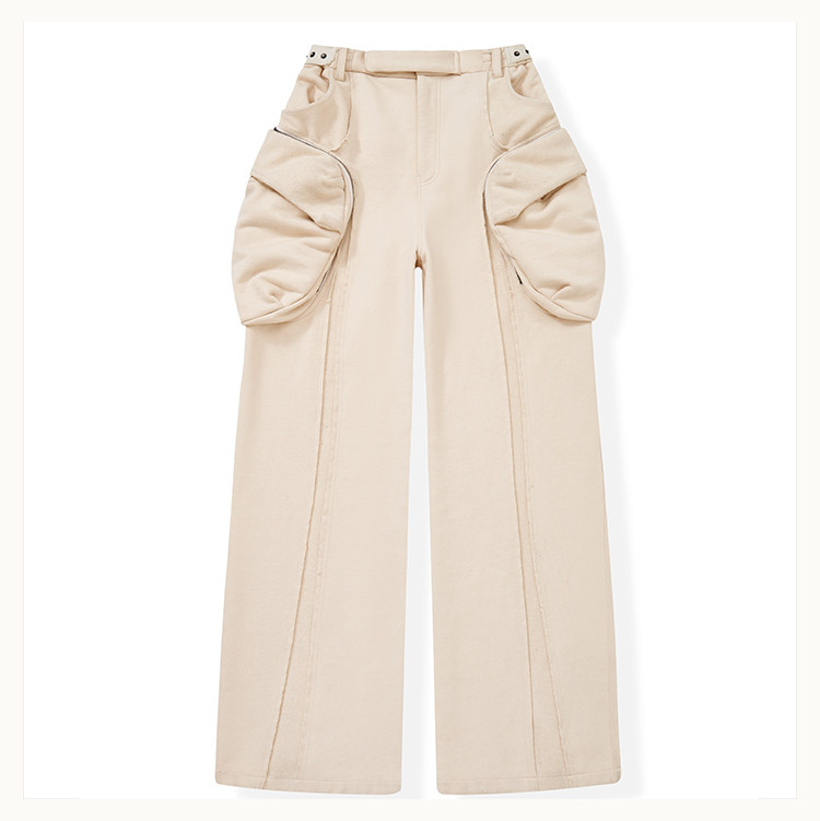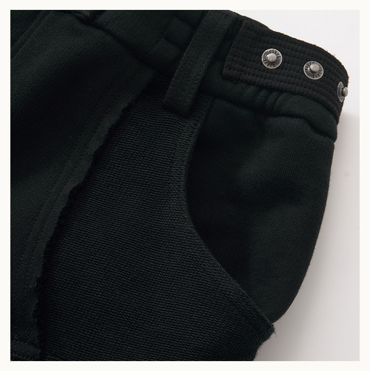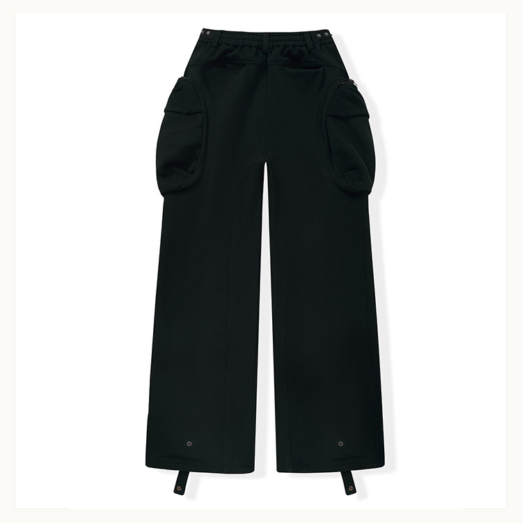 • This cargo sweatpants model is an evolution of the classic D5 silhouette, featuring a wide-leg straight cut. The exaggerated 3D "shell" pockets on both sides are designed with dual compartments: an inner zippered pocket and an outer flap secured with snap buttons. The raised panel construction enhances the three-dimensional form. Strategic paneling on the front and back creates strong visual impact. The elasticated waistband provides a snug, comfortable fit, while an anti-drag strap at the back ankle prevents the hem from touching the ground. The fabric is a high-density loopback sweatshirt material—substantial in weight and texture, providing excellent support for the intended silhouette.