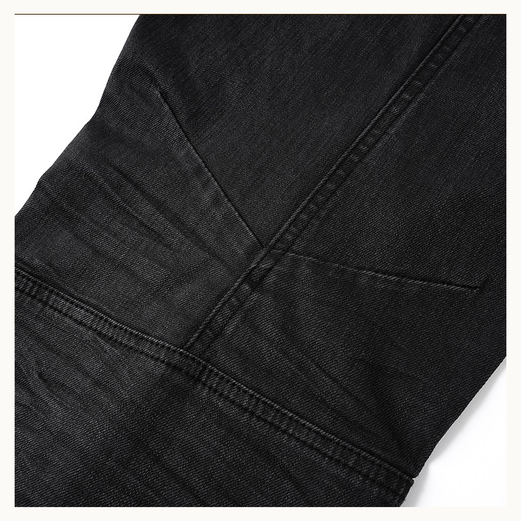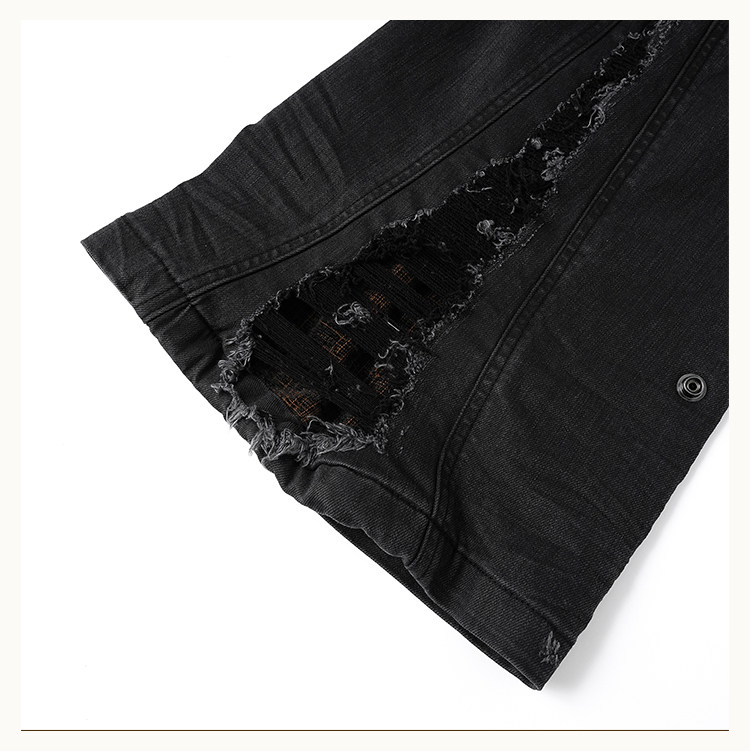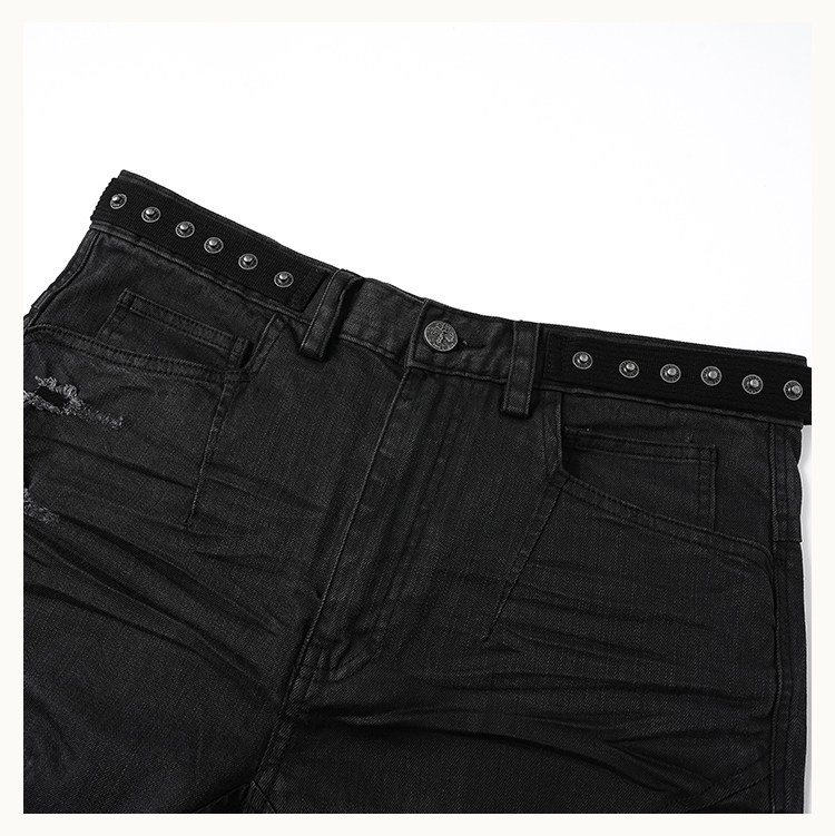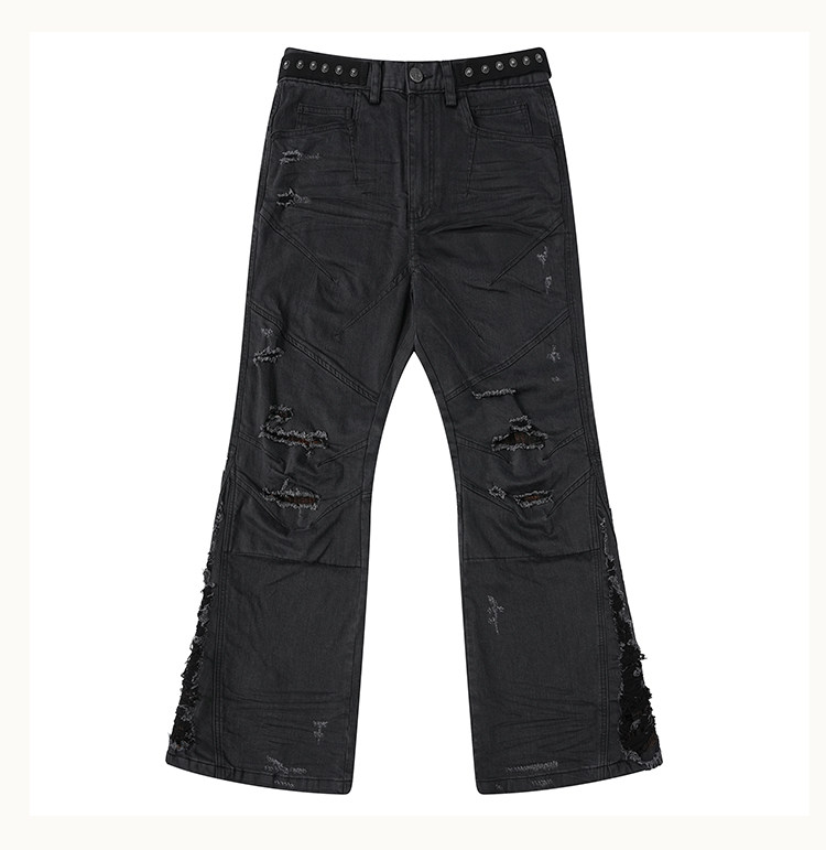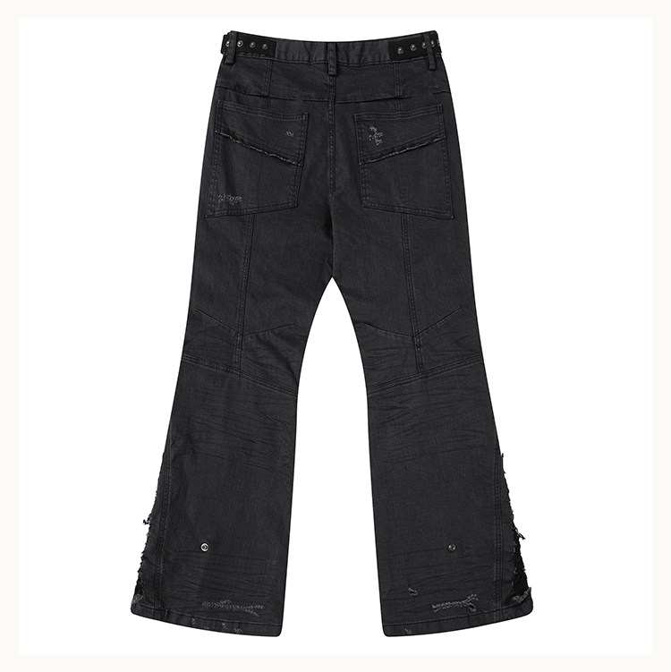 • This bootcut silhouette features a fitted yet flared leg with gathered volume at the knees. Both sides of the waist are detailed with webbing loops fully set with custom D5 snap buttons, offering decorative appeal while allowing attachment of compatible D5 outerwear accessories. The knees and side panels are contrast-patched with check fabric, and hand-applied distressing extends from the sides down to the hem, revealing hidden plaid details. An anti-drag strap is added at the back ankle.Crafted from a lightly stretch-coated black denim, the coating subtly fades during washing, creating natural whitening at stress points. Localized hand-brushing adds varied texture and visual depth. 3D whisker creasing is applied at the front and back knees to mimic natural wear folds.