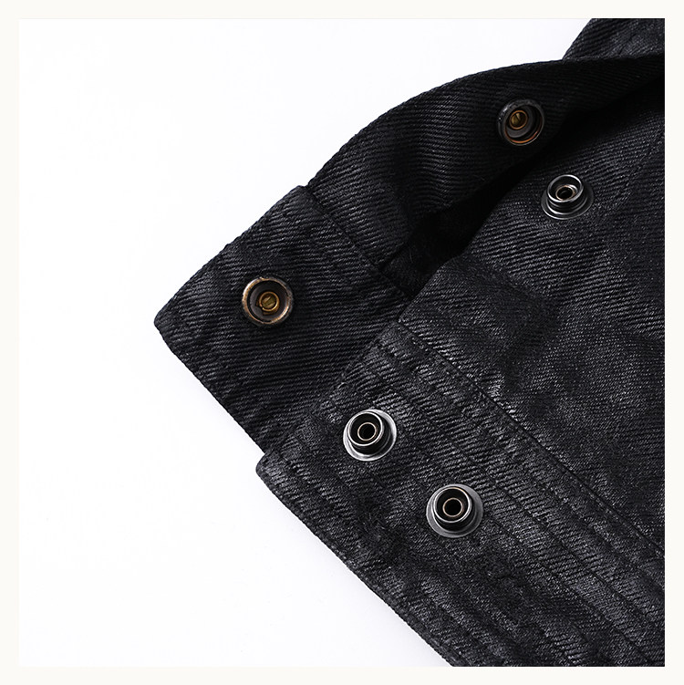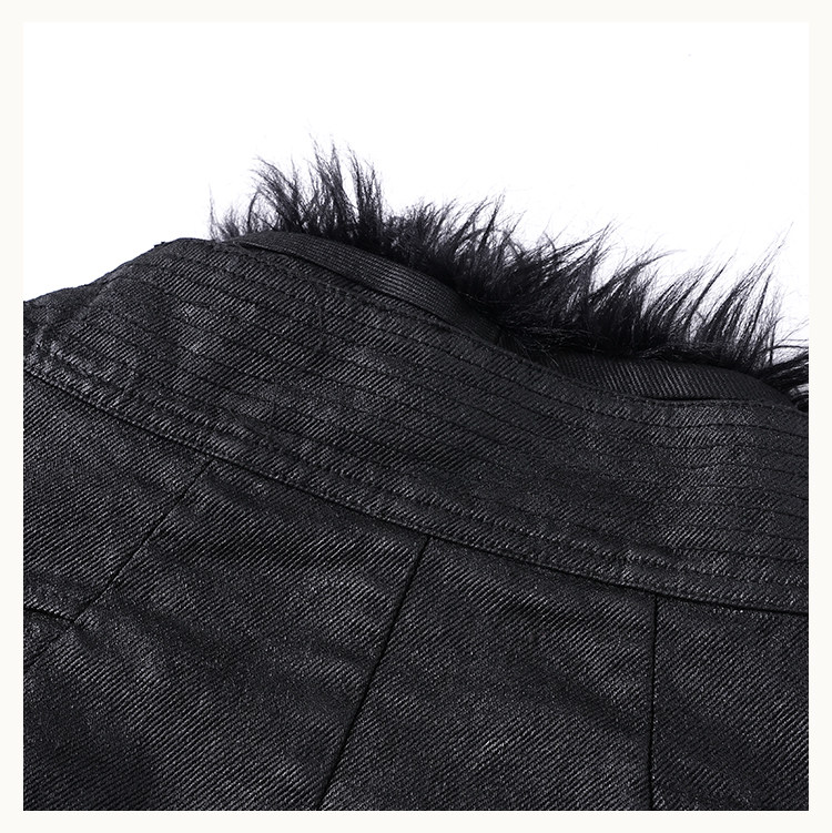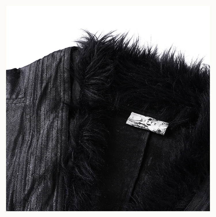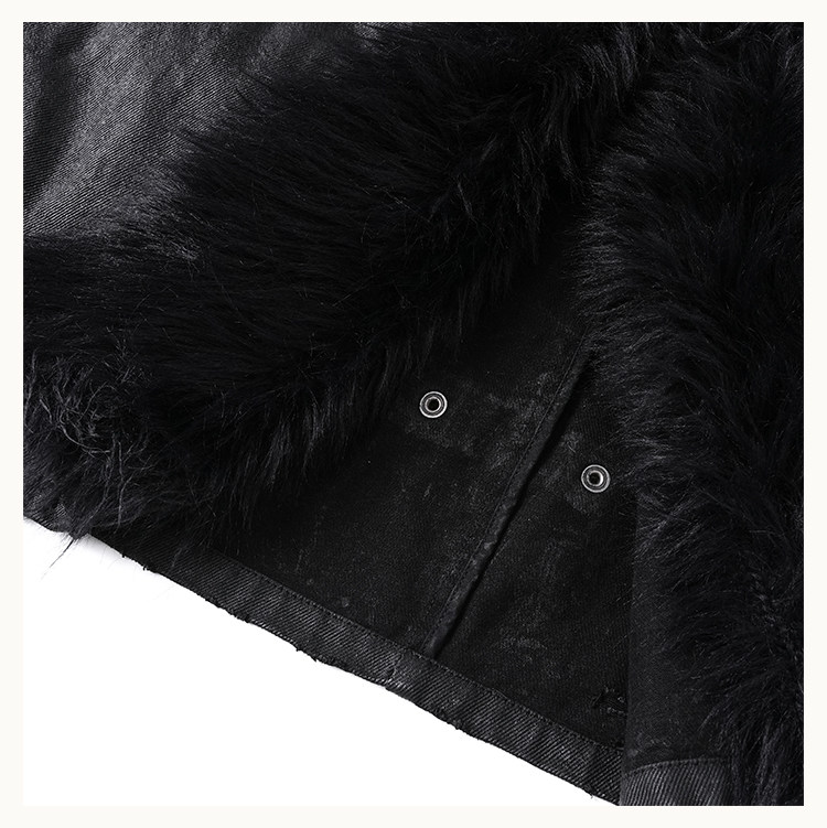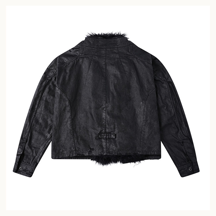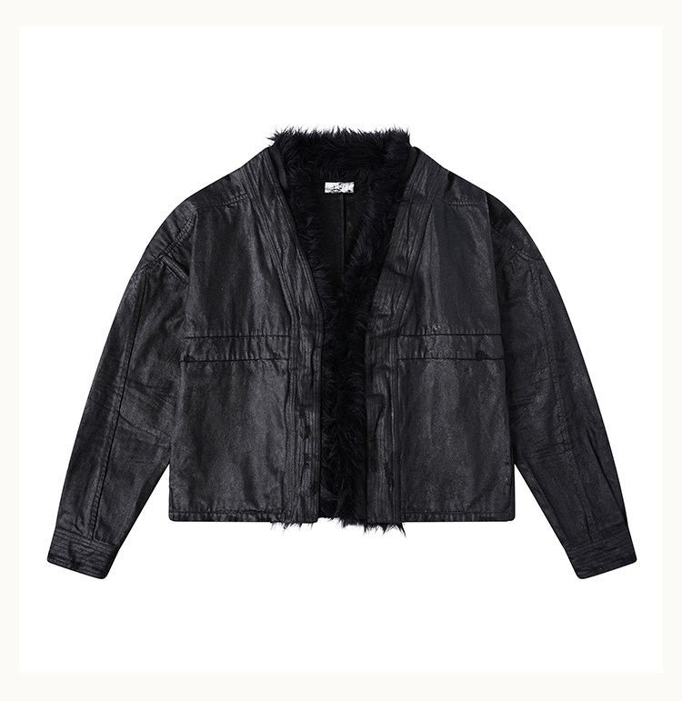 • This fur-collar jacket features a short, wide, and tailored fit. The fur collar and placket utilize a double-row snap button system for full detachability—the collar can be worn separately as a neck warmer. As a key component, it reduces cold wind intrusion and enhances neck warmth. The jacket includes concealed side pockets and snap-adjustable cuffs.It is crafted from waxed-coated black denim. After a garment wash for slight fading, the entire body is hand-waxed, resulting in a natural waxy sheen. The elbow areas feature 3D whisker creasing, and the shoulders are treated with hand-distressing. Paired with the plush fur, these elements create a striking contrast between gloss and deconstruction.