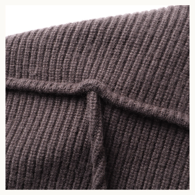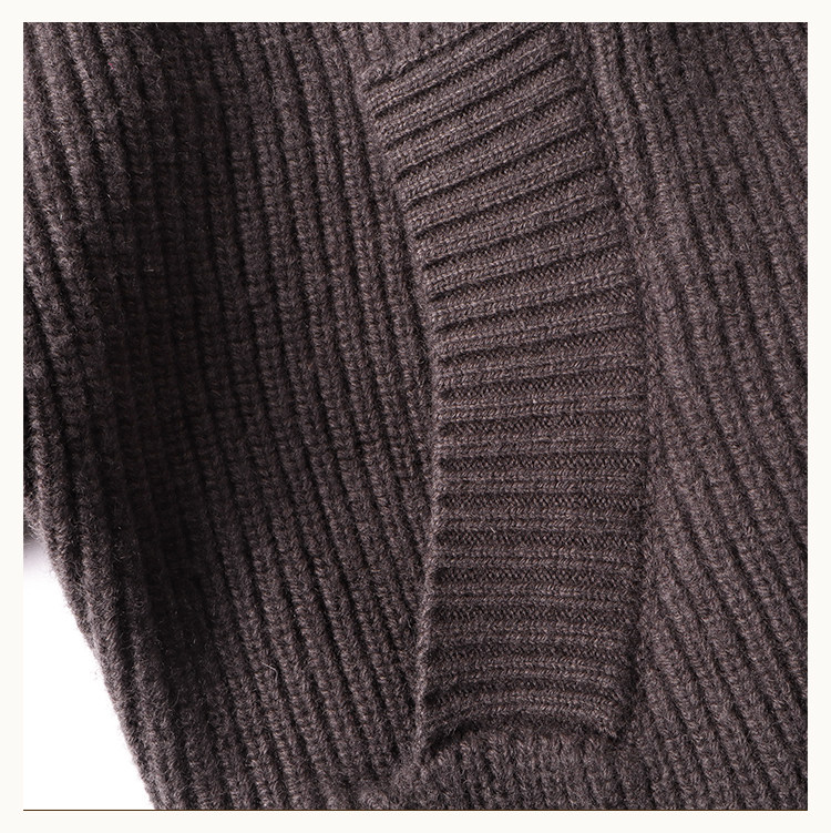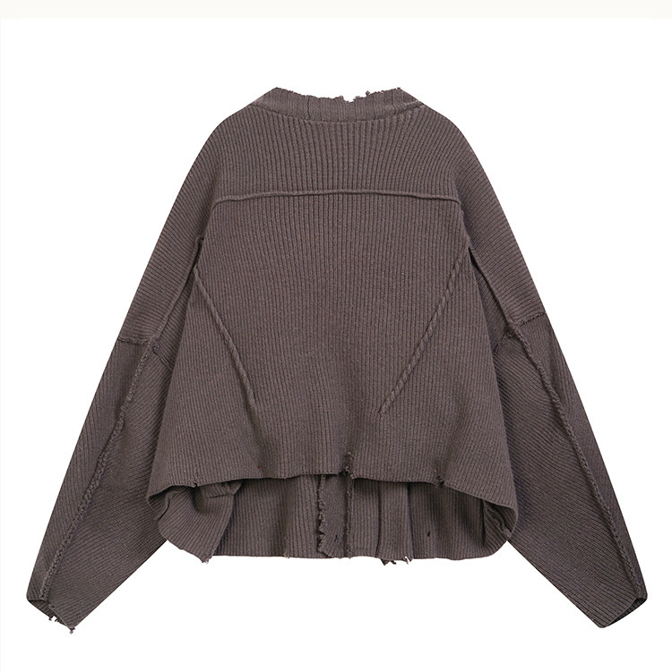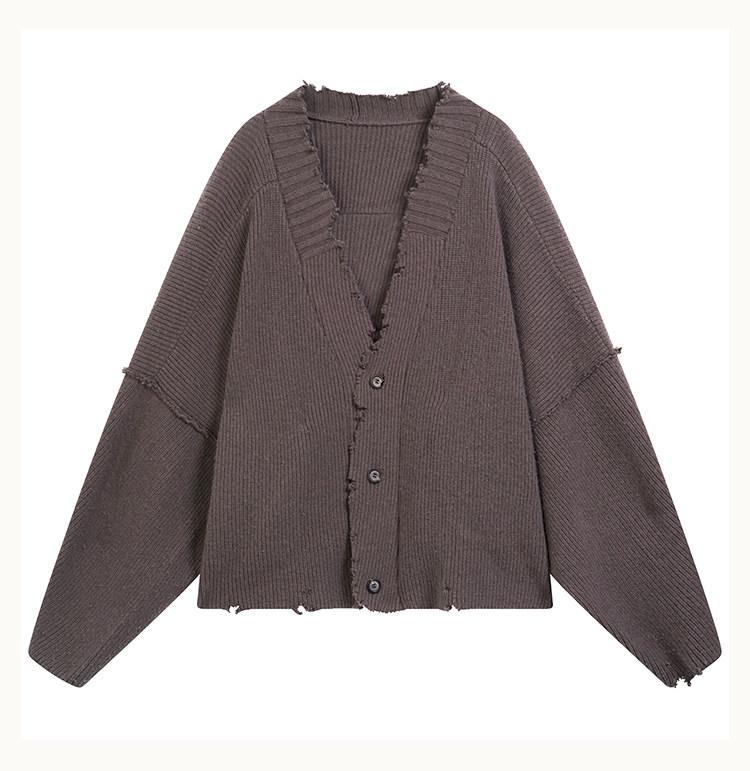 • This open‑front knit cardigan falls to the hips in an ultra‑relaxed silhouette. The exaggerated scythe‑sleeve construction extends into a continuous raglan back, with broad ribbed panels分段 along the placket and hand‑distressed detailing that enhances its post‑apocalyptic texture. Both sides feature custom D5 horn buttons that allow cross‑over fastening for versatile styling, along with side pockets.Made from custom‑dyed pure wool yarn in a color inspired by the brown‑tone of Inuit reindeer hide, visually merging with natural elements.
