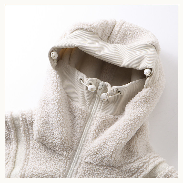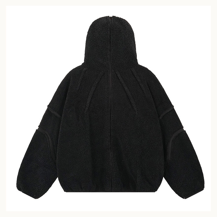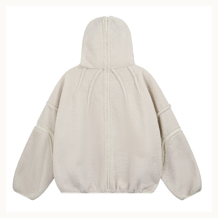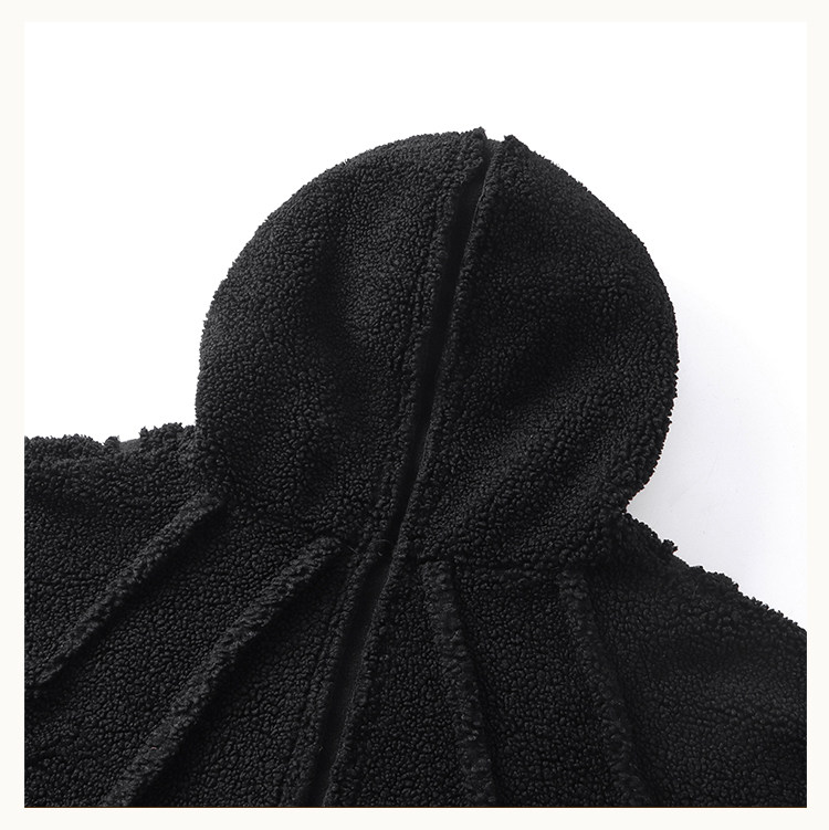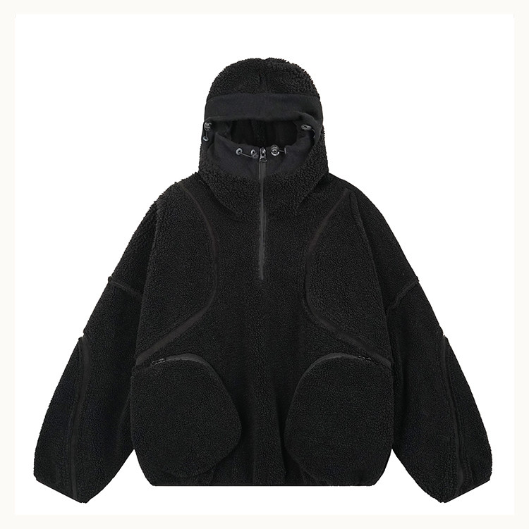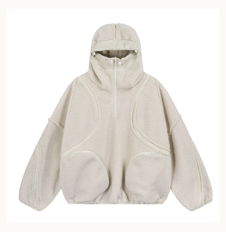 • This piece refines the classic D5 loose boxy fit, featuring a double‑ring ribbed hood opening for an armor‑like wrap. The front uses a D5 custom YKK nylon half‑zip for wind protection and distinct style. The front pockets draw inspiration from the architectural origin of Inuit igloo structures, echoed through raw edges and pressed pleats. Made from double‑faced sherpa fleece: a large‑grain wool texture on the face and a fine, soft pile inside—heavyweight, structured, and built for cold weather. The cuffs and hem are finished with a high‑density, high‑stretch knit binding for reinforcement and a clean, tapered fit.
