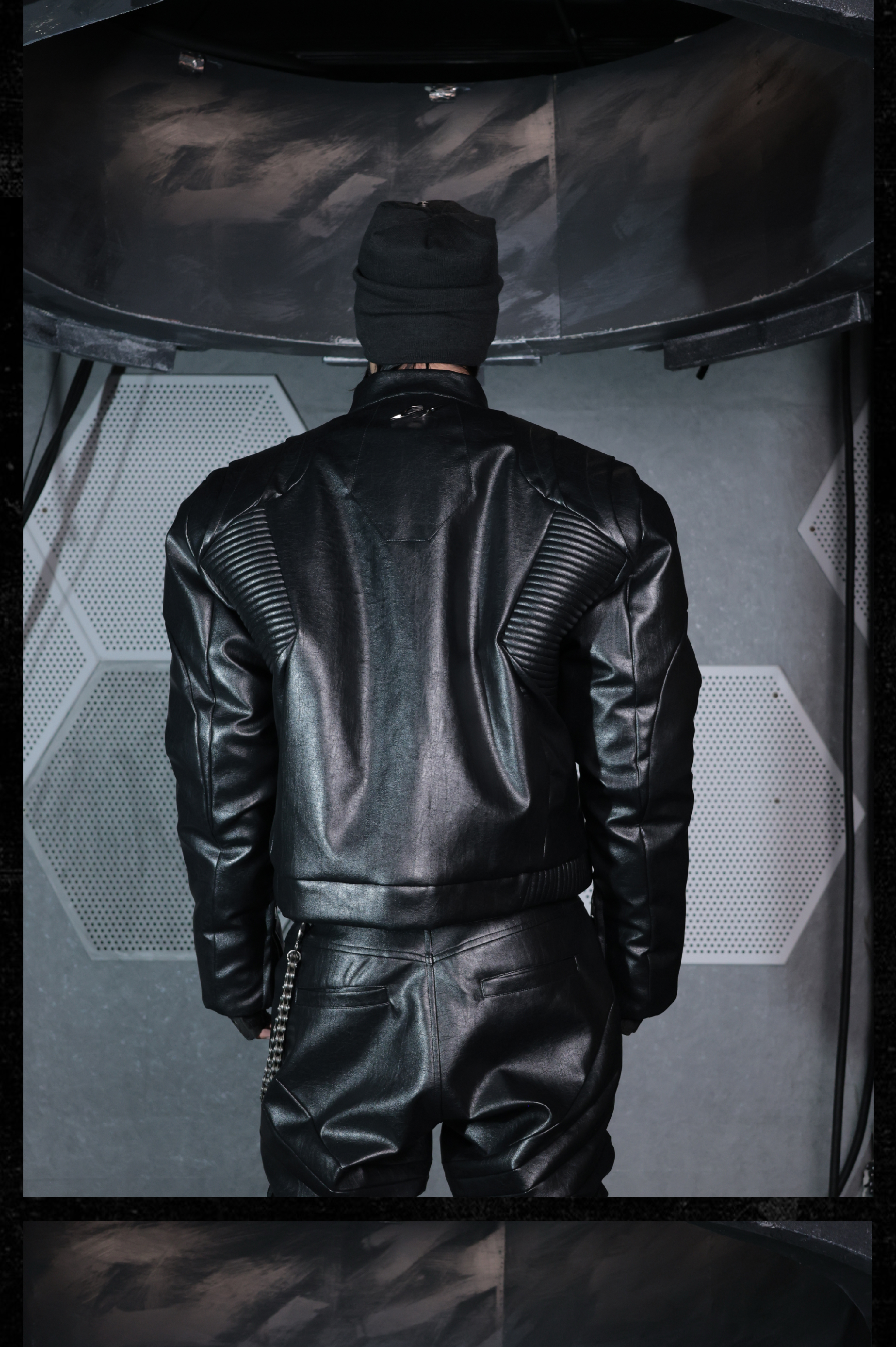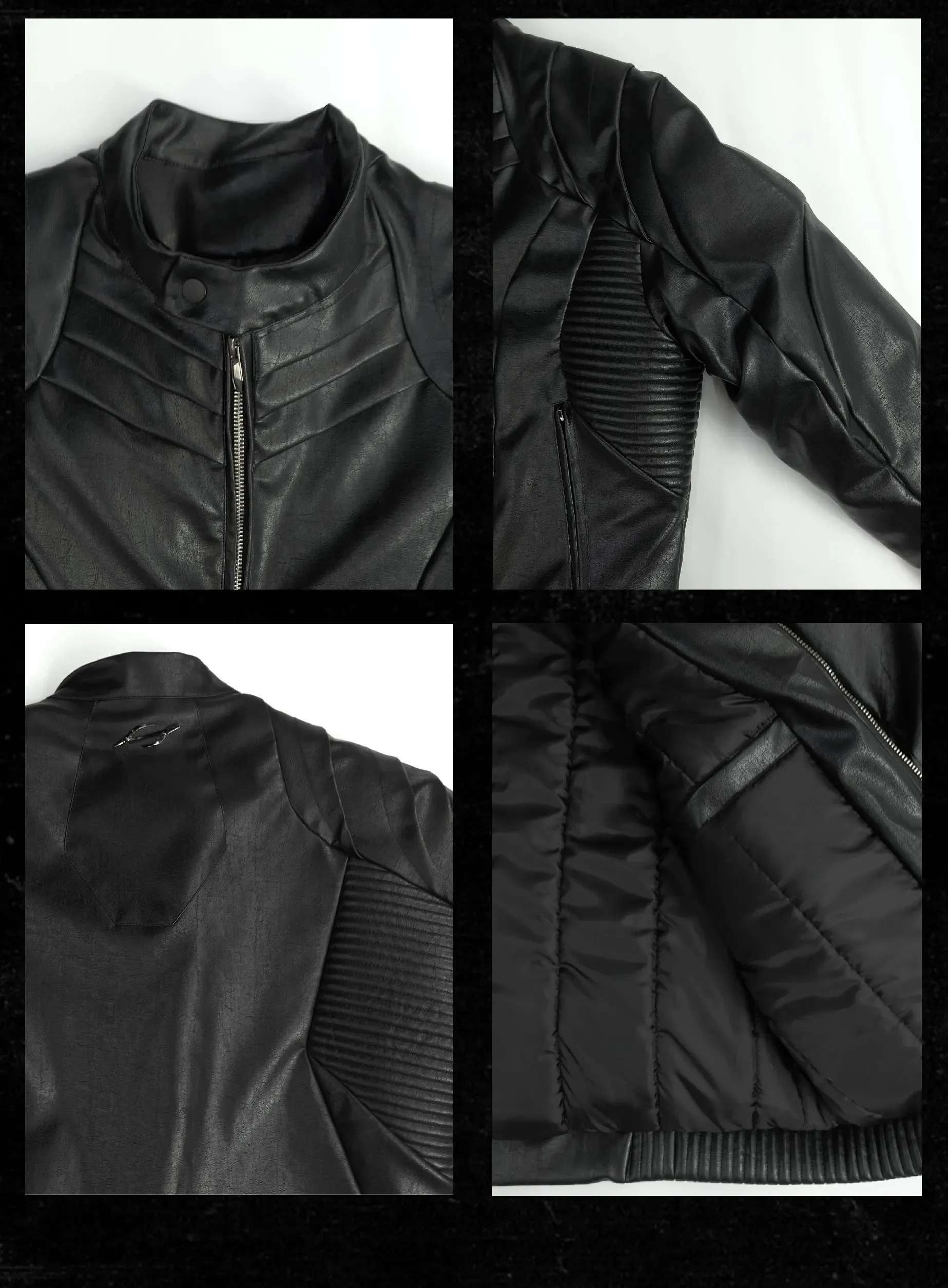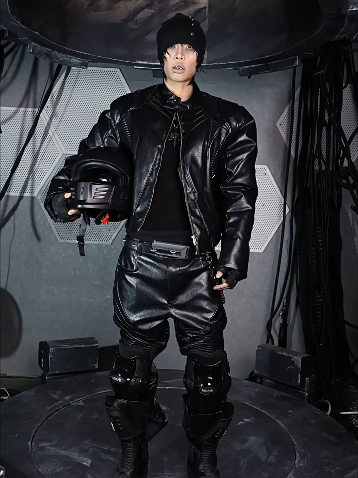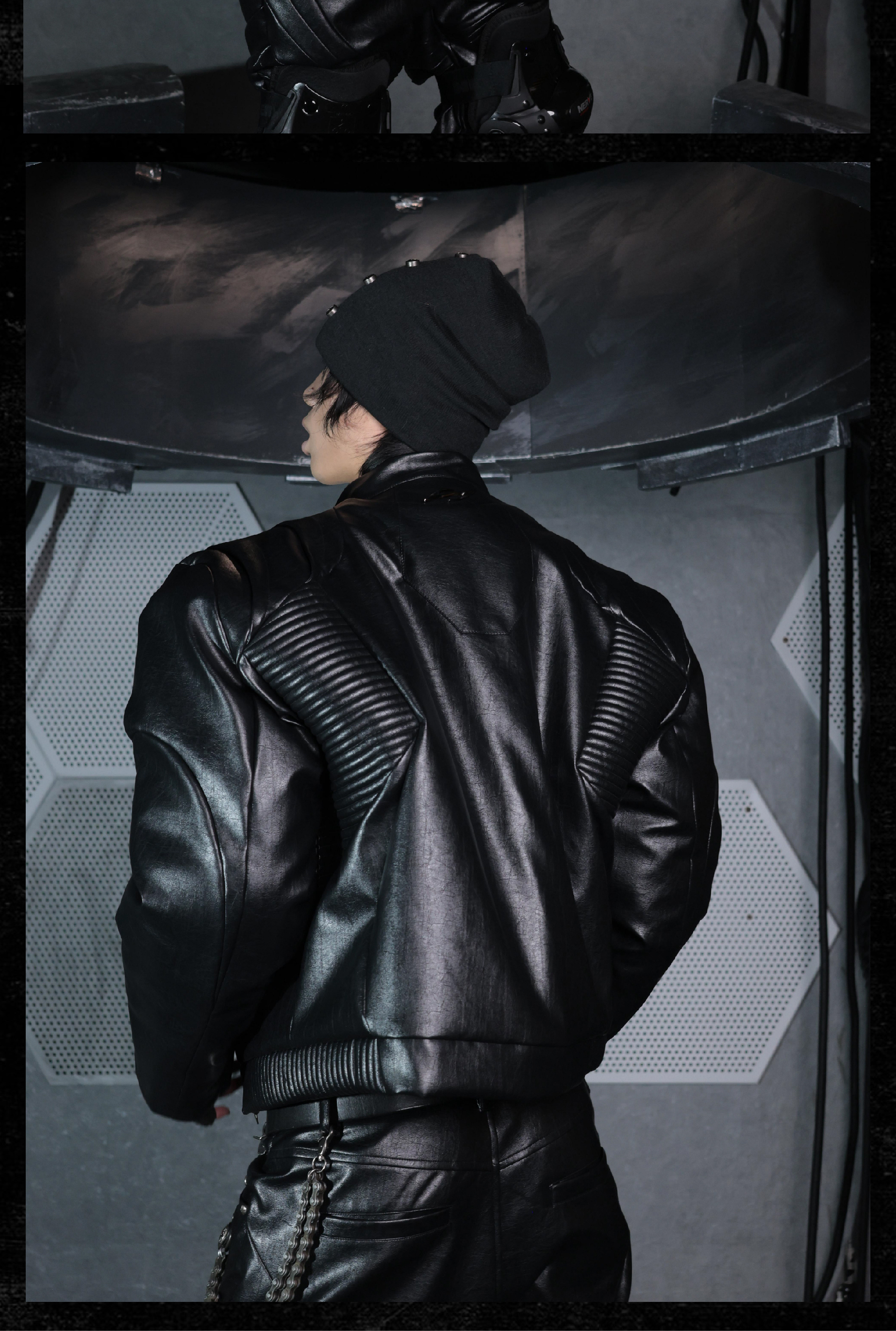 - Crafted from tree-grain textured leather, this jacket features a multi-layered cut and overlapping scale-like panels that create a dynamic and futuristic silhouette. The pleated textures running across the front and back enhance the three-dimensional form, while the thick padded inner lining provides exceptional warmth and structure. A bold reinterpretation of armor aesthetics with modern craftsmanship.