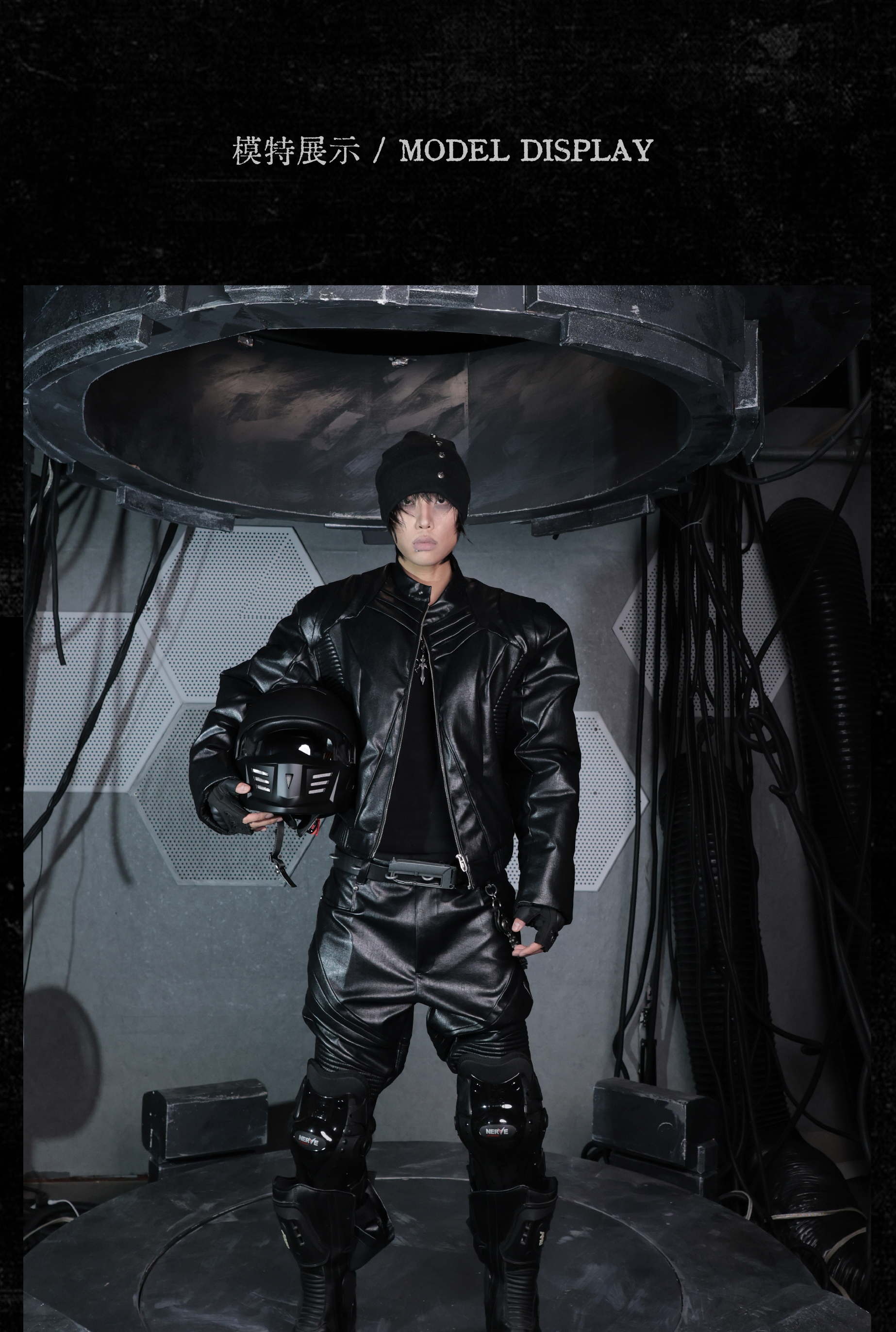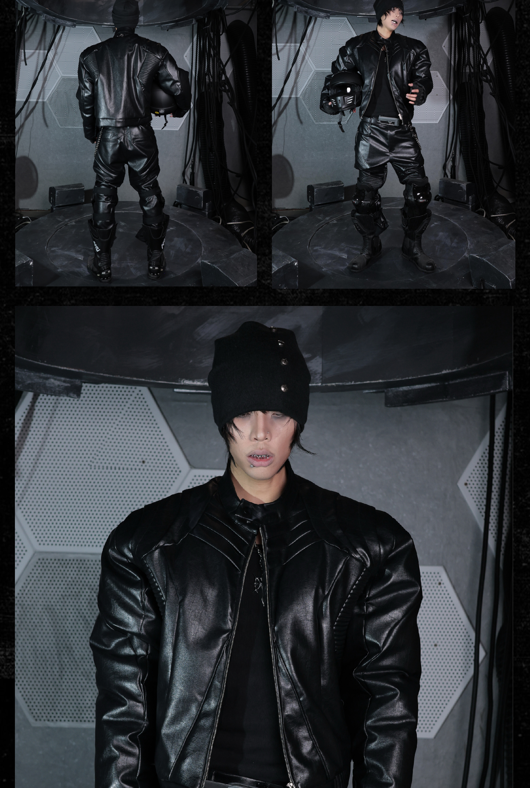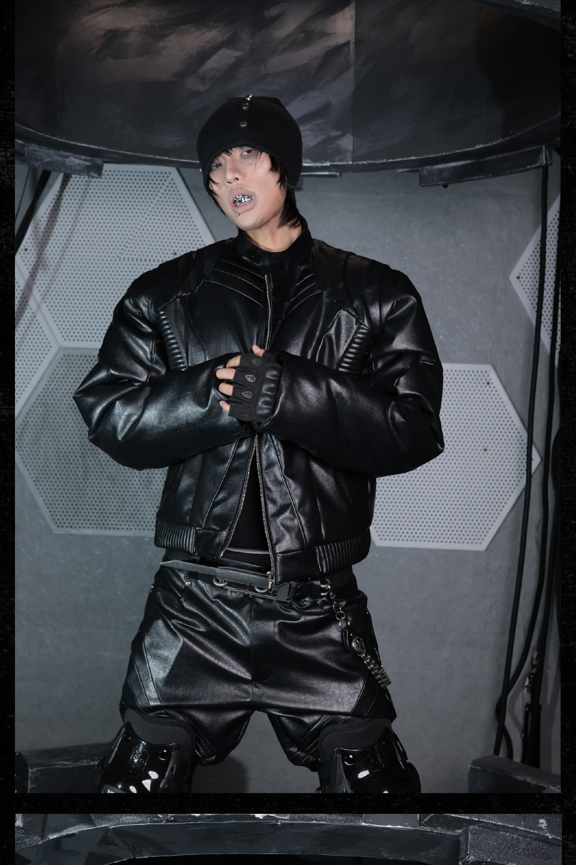 - Crafted from tree-grain textured leather, this jacket features a multi-layered cut and overlapping scale-like panels that create a dynamic and futuristic silhouette. The pleated textures running across the front and back enhance the three-dimensional form, while the thick padded inner lining provides exceptional warmth and structure. A bold reinterpretation of armor aesthetics with modern craftsmanship.