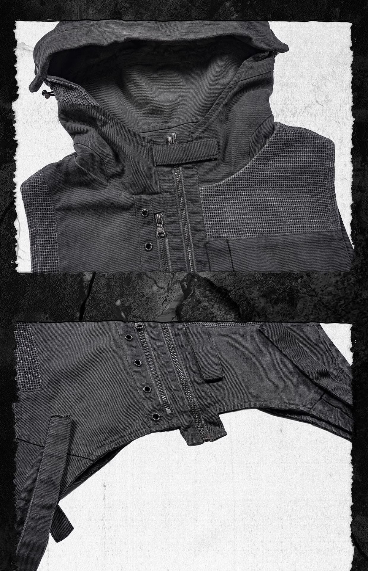 - The loose fit is made of heavy pure cotton fabric and treated with a dirt-dyed process, presenting a unique texture as if it has endured hardships in the post-apocalyptic world. The hood design not only provides wind protection but also adds a more practical survival vibe, perfectly adapting to the harsh environment in the end times. The combination of straps and mesh panels integrates the combat and functional elements of the post-apocalyptic ruins, while the metal eyelets add a touch of cold industrial atmosphere to the overall look.
