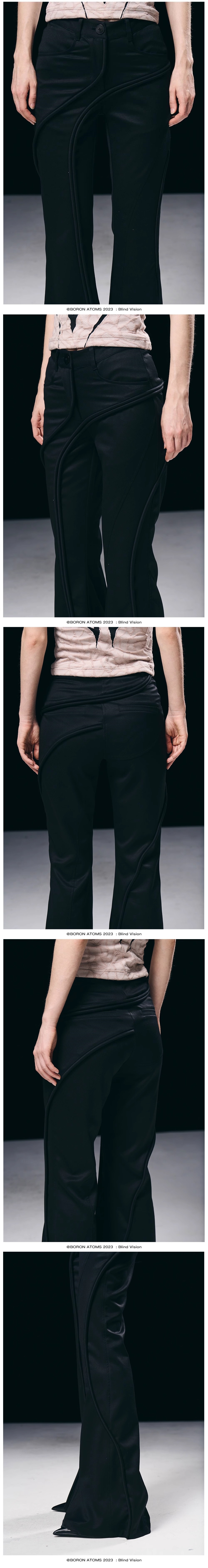 - The overall silhouette is slim, and the trousers have a slight flare at the cuffs. The pants feature a three-dimensional twisted stripe design around the legs, providing both a flattering fit and a stylish touch.