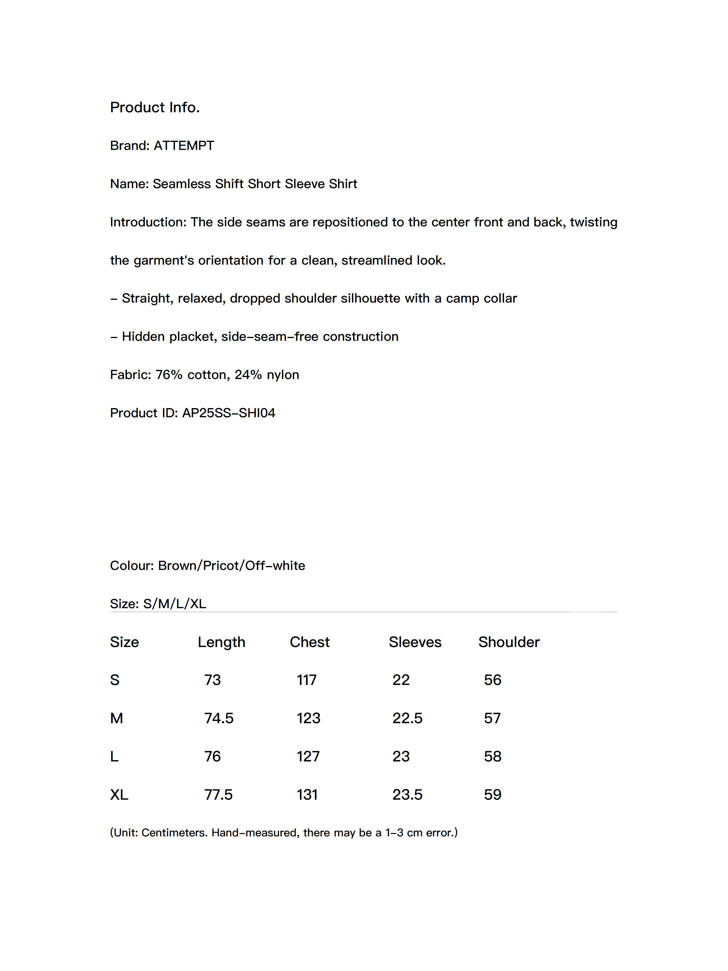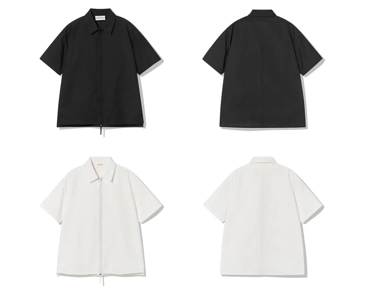The side seams are repositioned to the center front and back, twisting the garment's orientation for a clean, streamlined look. - Straight, relaxed, dropped shoulder silhouette with a camp collar - Hidden placket, side-seam-free construction