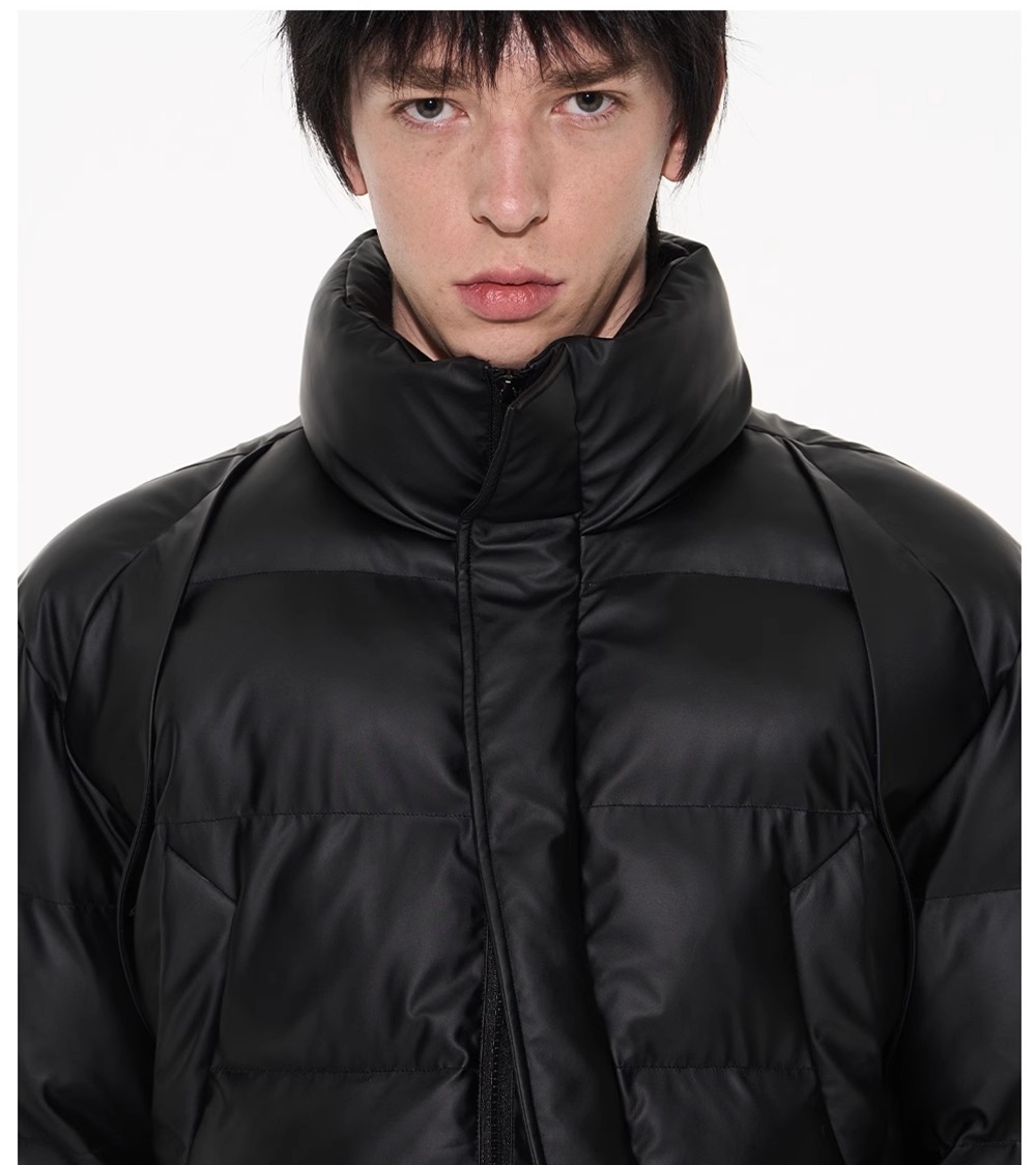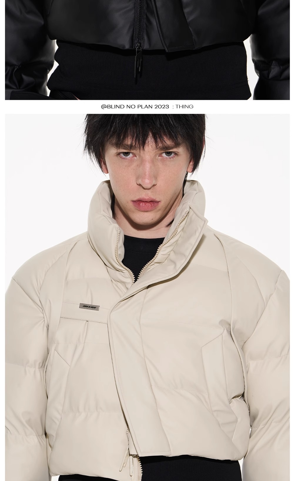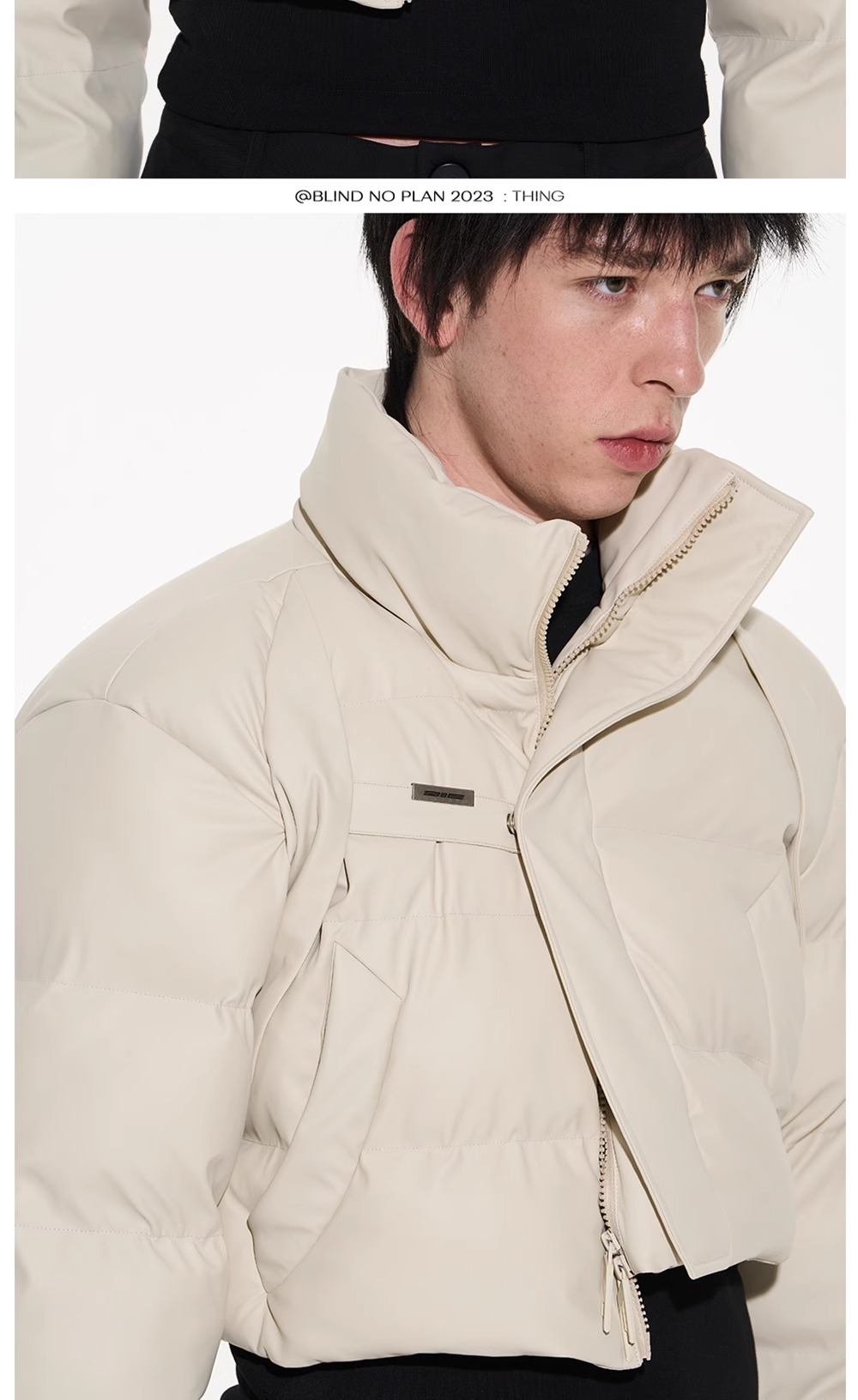 Design Details: The garment features a diagonal front closure design, creating a misaligned visual with the zipper. Flying ribbon designs on the shoulders contribute to an overall short silhouette.