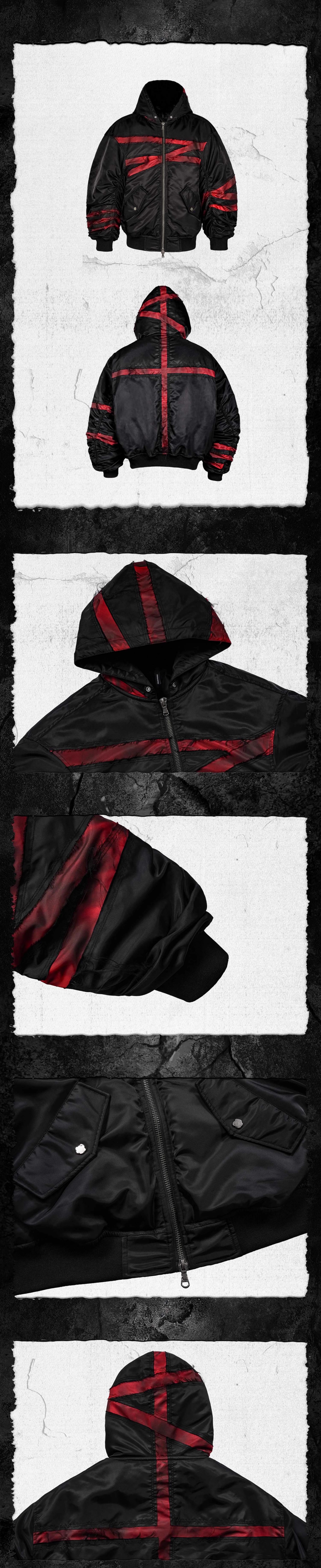 - Wrapped in bandage-like layers and marked by fractured cross details, this jacket fuses a boxy silhouette with the iconic MA-1 flight jacket design. The 240g composite cotton filling provides warmth amidst the wasteland chill, while the curved moto pleats on the sleeves create sharp, cutting-edge lines. Interwoven deconstructed bandages and frayed patchwork mimic the reconstruction of a shattered civilization. The cross-shaped back design stands as a symbol of faith in the apocalypse, while the distressed black-red hues resemble the ashes left after a world consumed by fire.