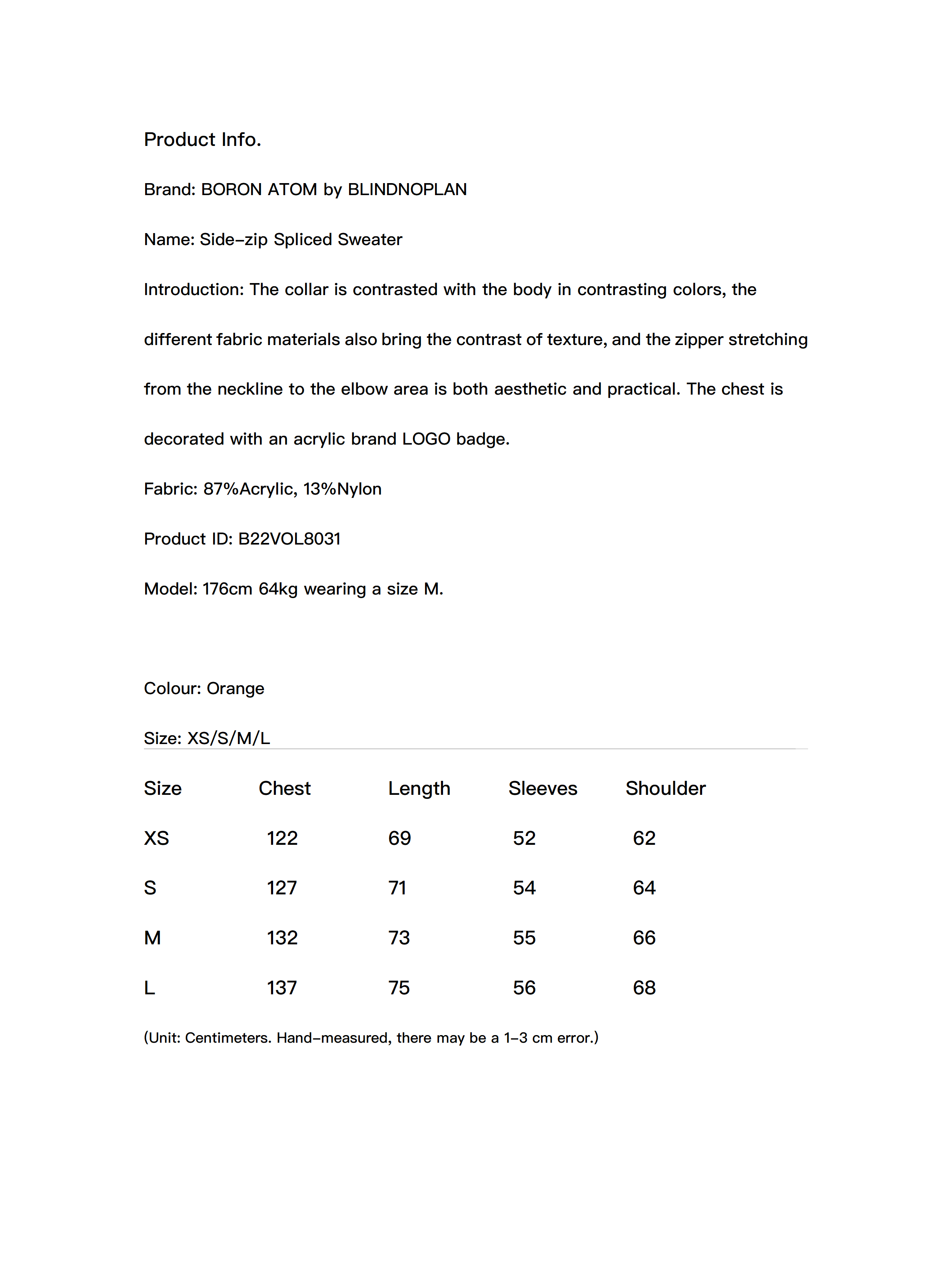 The collar is contrasted with the body in contrasting colors, the different fabric materials also bring the contrast of texture, and the zipper stretching from the neckline to the elbow area is both aesthetic and practical. The chest is decorated with an acrylic brand LOGO badge.