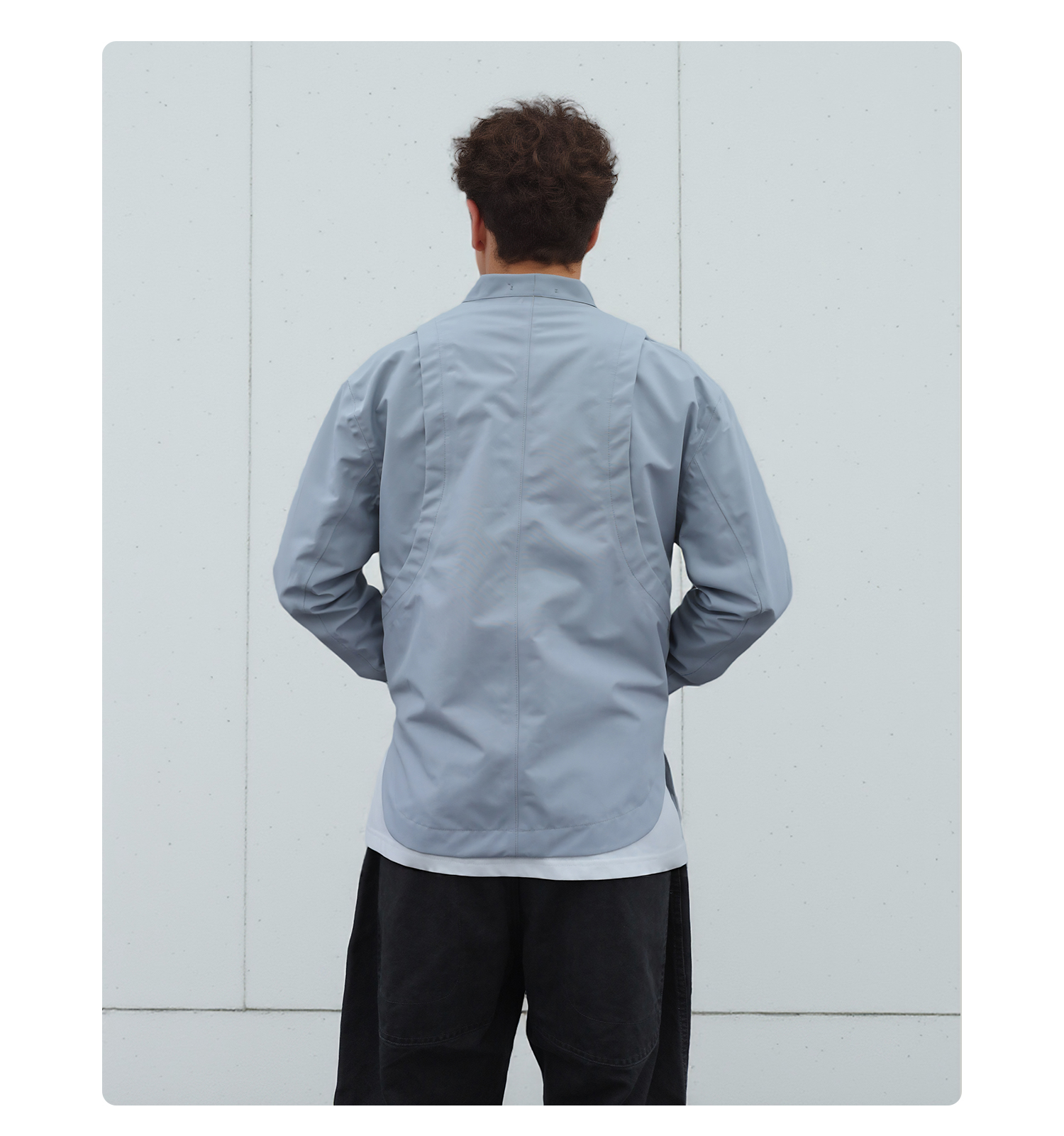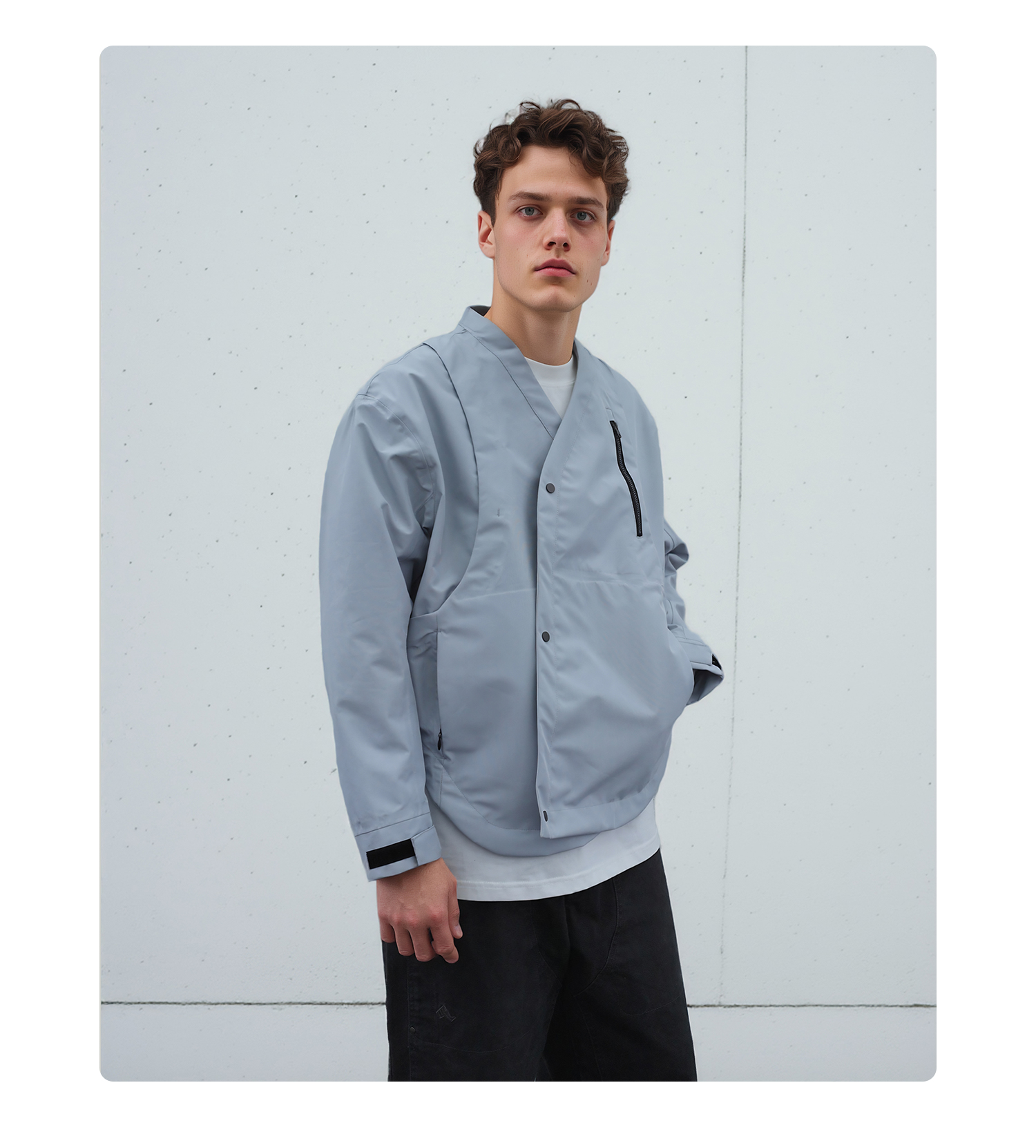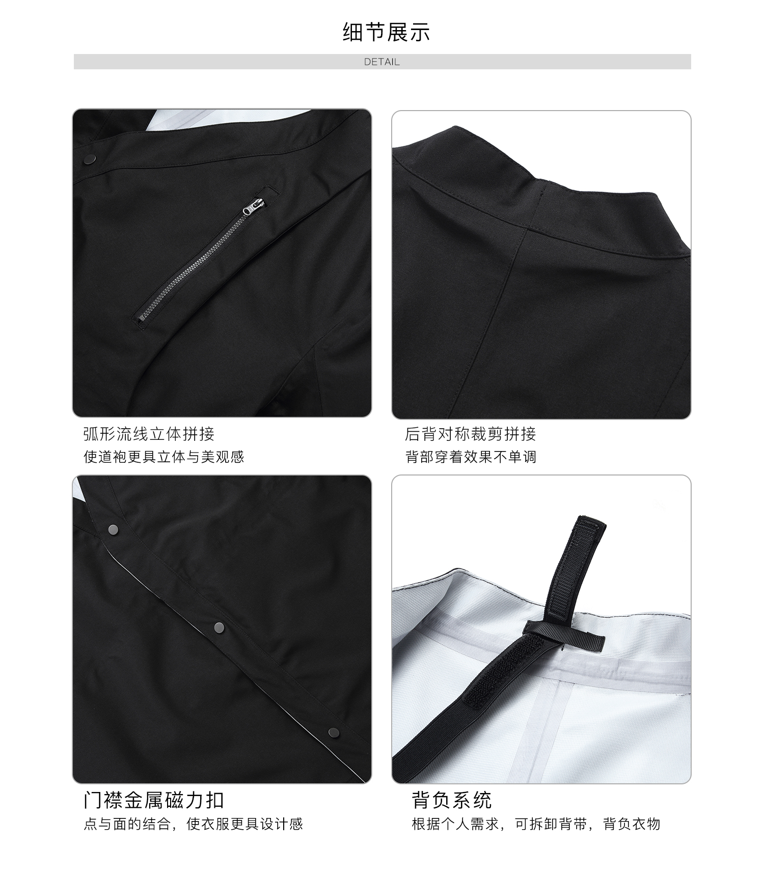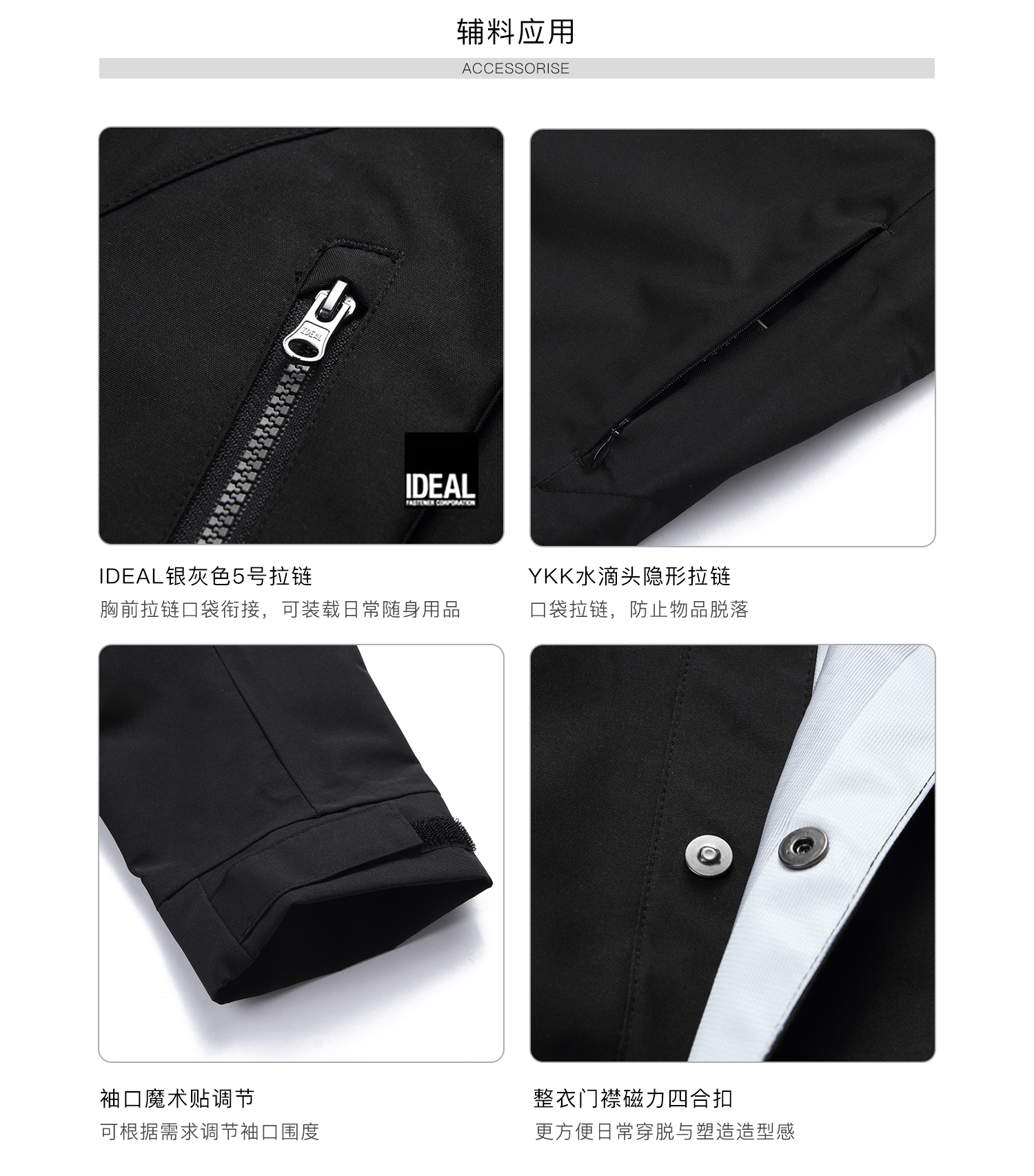 - TEFLON three-proof three-layer composite fabric provides windproof, snowproof and water-resistant protection while maintaining comfort during movement. Features IDEAL silver-gray No.5 zipper with a chest zipper pocket for carrying daily essentials. Adjustable hook-and-loop cuffs allow personalized fit. YKK droplet-pull invisible zippers secure pocket storage. Magnetic snap buttons on the placket offer easy daily wear and enhance styling. Curved and streamlined three-dimensional paneling creates a structured and refined silhouette. Metal magnetic placket buckles combine point and surface aesthetics for a unique design touch. Symmetrical back panel construction keeps the rear silhouette visually balanced. Detachable carrying-strap system allows users to shoulder the garment when needed.