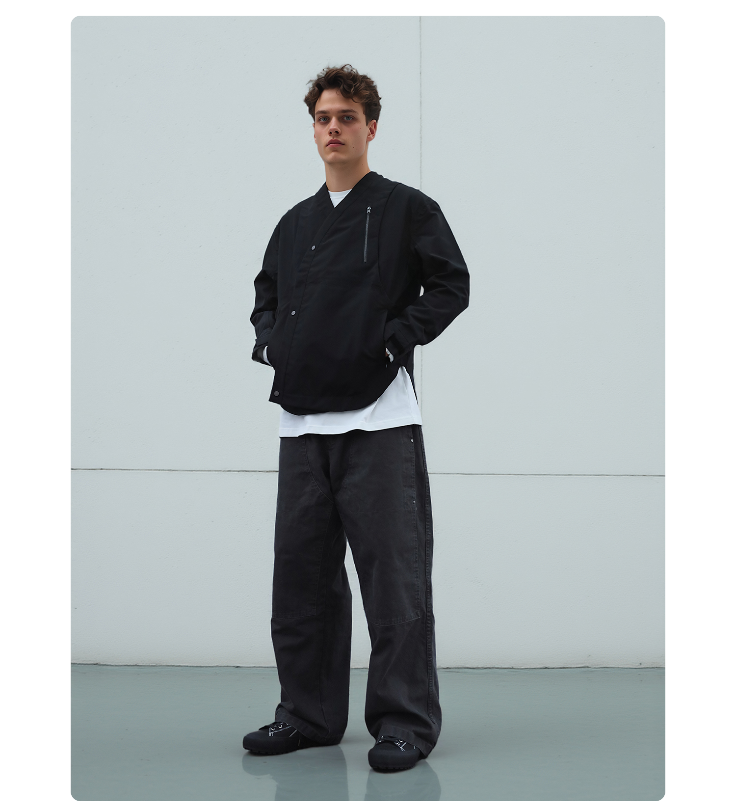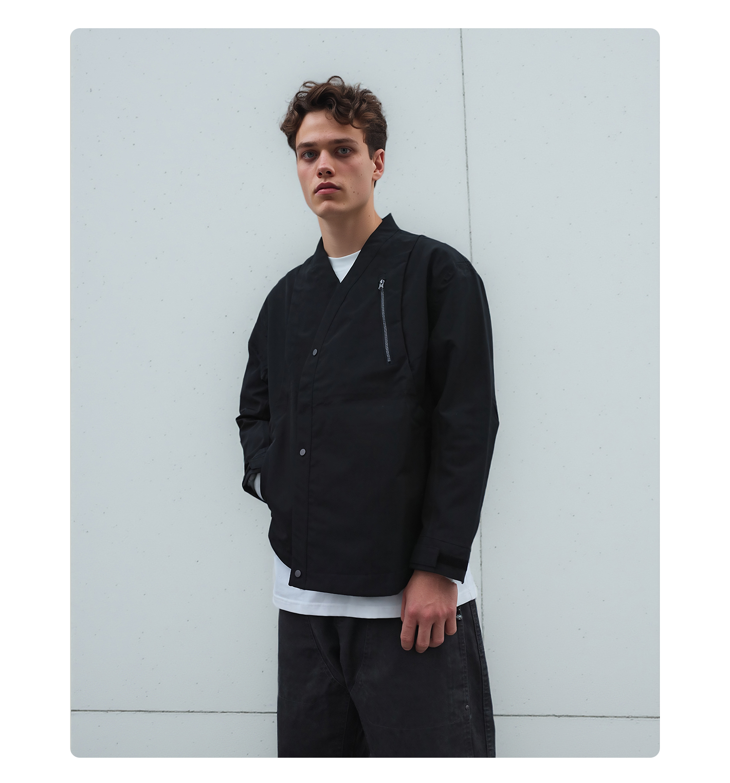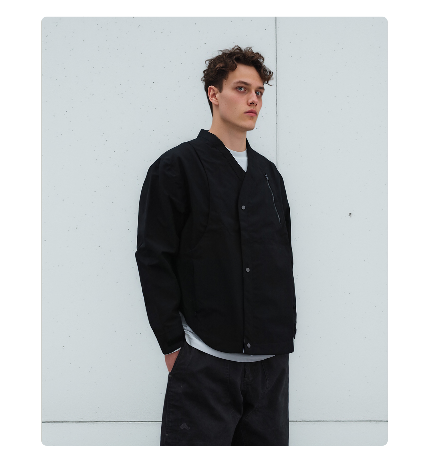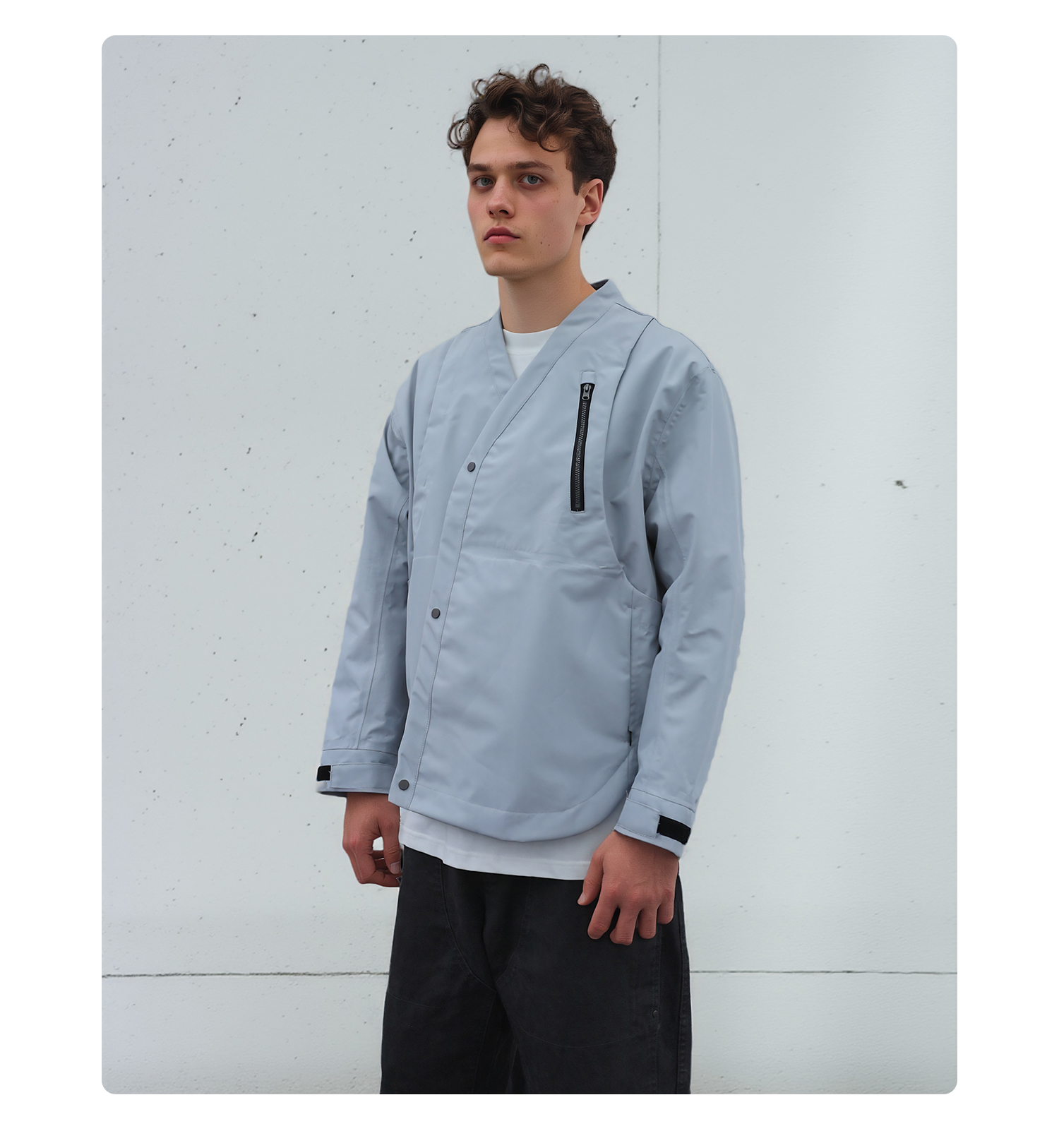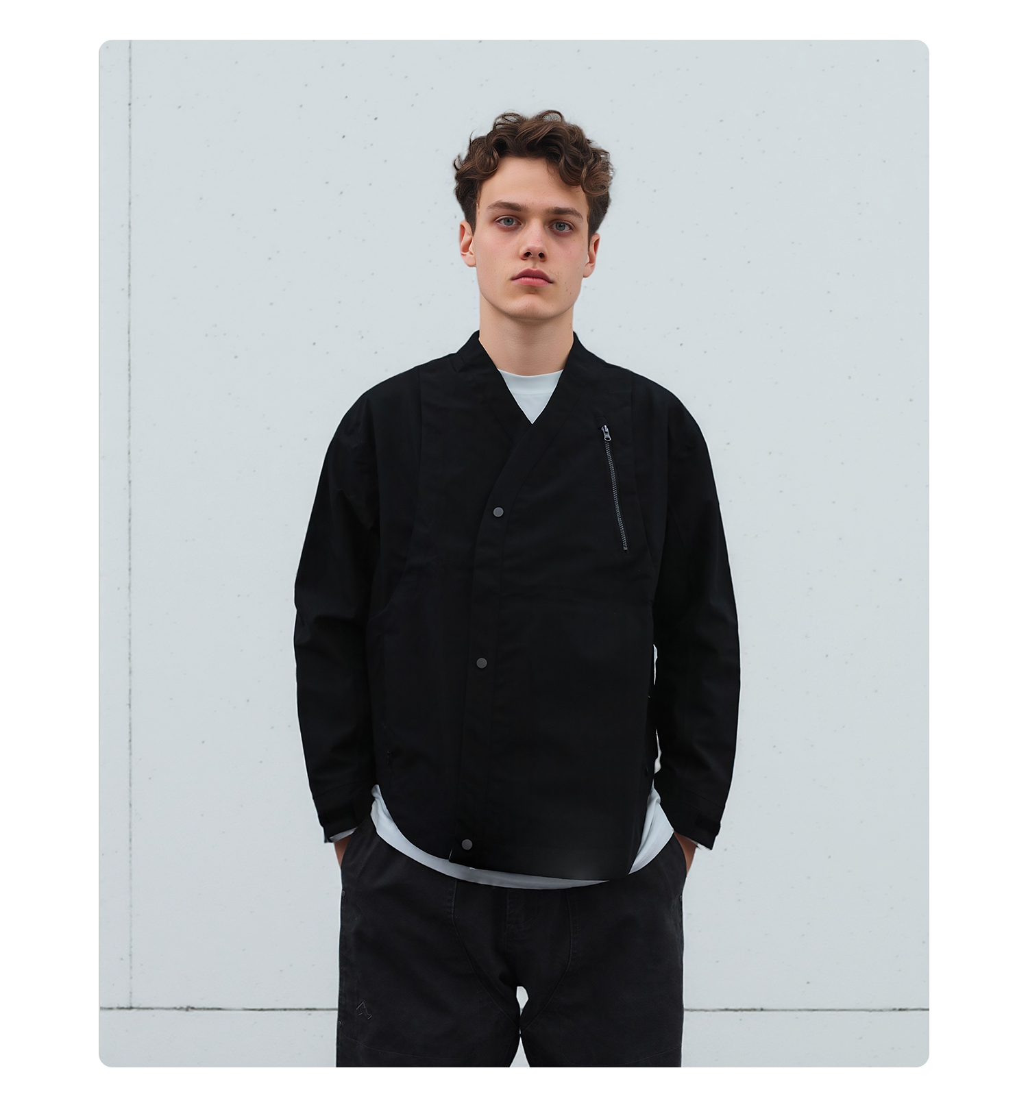 - TEFLON three-proof three-layer composite fabric provides windproof, snowproof and water-resistant protection while maintaining comfort during movement. Features IDEAL silver-gray No.5 zipper with a chest zipper pocket for carrying daily essentials. Adjustable hook-and-loop cuffs allow personalized fit. YKK droplet-pull invisible zippers secure pocket storage. Magnetic snap buttons on the placket offer easy daily wear and enhance styling. Curved and streamlined three-dimensional paneling creates a structured and refined silhouette. Metal magnetic placket buckles combine point and surface aesthetics for a unique design touch. Symmetrical back panel construction keeps the rear silhouette visually balanced. Detachable carrying-strap system allows users to shoulder the garment when needed.