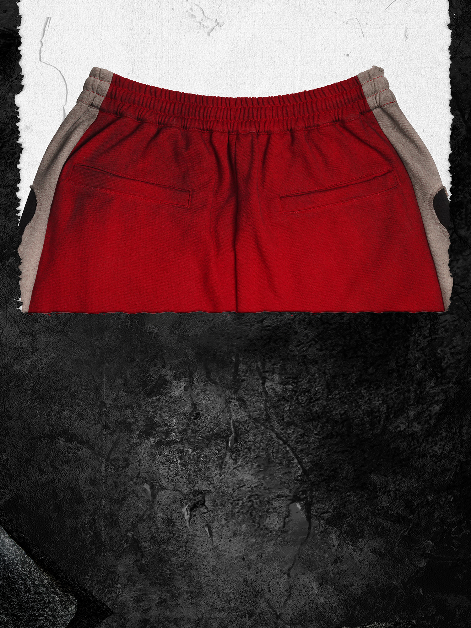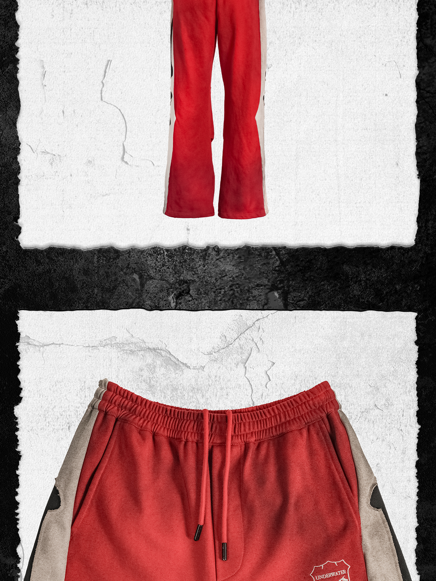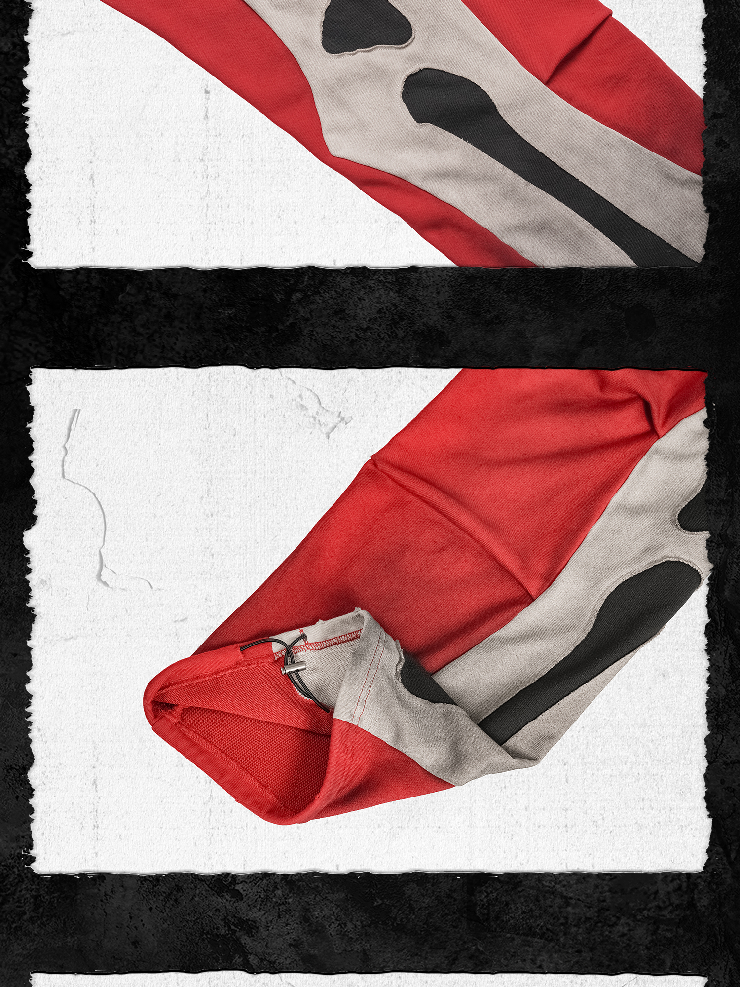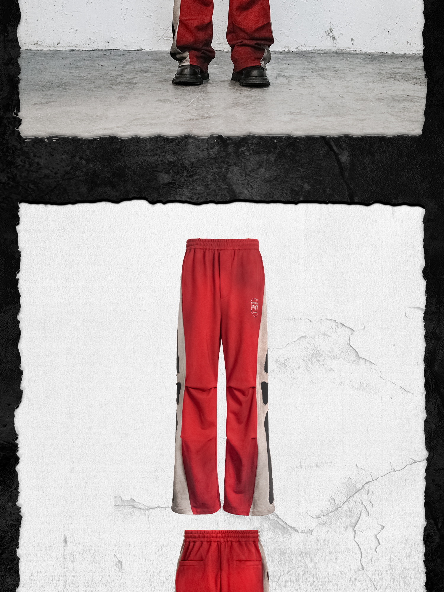 - Designed in a relaxed UW fit, these sweatpants are crafted from soft cotton terry fabric for breathable comfort. The 3D tailoring subtly shapes the leg line, while the pants are detailed with irregular skeletal-shaped contrast raw-edge panels, highlighting a biomechanical aesthetic full of tension. Adjustable drawcords hidden inside the cuffs allow versatile styling for different looks and scenarios. Hand-applied distressing and sprayed washing treatments give a weathered, corroded finish, as though eroded by time. A custom demon bone crest embroidered on the front precisely captures skeletal textures, symbolizing an eternal covenant. With its layered raw edges, bone-inspired patchwork, and distressed finish, the piece embodies rebellion and rebirth in a dark aesthetic.