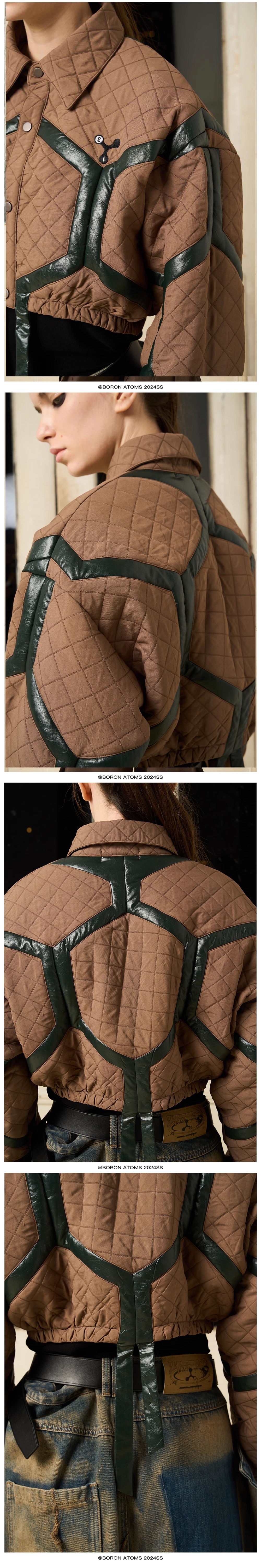 - The garment body utilizes a football patterned splicing design, combining leather material with textured fabric and incorporating a padded design. This enhances the visibility of the spliced shapes, adding visual depth to the overall appearance.
