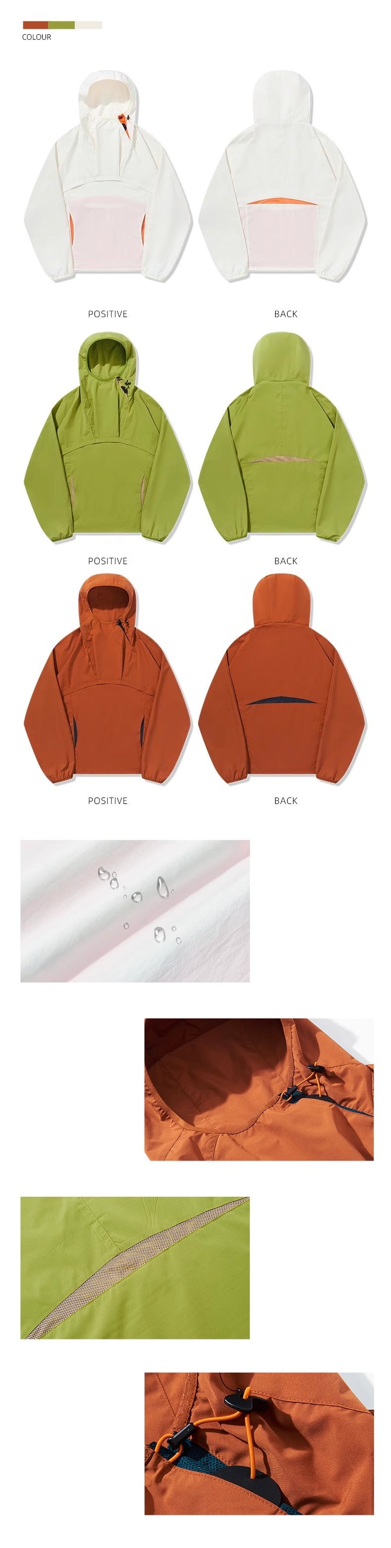 - Selection of 108g light fabric, with water resistance, easy to cope with light rain. The fabric is made of imported SOLOTEX yarn, special bulleting process and segmented water-resistant finishing process. With a sense of bone, feel its own natural cotton feeling, anti-wrinkle easy to take care of, a touch is flat. Underarm, back color ventilated mesh fabric splicing, comfortable and breathable. Windproof high collar design, more protective performance. The neckline is equipped with sports performance adjustment device, which is more playable and functional. The hem is equipped with an integrated lock, which can freely adjust the shape effect, more functional, efficient and fast. Loose version type, three colors are optional, the foundation of everything