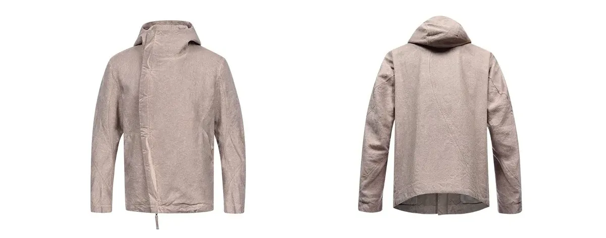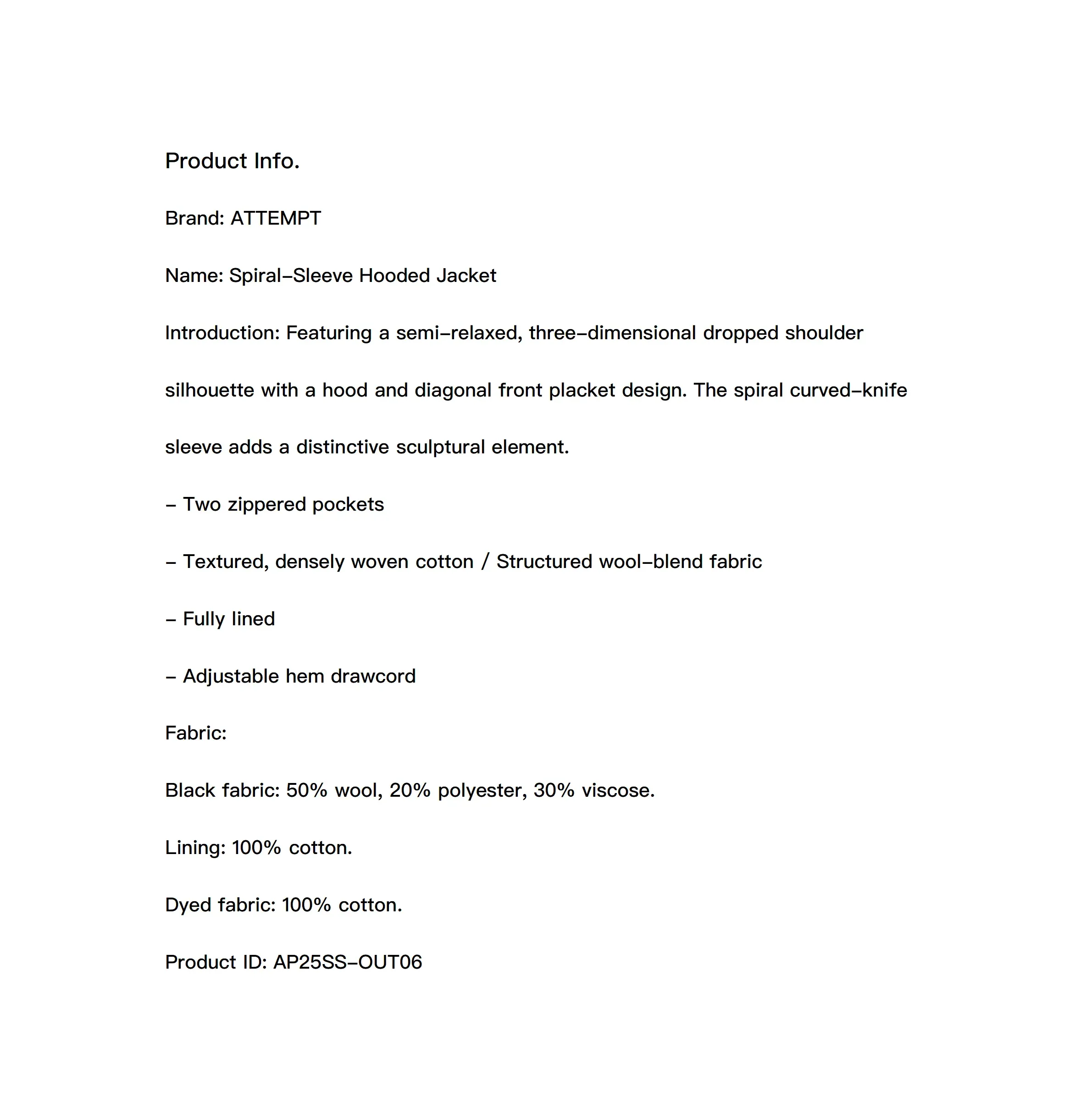 Featuring a semi-relaxed, three-dimensional dropped shoulder silhouette with a hood and diagonal front placket design. The spiral curved-knife sleeve adds a distinctive sculptural element.