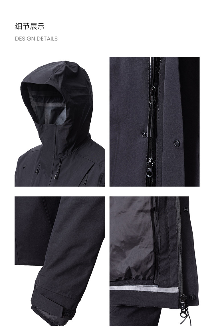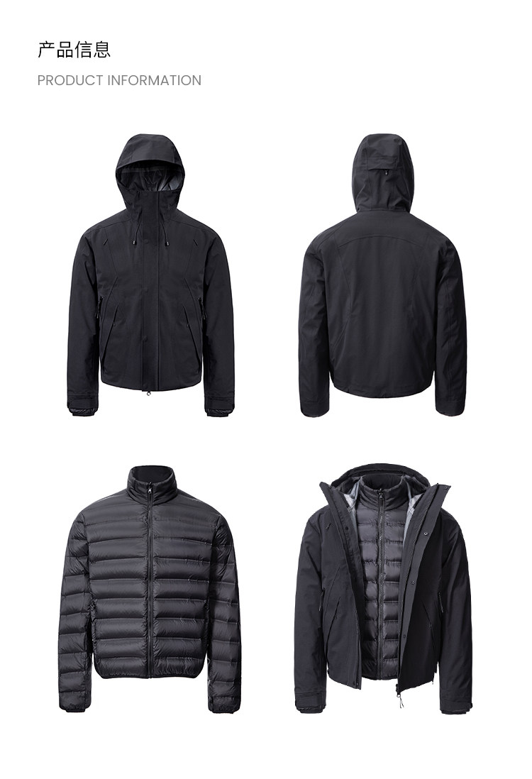 - It adopts a modular design with a detachable outer shell and an independent down inner layer, achieving "three styles in one jacket." In spring and autumn, wear the outer shell alone for its windproof, waterproof, and breathable performance in changeable weather and daily commutes. In winter, combine both layers—the shell repels wind, rain, and snow, while the down liner locks in deep warmth, forming a double-barrier shield that handles cold conditions with ease. The down inner layer can also be worn alone in cooler weather—lightweight, lofty, and non-bulky. The outer hood is adjustable with a drawcord for a snug fit, effectively blocking wind in harsh conditions. Its three-dimensional shape maintains clear visibility for safer outdoor movement. The outer zippers are waterproof, and pockets feature sealed zipper closures to keep contents dry. Adjustable cuffs and hem prevent cold air and moisture from entering. The inner layer attaches securely to the outer via concealed quick-connect points, allowing effortless assembly and removal for seamless style switching.