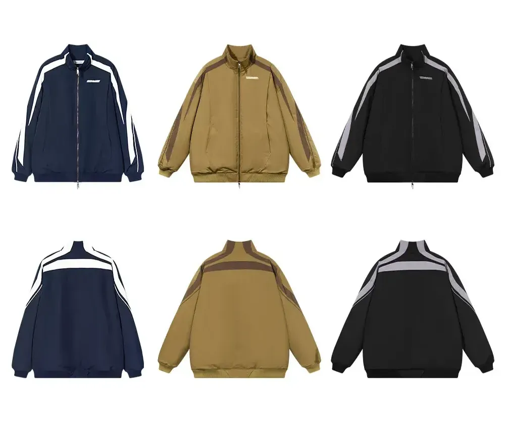 Design Details: A clean, minimalist jacket silhouette with color-block paneling along the shoulders and sleeves that follows the garment’s structure, using fabrics of contrasting textures to create tactile depth. The look is sharp and refined, accented by a color-contrast brand logo print on the chest.