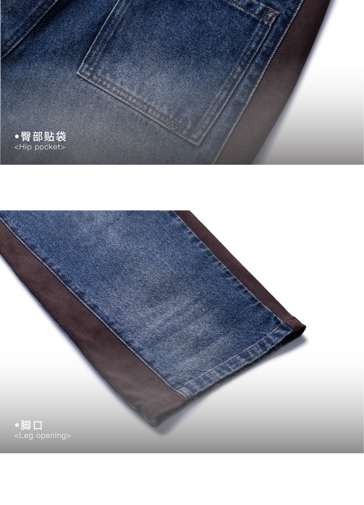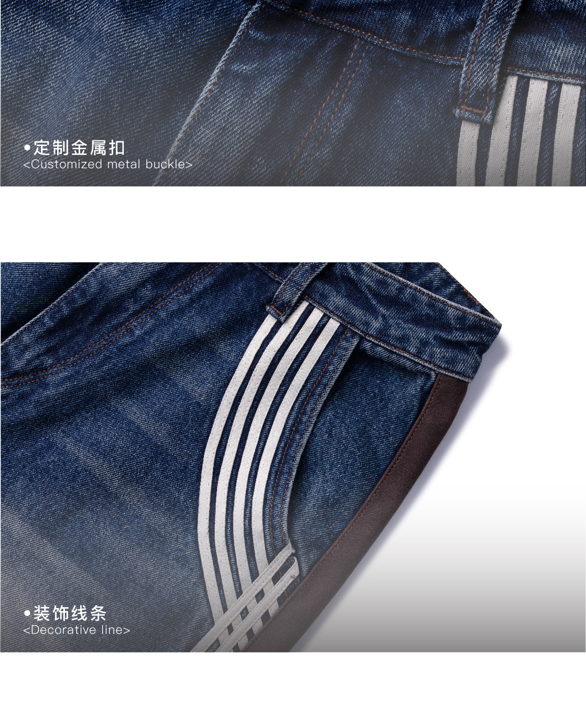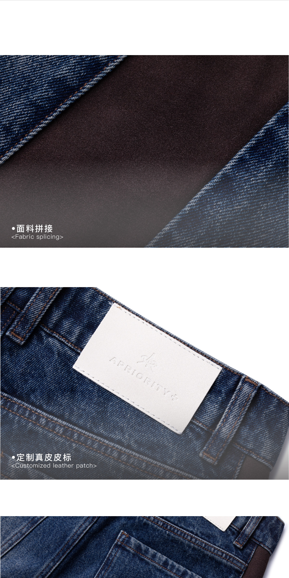 Design Details: Line decorative design; large leg patch pockets. Custom metal buttons; YKK metal zipper; custom genuine leather patch. Denim wash technique; PU leather paneling design; pure cotton denim fabric.