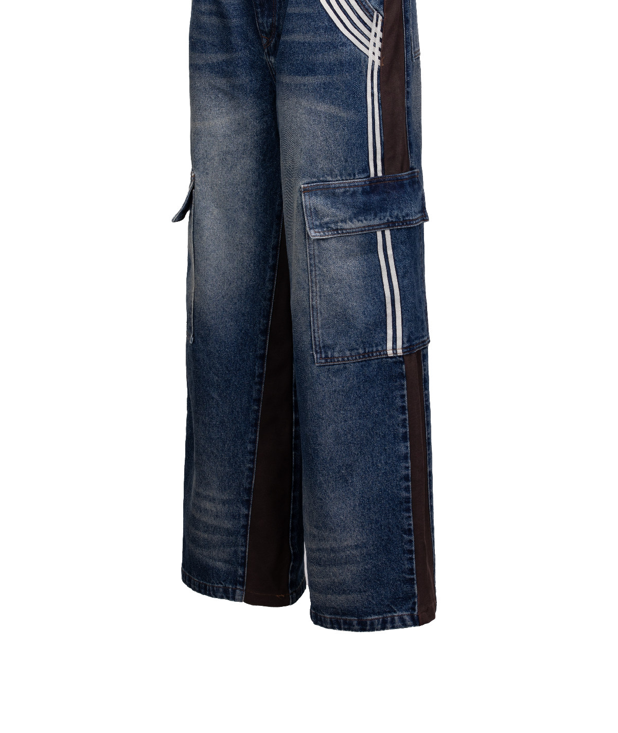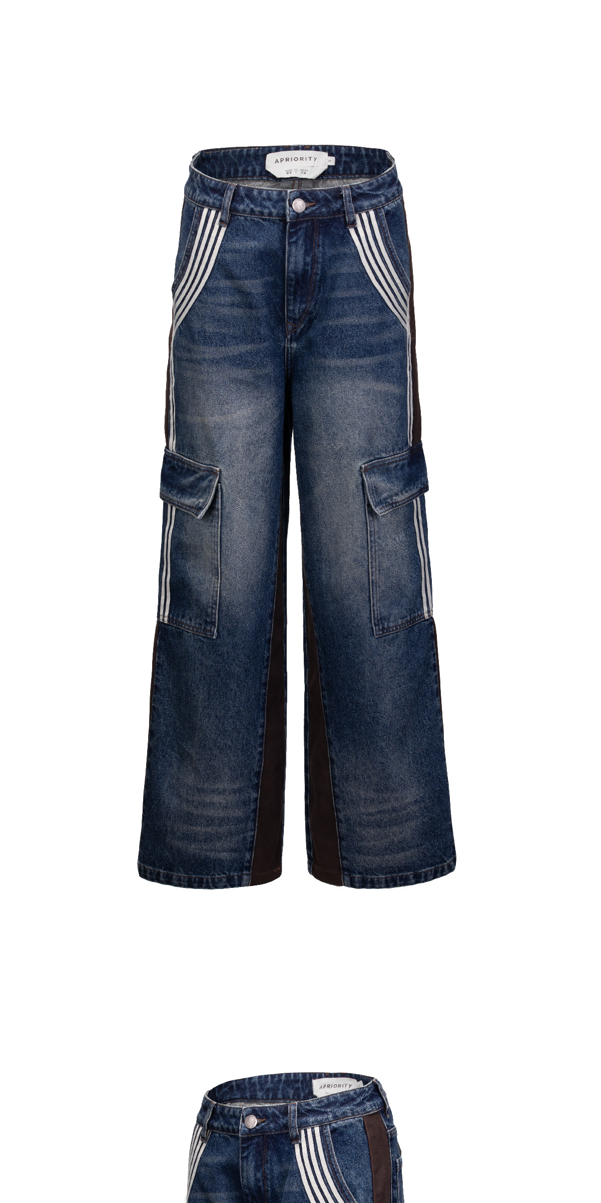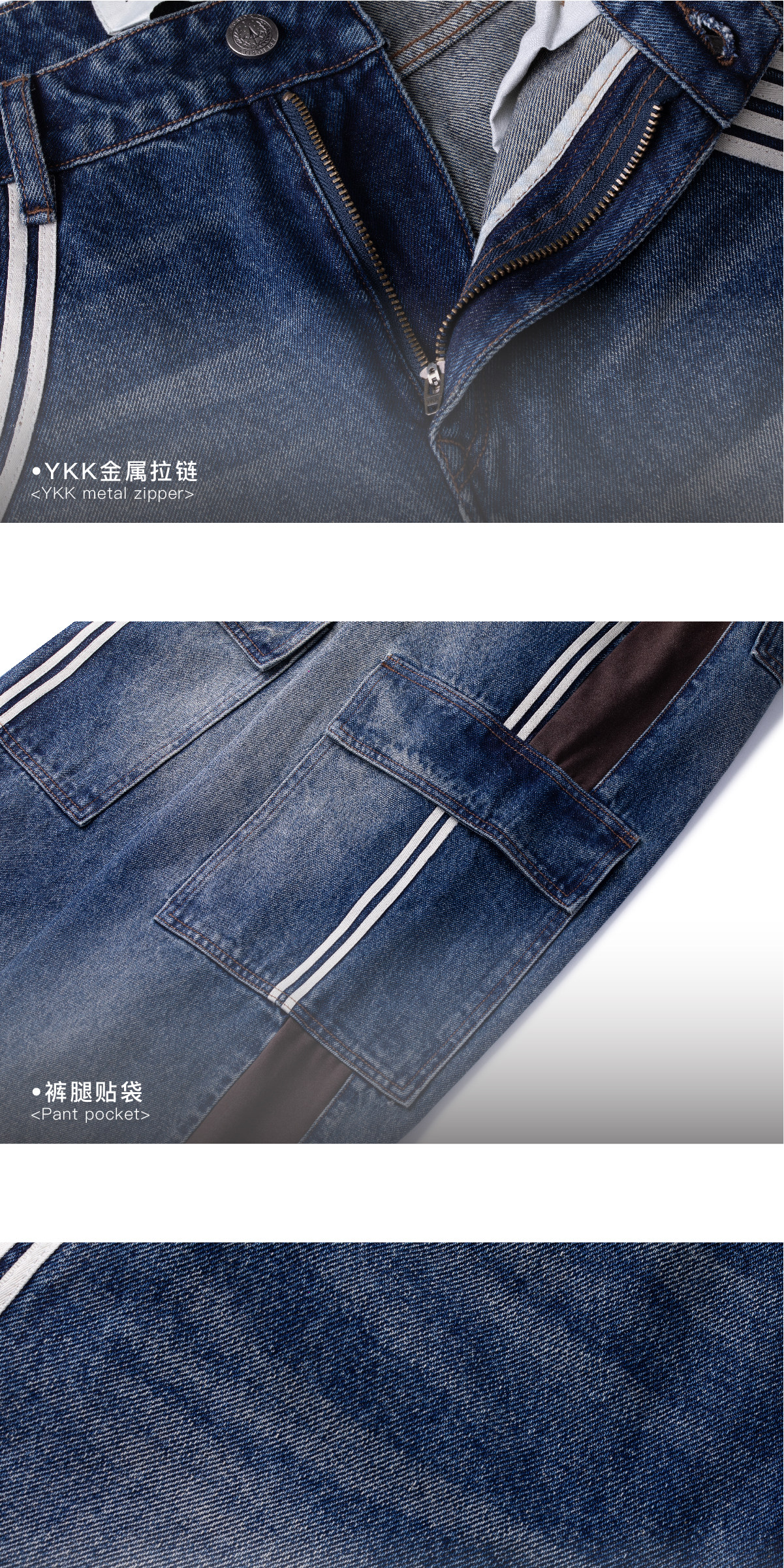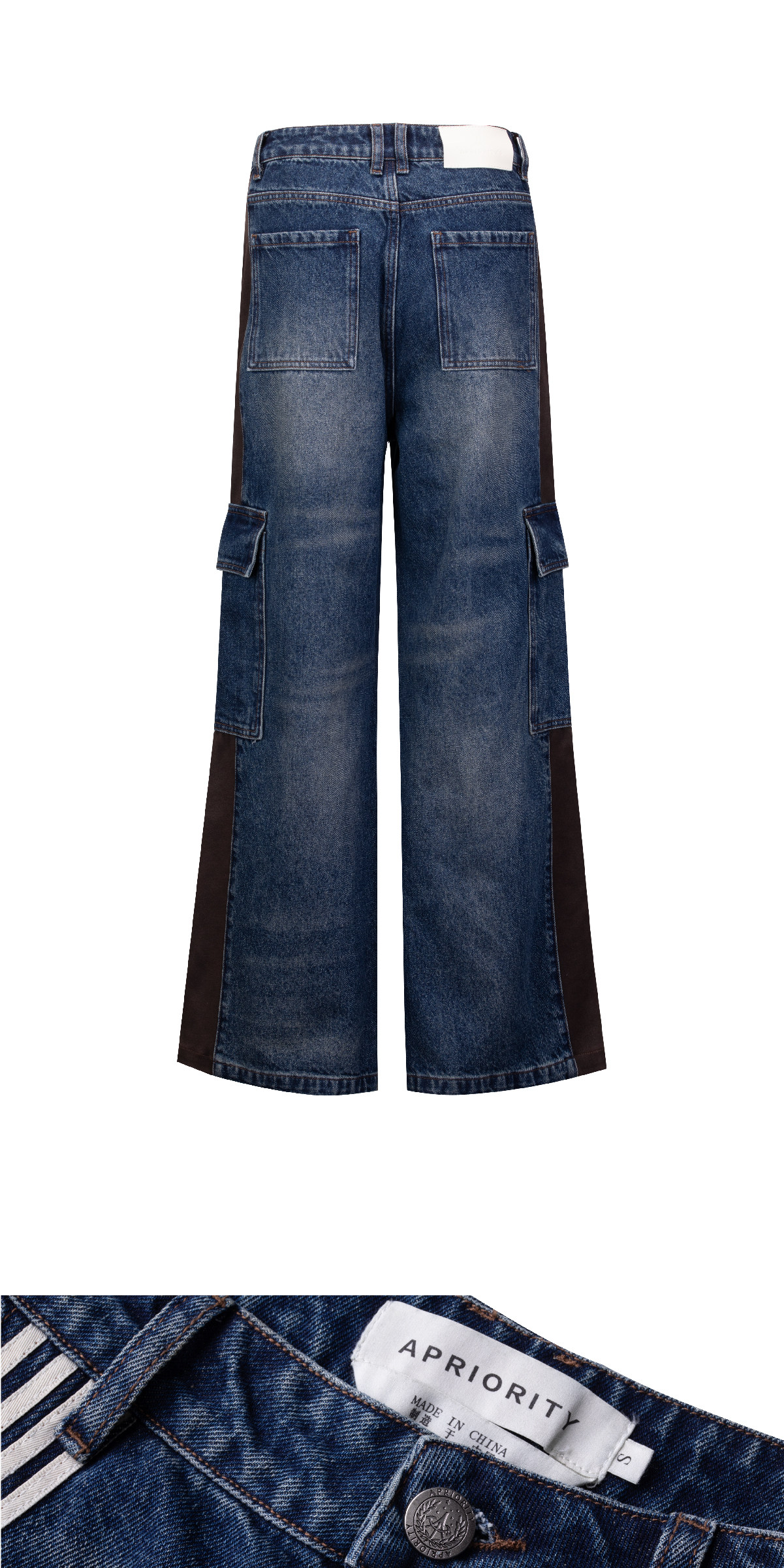 Design Details: Line decorative design; large leg patch pockets. Custom metal buttons; YKK metal zipper; custom genuine leather patch. Denim wash technique; PU leather paneling design; pure cotton denim fabric.