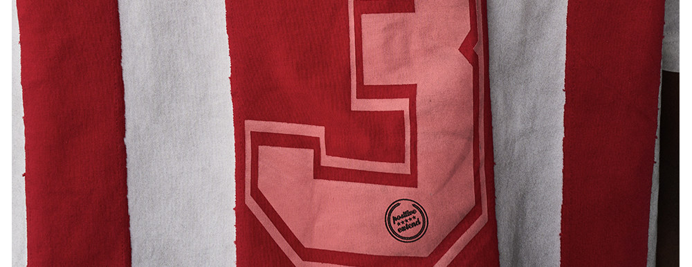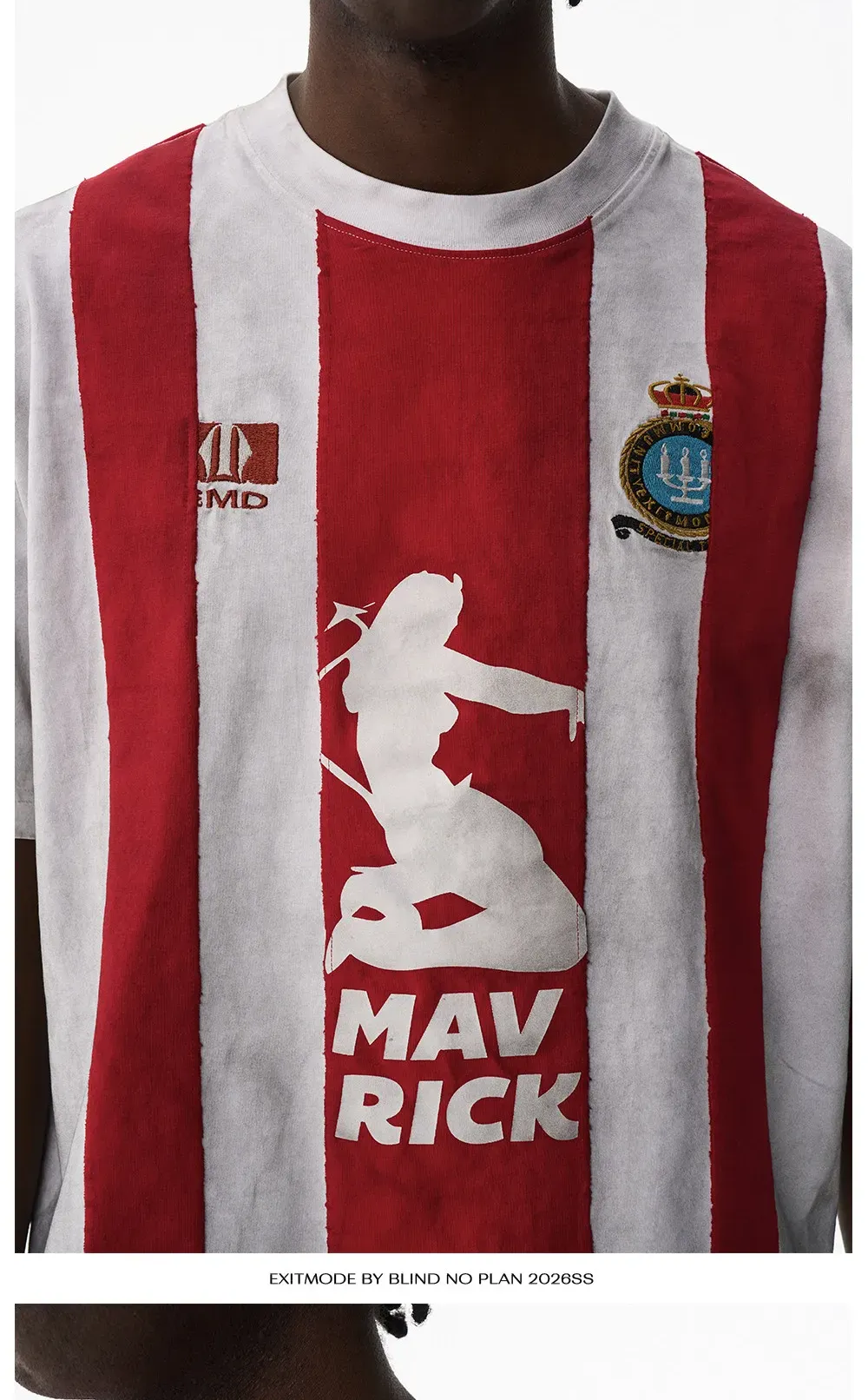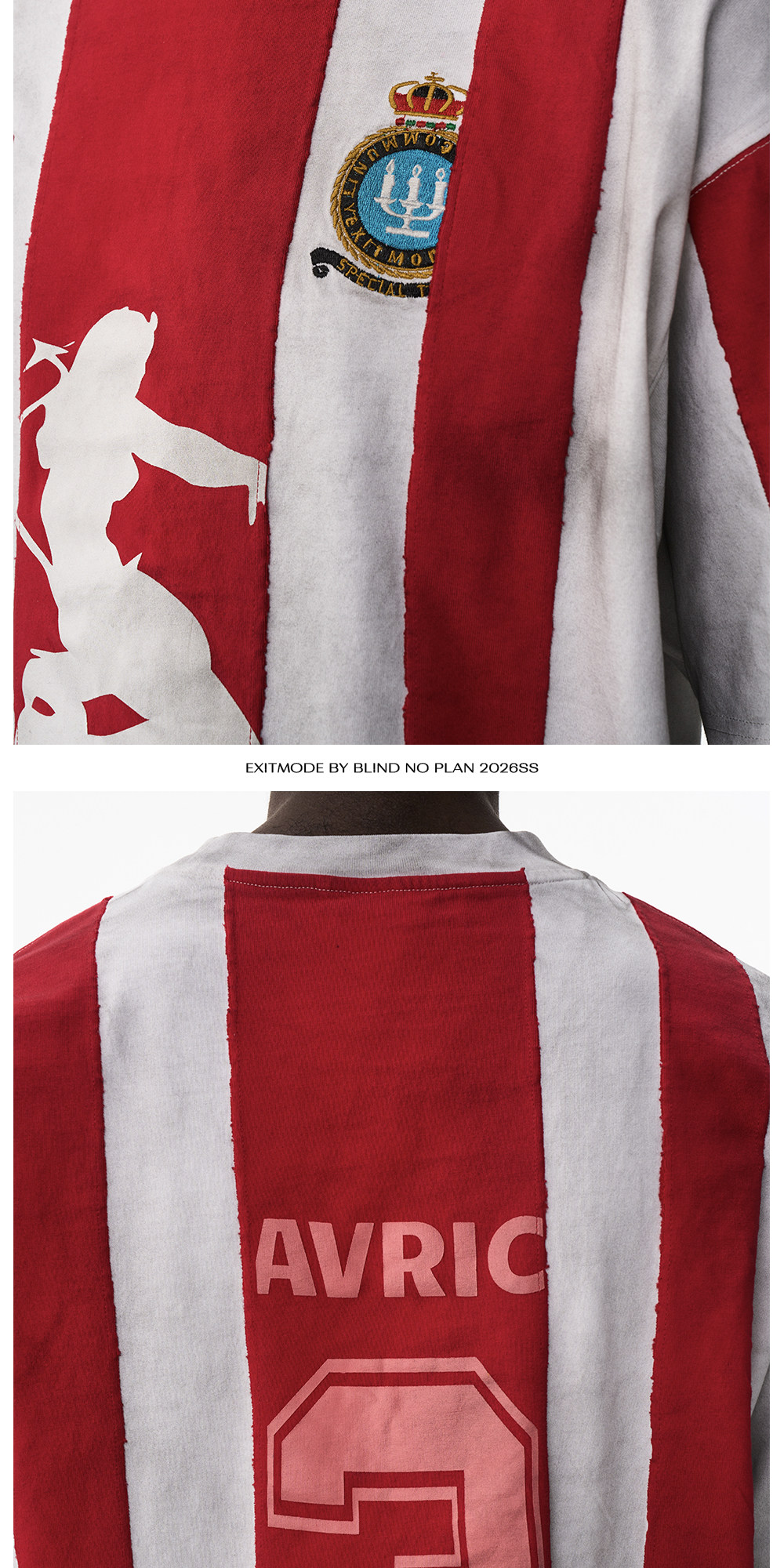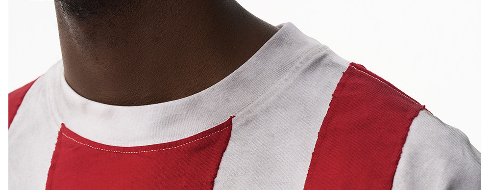 Design Details: Relaxed fit with raw-edge striped patch detailing. Combined print and embroidery techniques add athletic styling with visual highlights. Finished with a smear-wash aged effect.
