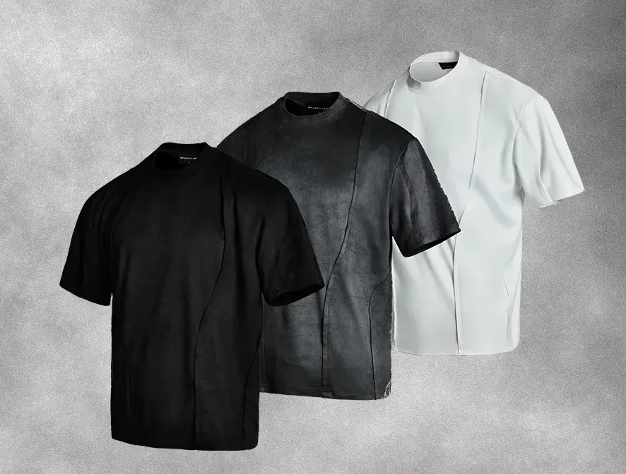 Design Details: Crafted from soft faux suede fabric, this T-shirt offers a breathable and comfortable wearing experience while maintaining a refined matte texture. The curved overlapping panel design enhances the sense of structure and depth, making it stand out from ordinary summer tees. A versatile yet thoughtfully designed piece that combines minimalism and texture for a unique seasonal look.