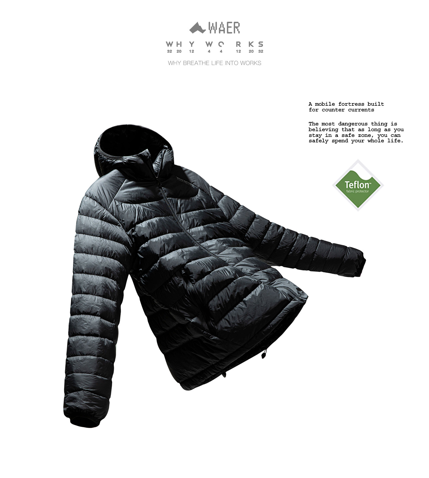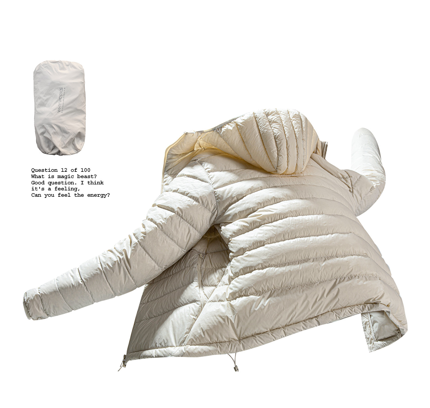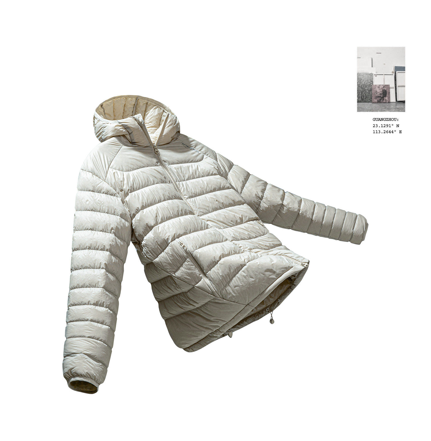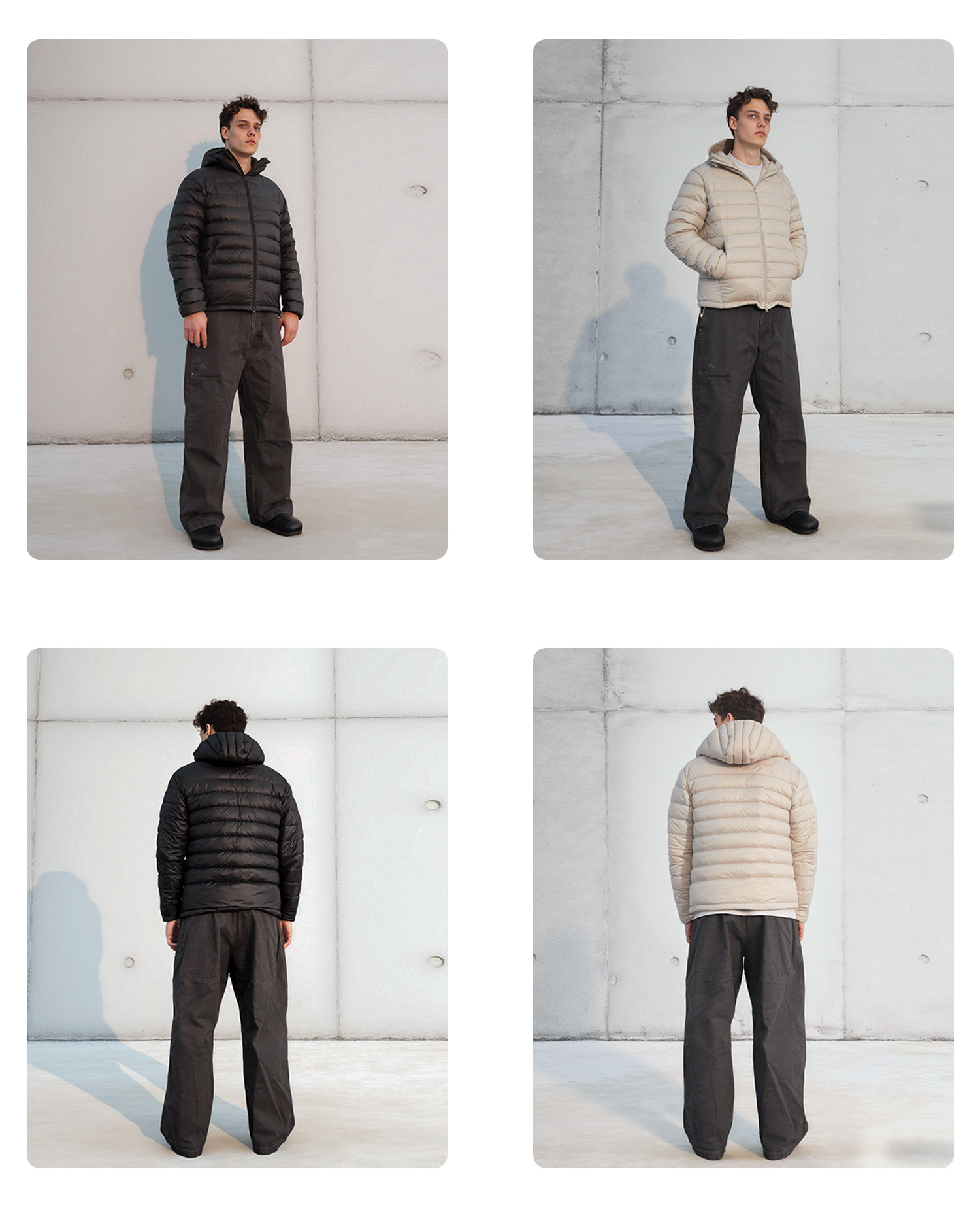 CloudWander captures the light, free form of clouds drifting across the sky. 90% high-loft down is precisely quilted in an expansive layout, resting on the body like settled cloud clusters. We have reimagined the "presence" of down—it is not static filling, but a fluid embrace. It maintains its loft during movement and locks in warmth lightly against the cold wind, with thoughtful design under the arms and across the back allowing ample room for every stretch.