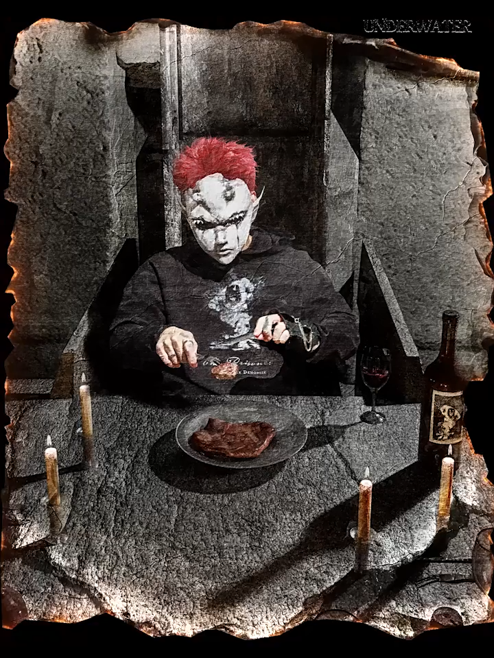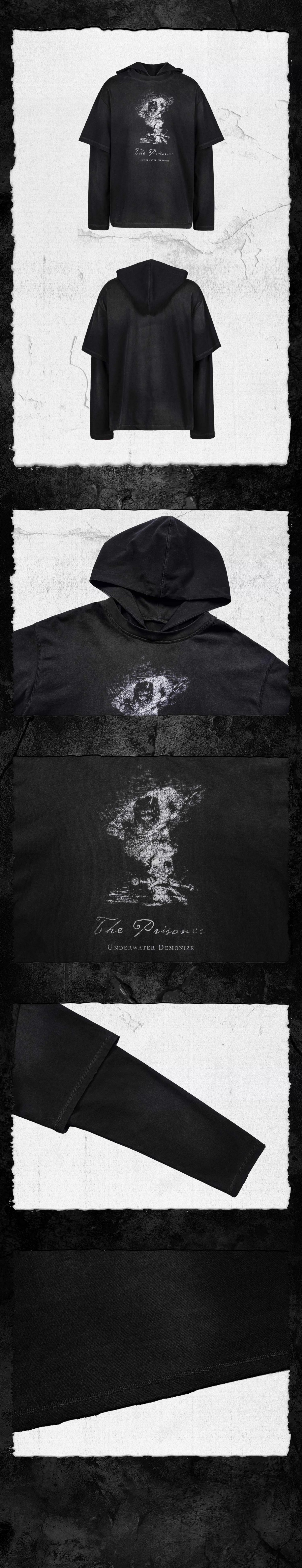 - Featuring a fitted silhouette, this long sleeve incorporates a layered design with a faux short-sleeve hoodie combination, adding depth and dimension. The garment undergoes a distressed, uneven wash treatment, with raw edges and multiple hand-applied destruction details, embodying a rugged post-apocalyptic aesthetic. A prisoner-themed print, weathered to appear aged by time, resembles a warning sign salvaged from the ruins. This piece is a declaration of defiance—an identity statement for wanderers of the wasteland.