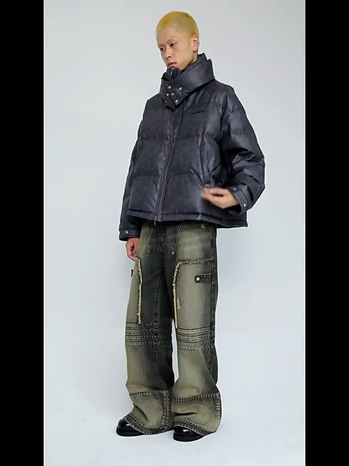 Filled with 217g–247g of 90% white duck down (new national standard). PU coated faux leather fabric with a textured finish. YKK metal zippers and high-quality contrast lining. Double-layer high collar provides wind resistance, complemented by custom snaps. Drawcord hem and collar, plus snap-button cuffs, allow adjustable fit. Features branded metal leather patch, metal logo, and genuine leather sl