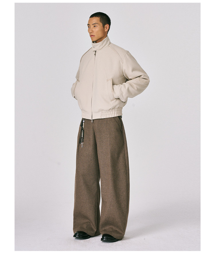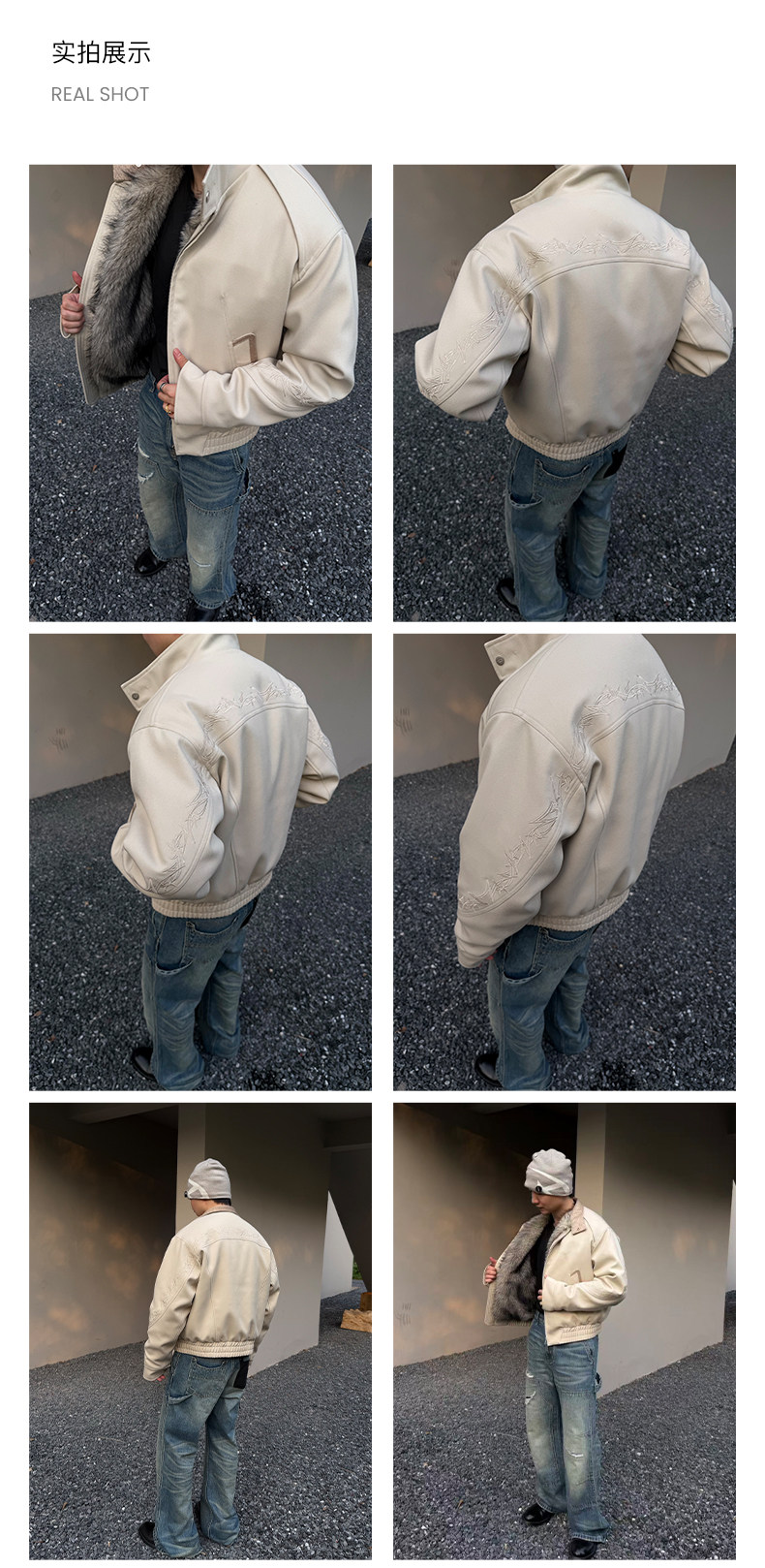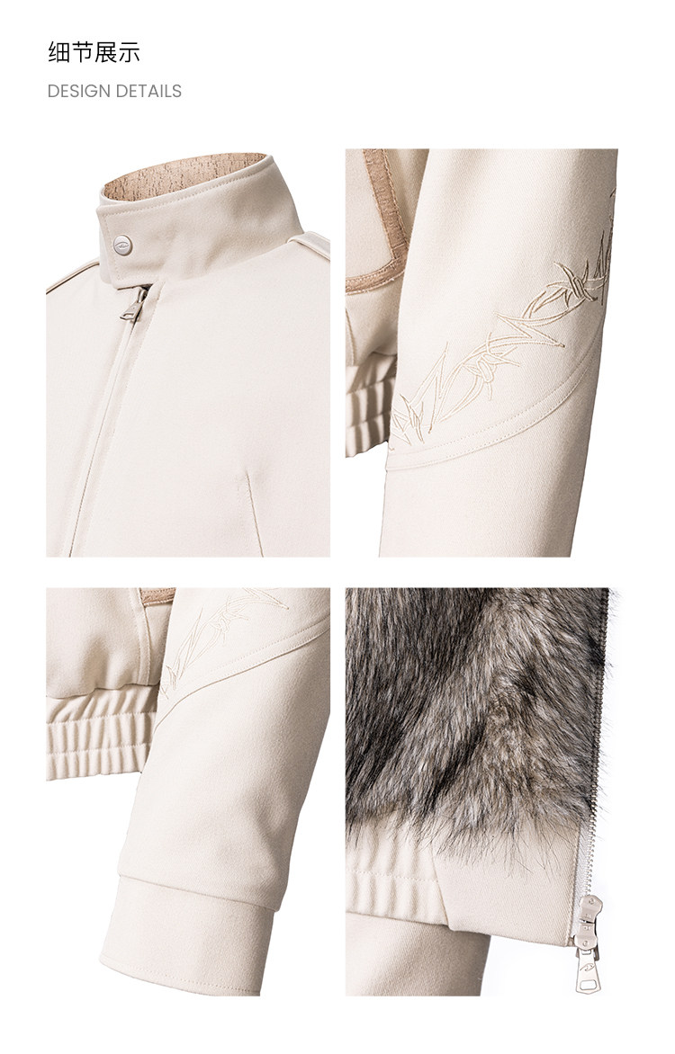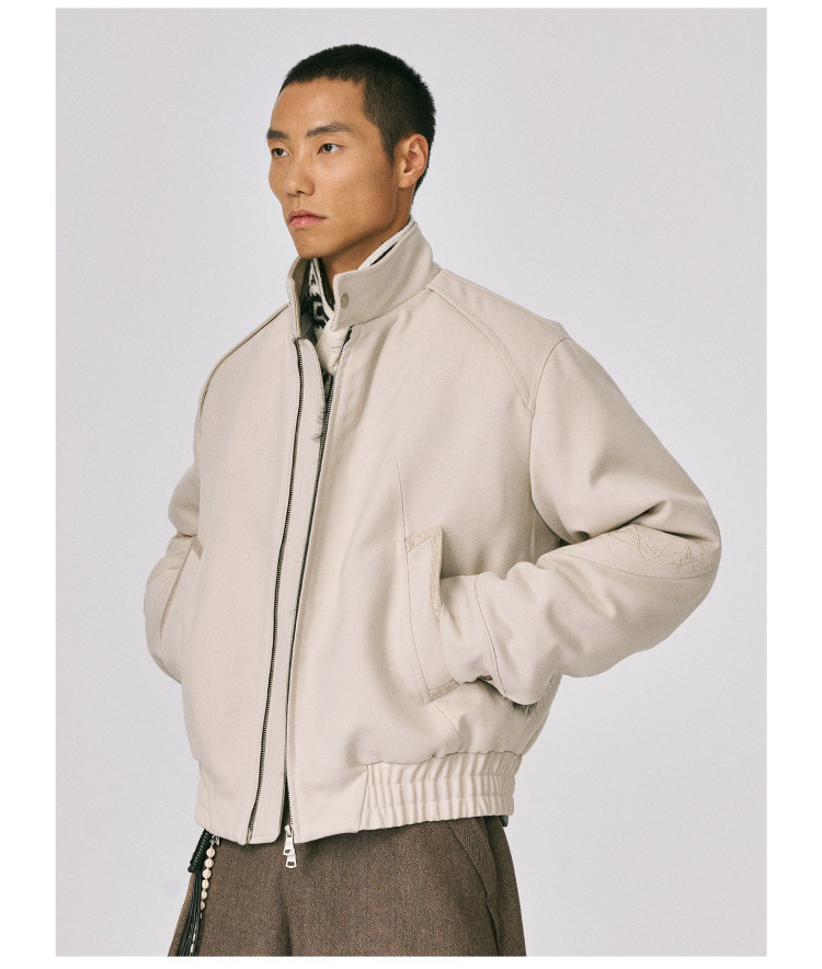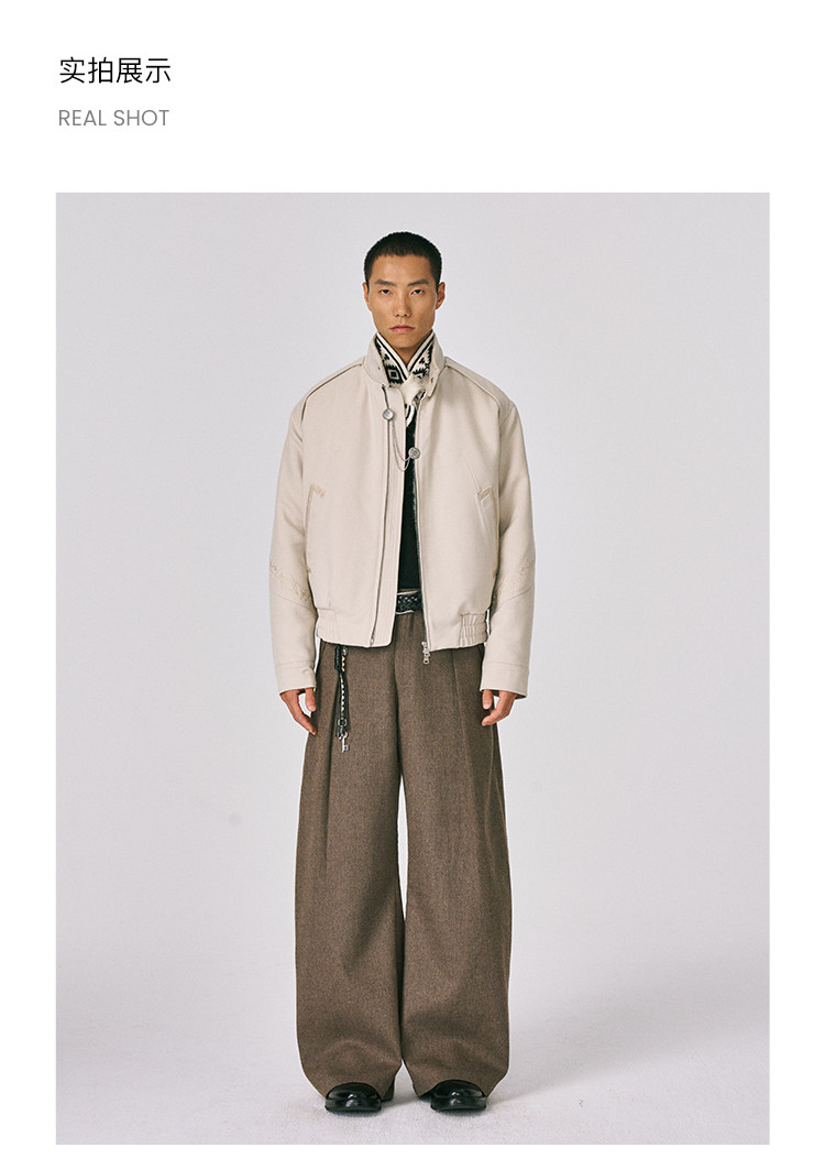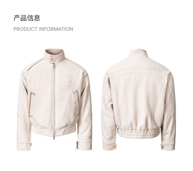 - The overall silhouette strikes a balance between "everyday casual" and "niche design," meeting the comfort needs of daily wear while offering distinct design appeal through its unique structural details. The pile-lined interior locks in heat, boosting warmth during autumn and winter, while adding a luxurious texture to the overall design. Thorn embroidery extends continuously from the sleeve across the back to the right side, creating high recognition and elevating the garment from a "basic item" to a "niche design piece"—avoiding outfit repetition while enhancing visual layering. The elasticized waist adjustment adapts to different waist sizes and body shapes, ensuring a tailored fit while contributing to a relaxed, casual style. Contrast-texture panels elevate the design highlights, intensifying the garment's design sensibility and visual impact.