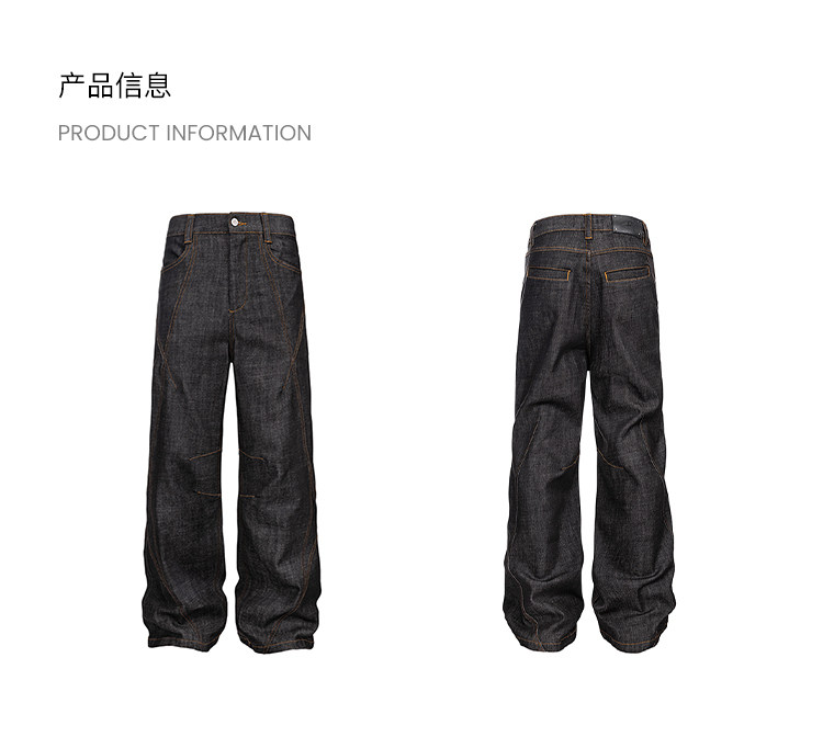 - Crafted from a blend of cotton, lyocell, polyester, and spandex. Lyocell fibers provide a soft, breathable hand feel, while the cotton base retains the classic denim texture. Spandex offers subtle stretch to accommodate active movements such as riding, and polyester enhances shape retention. The fabric undergoes pre-shrunk treatment for durability and resistance to sagging.Dynamic Scimitar Silhouette: Features three-dimensional curved tailoring from the hips to the ankles. The front rise follows the curve of the upper thigh, while the inverted triangular back yoke supports the hips. The pant legs swing naturally with movement, ensuring a restriction-free feel.Geometric Structural Language: All-overines extend into decorative topstitching seams that visually slim the leg. The side seam is shifted forward to optimize leg proportions. Added fabric volume and mobility allowance at the inner knee create natural shadow folds when squatting.Practical Detail System: Widened belt loops disperse pressure at the waist and accommodate wider belts. Custom hat-style rivets provide enhanced fastening strength, reducing friction and loosening during pocket use. The back pockets are angled at 37° to align with the natural motion of hand insertion.Topstitching Accents: Light golden-brown stitching outlines the three-dimensional seam lines.Triple-Needle Chain Stitching: Reinforces stress points such as the crotch and knees.