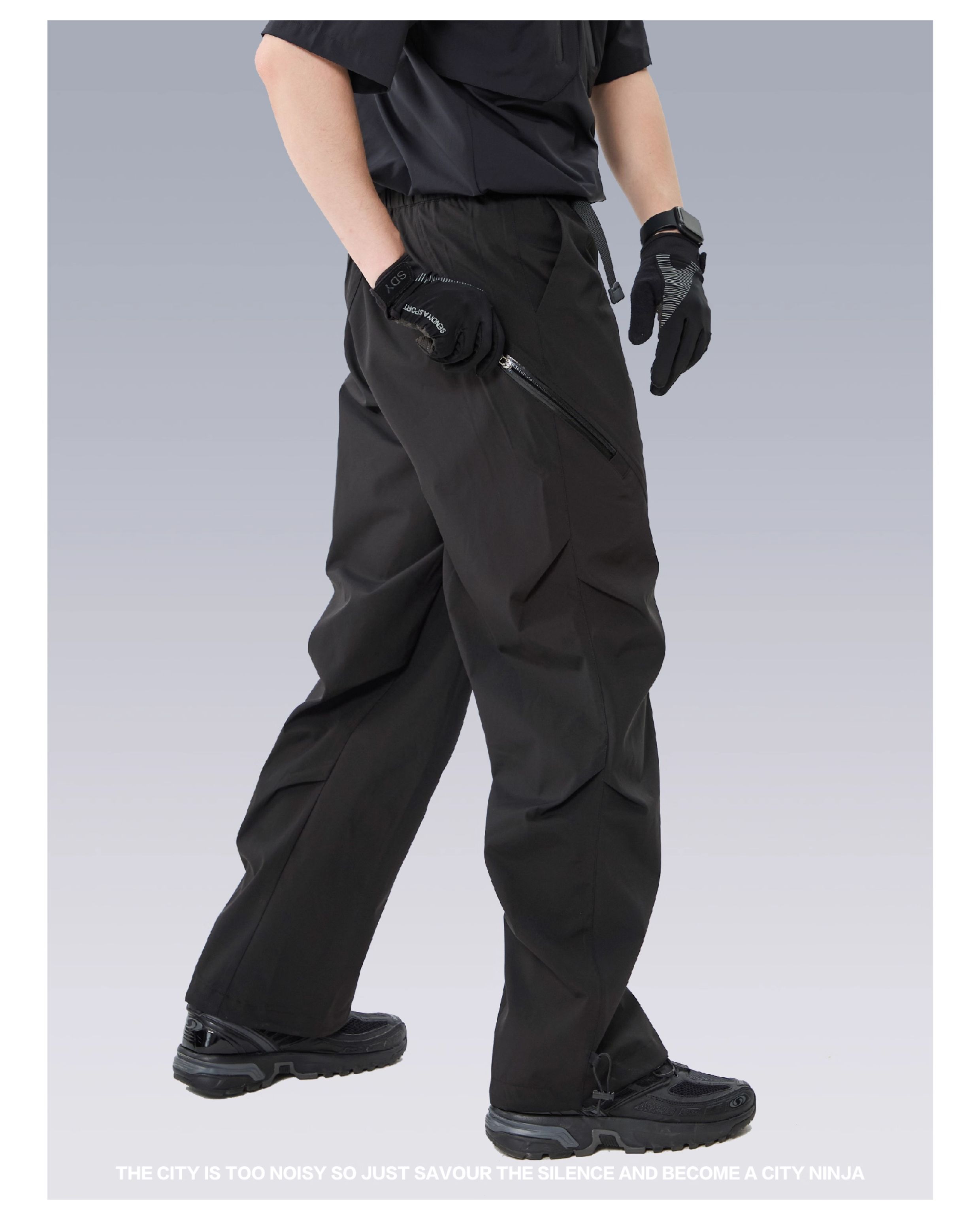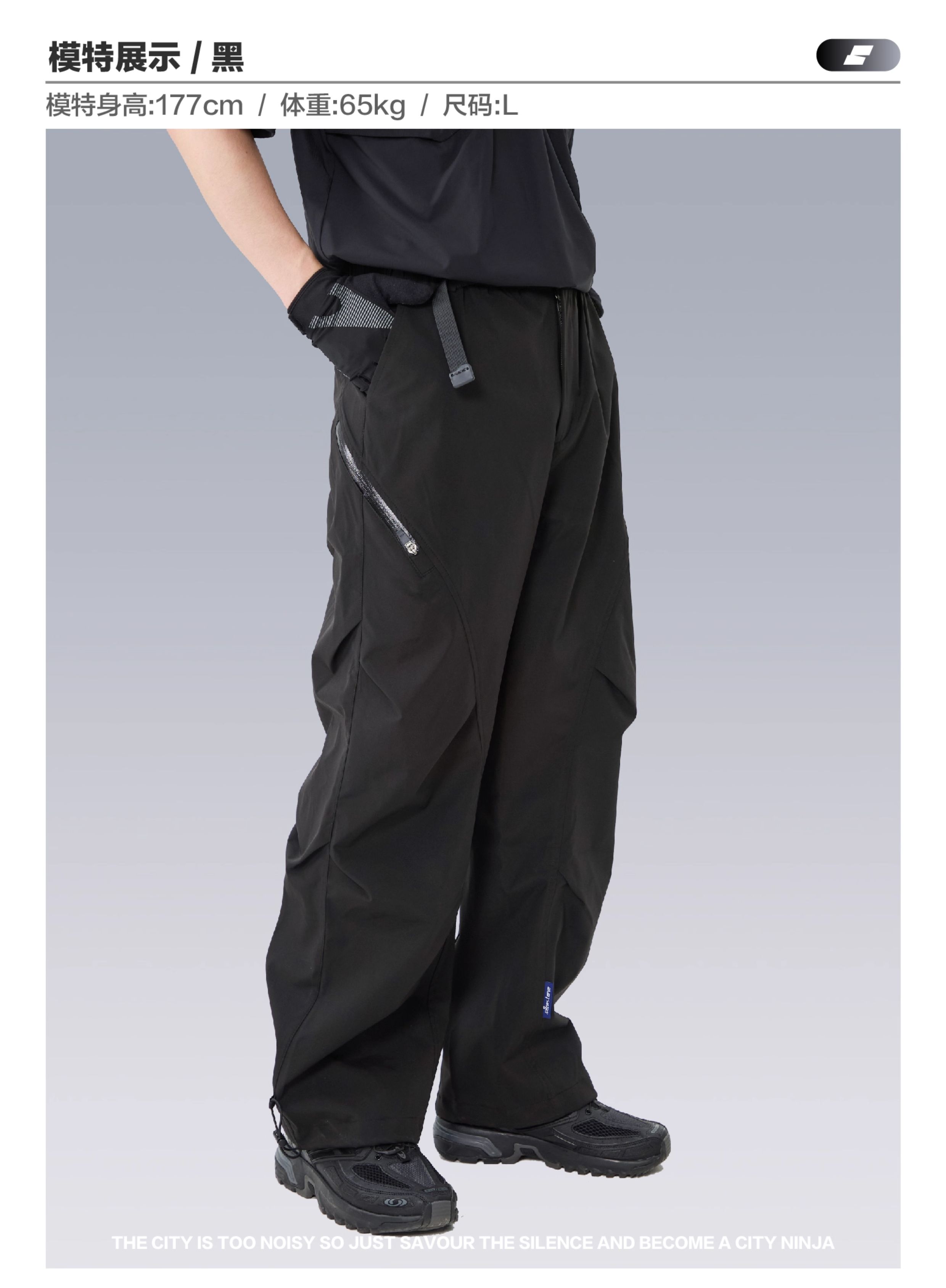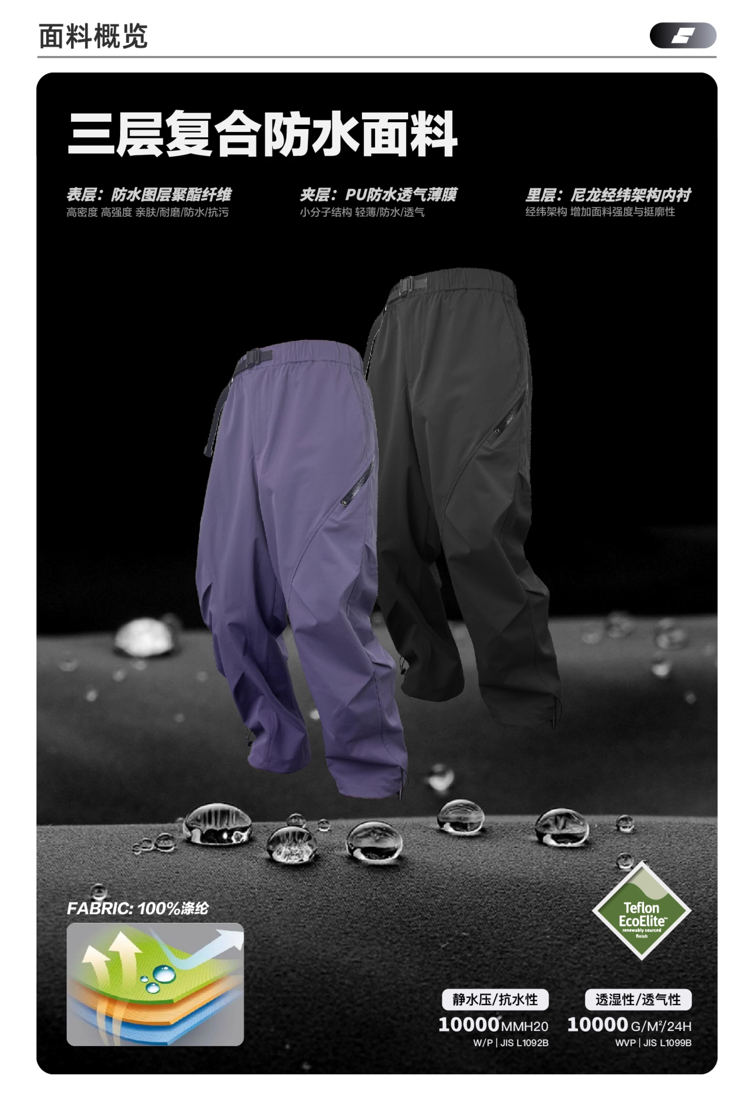 - These outdoor pants are crafted from three-layer composite fabric designed for waterproofing, durability, and comfort. The outer layer is a high-density, high-strength polyester with waterproof, abrasion-resistant, and stain-resistant properties. The middle layer features a lightweight PU waterproof and breathable membrane, ensuring both protection and ventilation. The inner layer consists of a nylon warp-and-weft structure, enhancing fabric strength and garment structure. Ideal for harsh outdoor conditions while maintaining comfort and flexibility.