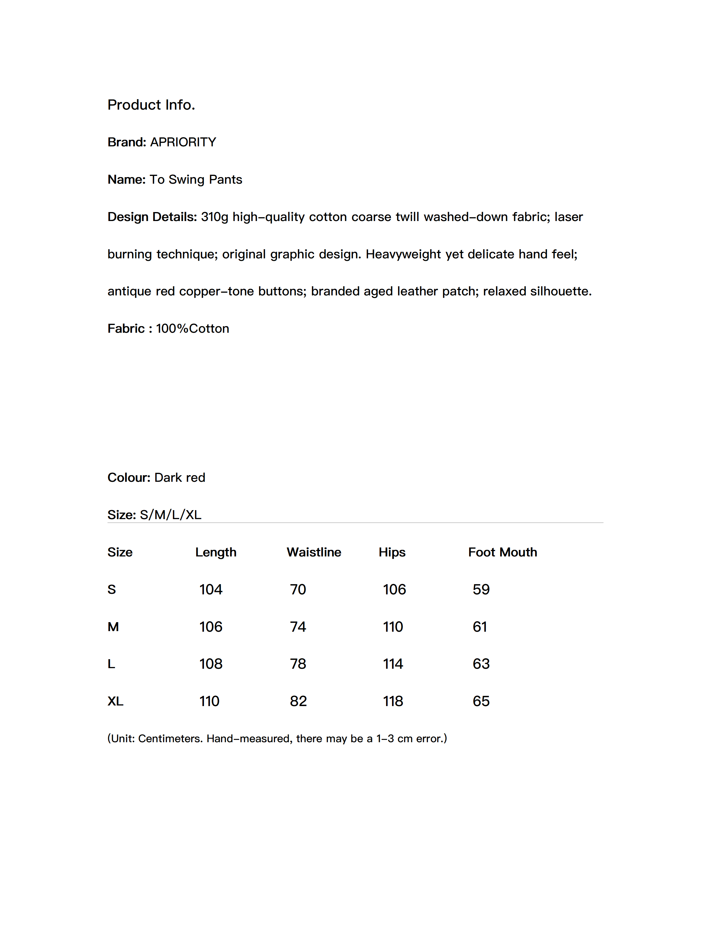 310g high-quality cotton coarse twill washed-down fabric; laser burning technique; original graphic design. Heavyweight yet delicate hand feel; antique red copper-tone buttons; branded aged leather patch; relaxed silhouette.