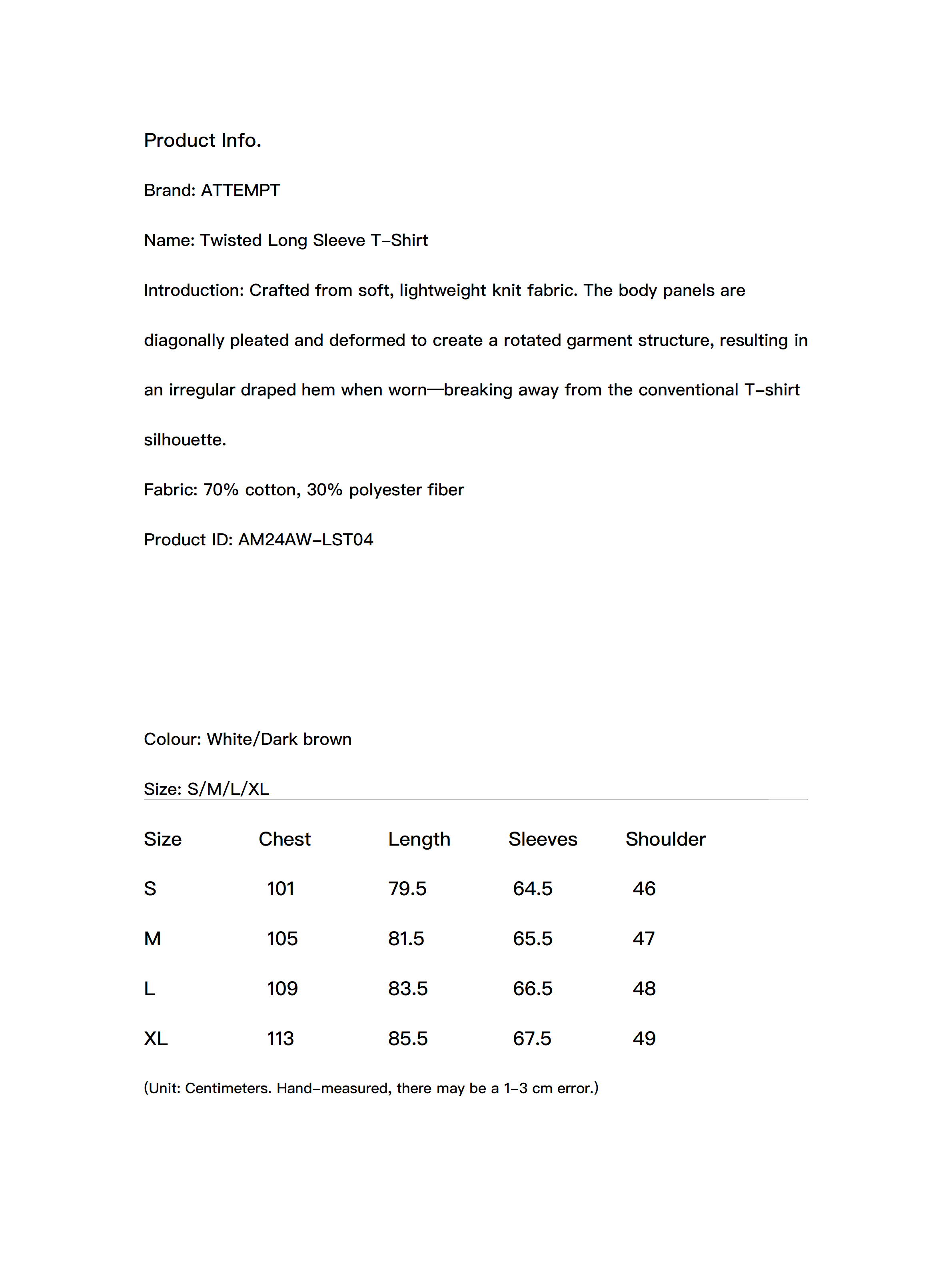 Crafted from soft, lightweight knit fabric. The body panels are diagonally pleated and deformed to create a rotated garment structure, resulting in an irregular draped hem when worn—breaking away from the conventional T-shirt silhouette.