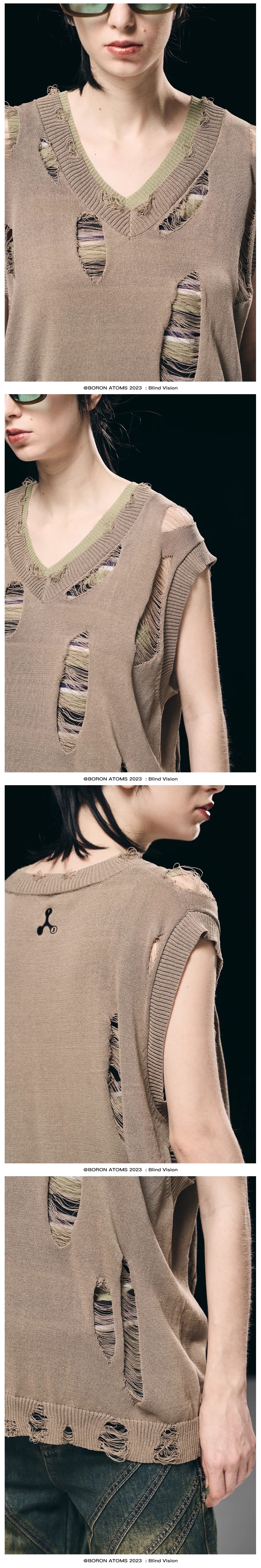 - This two-piece set features a unique design. The outer layer adopts a distressed knit technique, creating a fashionable and personalized look. The inner layer cleverly incorporates contrasting striped designs, adding a touch of mystery. The overall effect is both avant-garde and layered, providing freedom in styling.