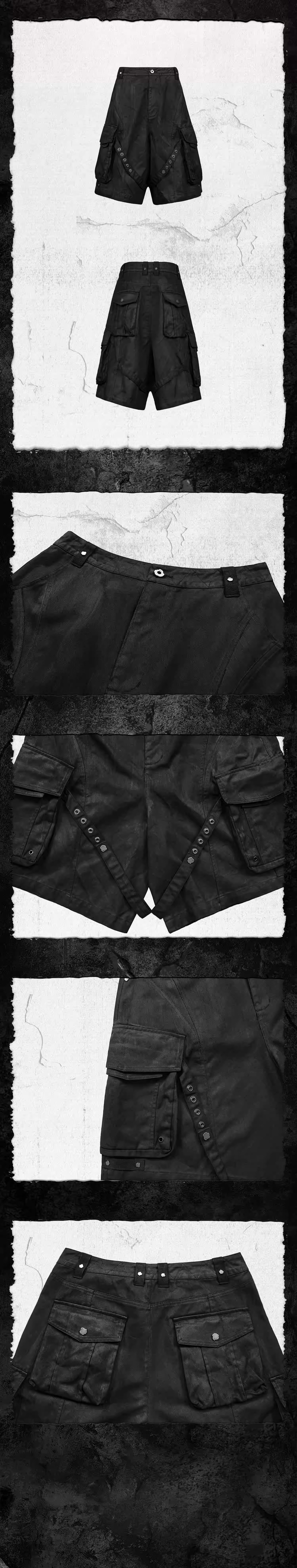 Design Details: These structured shorts feature a hand-brushed wax finish, giving the black fabric a molten, rugged texture. The deconstructed demon fang design breaks conventional aesthetics, creating a striking visual impact. Crisscrossed straps resemble a net from the abyss, embodying both entrapment and hidden strength. Multiple three-dimensional pockets seamlessly blend functionality with decoration, while custom metal embellishments add an industrial gothic touch. These shorts evoke the essence of a warrior navigating through mist and shadow.