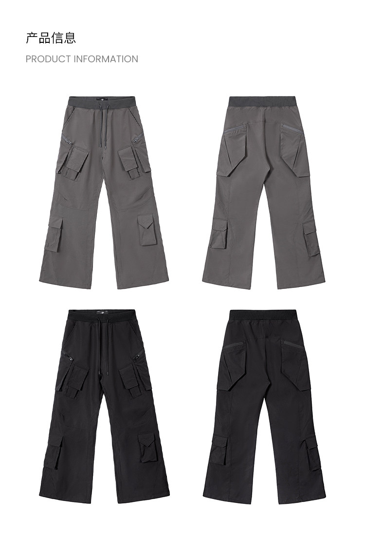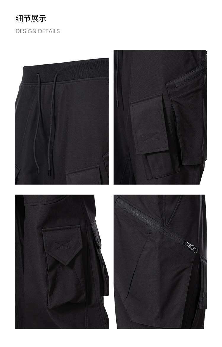 - Pocket design: multi-dimensional 3D layout that balances visual appeal with functionality. The layered, staggered arrangement breaks visual monotony and reinforces the utilitarian tech aesthetic. Matte fabric offers an understated, premium look, while its structured drape maintains a sharp silhouette in a relaxed fit. Three-dimensional tailoring and seam lines not only accentuate the rugged workwear character but also visually streamline the wide-leg cut for more balanced leg proportions. The waist combines ribbed panels with a drawstring: the ribbing offers elastic contouring to the waistline, while the drawstring adds adjustable ease. The “fitted top, relaxed bottom” contrast creates heightened visual tension in the overall silhouette.