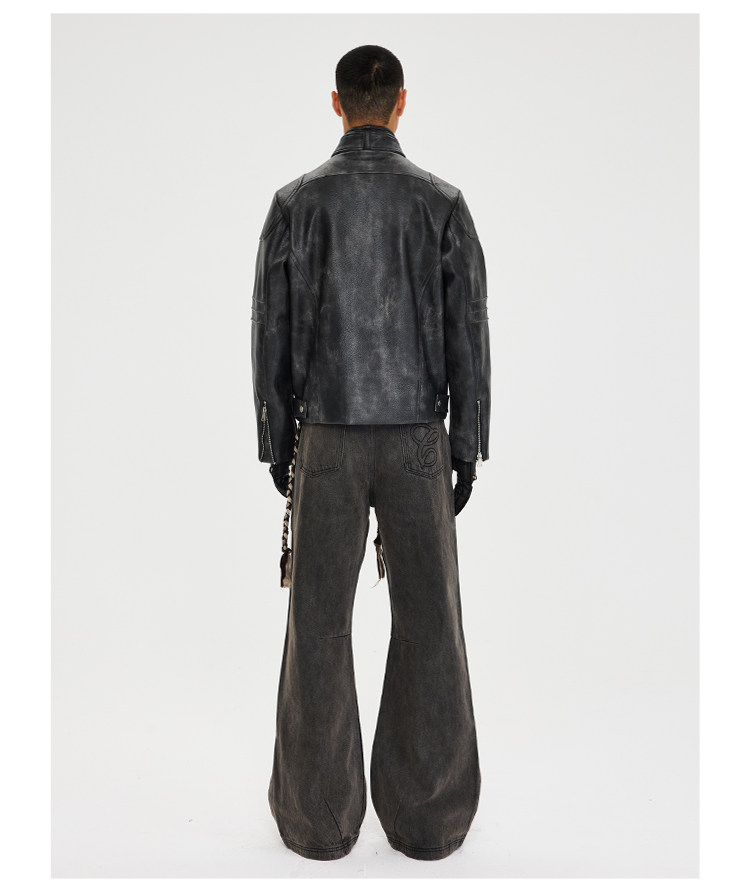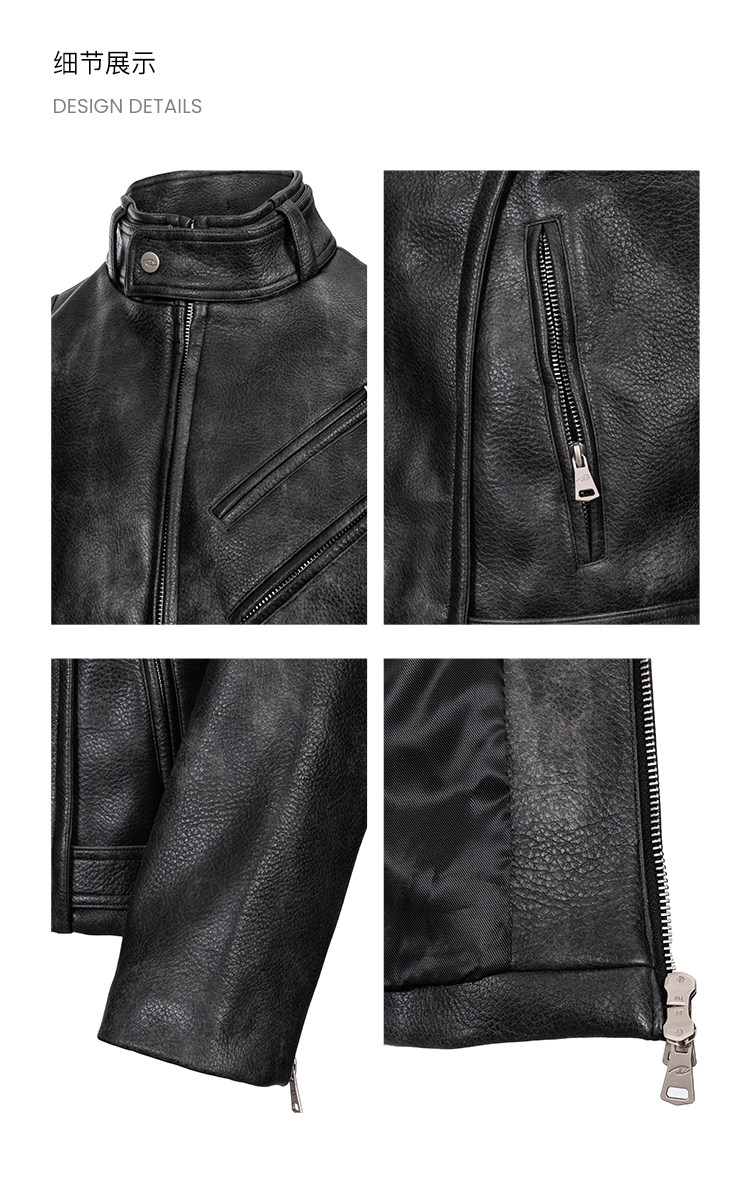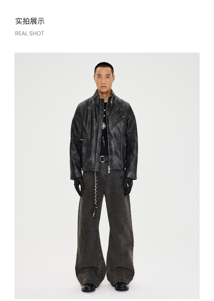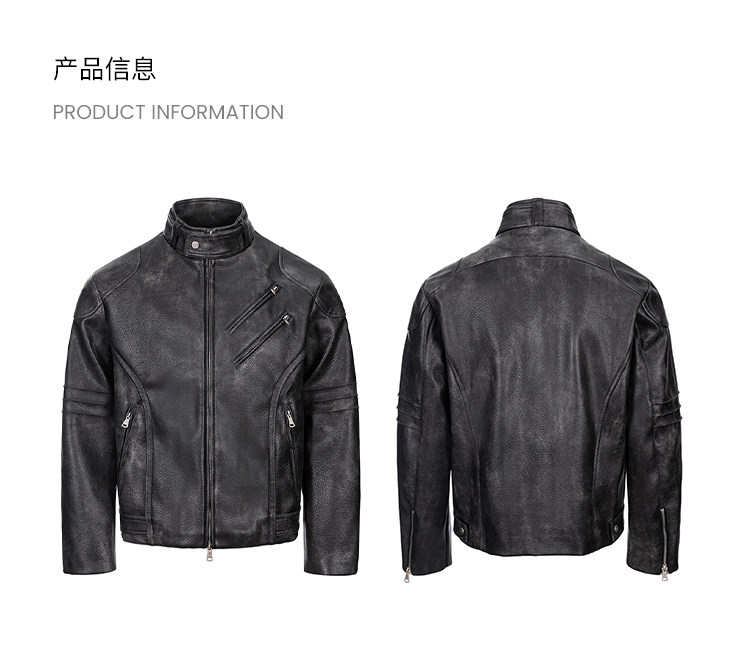 - Constructed with three-dimensional tailoring to create a natural waist-slimming effect, it moves with a dynamic drape that visually elongates the legs. The front features dual-panel seaming to accentuate the chest, while the rear design extends from the neckline to the hem, adding depth and dimension to the back. Custom matte alloy zippers glide smoothly, with laser-engraved brand logos on each pull. Adjustable straps at the collar and hem are fastened with custom matte buckles, maintaining a consistent muted texture throughout. A garment-wash treatment softens localized areas, mimicking the vintage, lived-in character of natural leather while preventing overall fading and preserving visual cohesion.