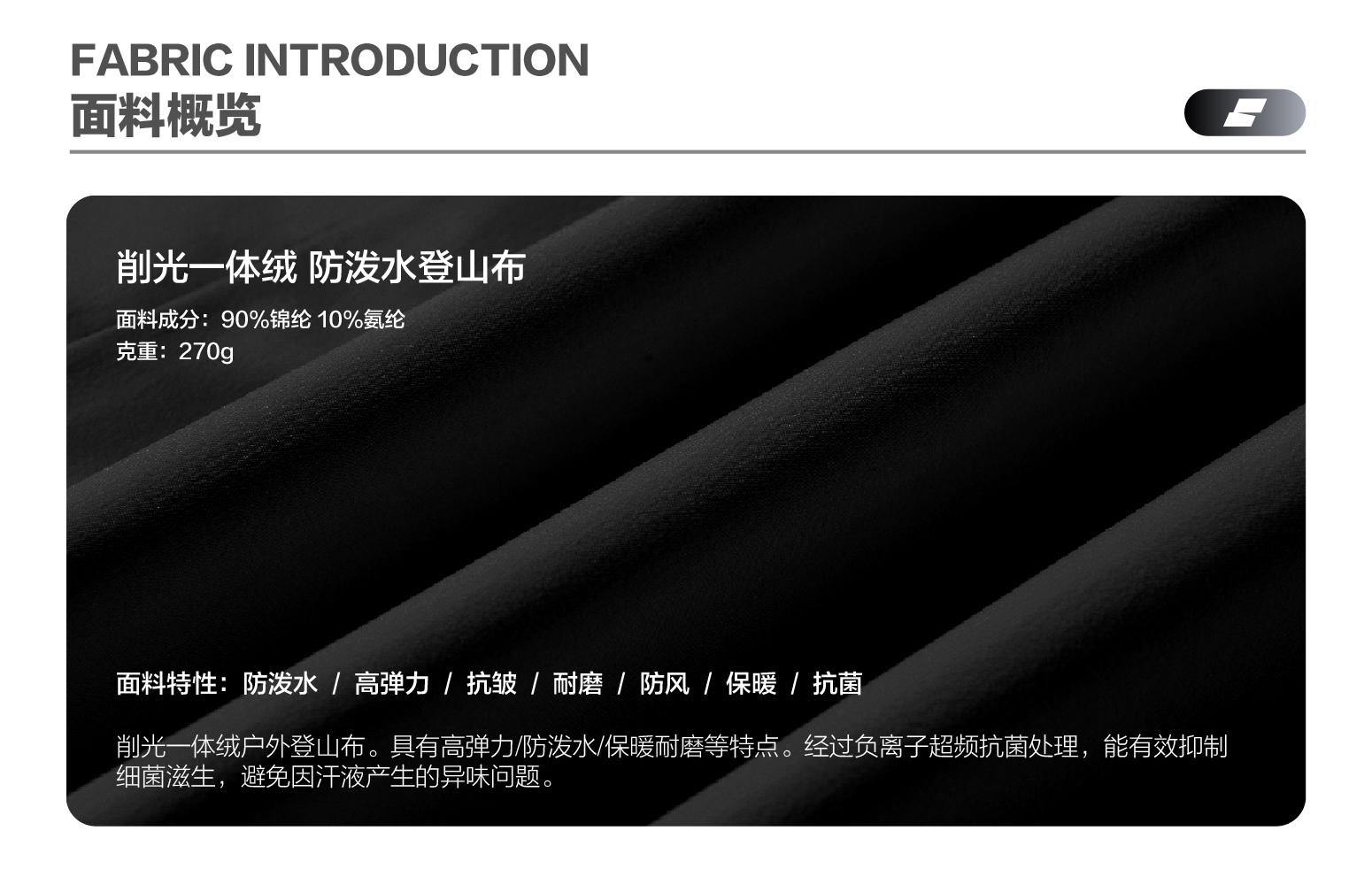 • Fabric features: water repellent / high elasticity / anti-wrinkle / wear-resistant / windproof / warm / antibacterial
