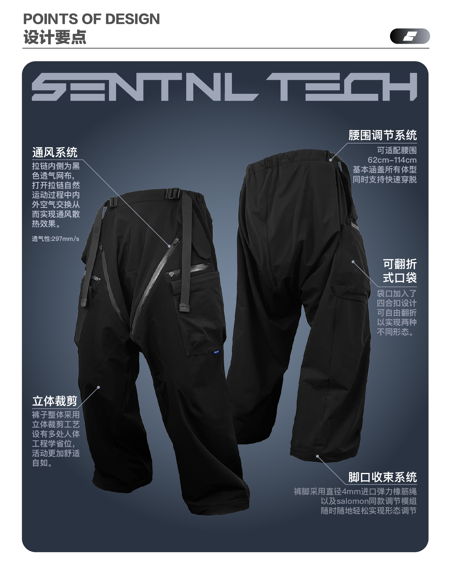 - The waist adjustment system fits waist sizes from 62cm to 114cm, accommodating most body types and enabling quick wear. Convertible pockets with snap buttons allow two functional configurations. The pants use 3D ergonomic cutting, with multiple darts for improved mobility and comfort. The ankle adjustment system includes 4mm imported elastic cords and a Salomon-style module, enabling easy shape and fit customization.