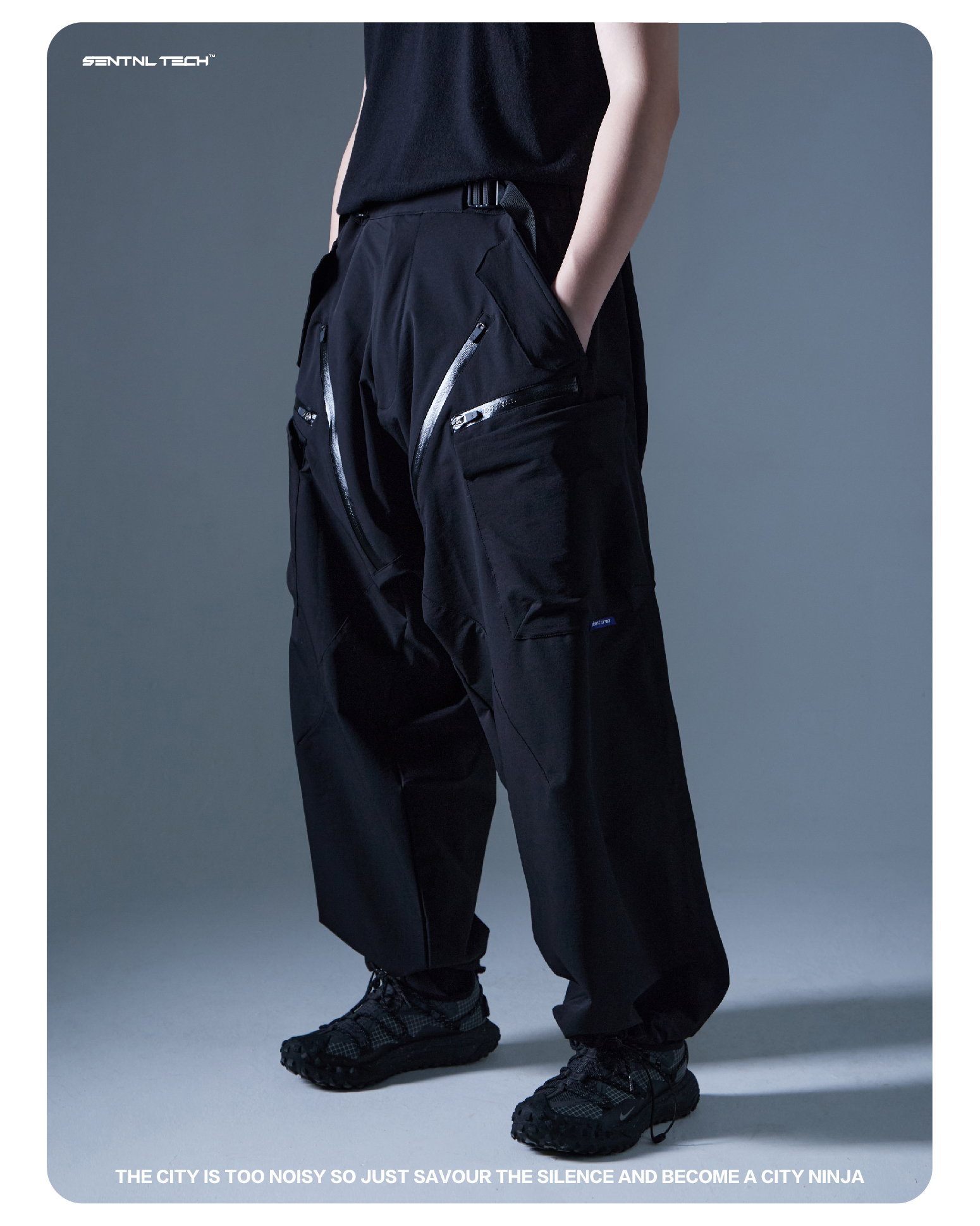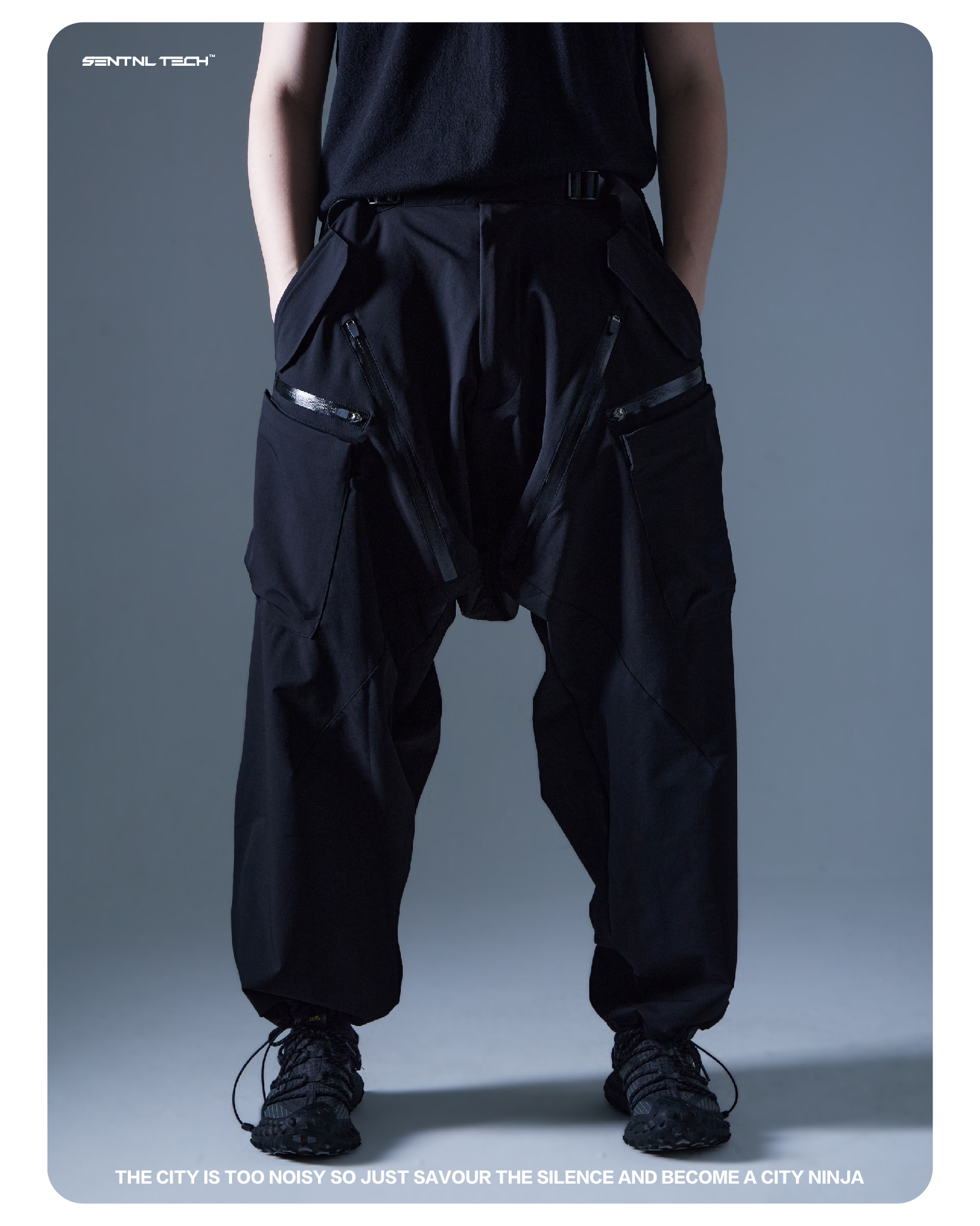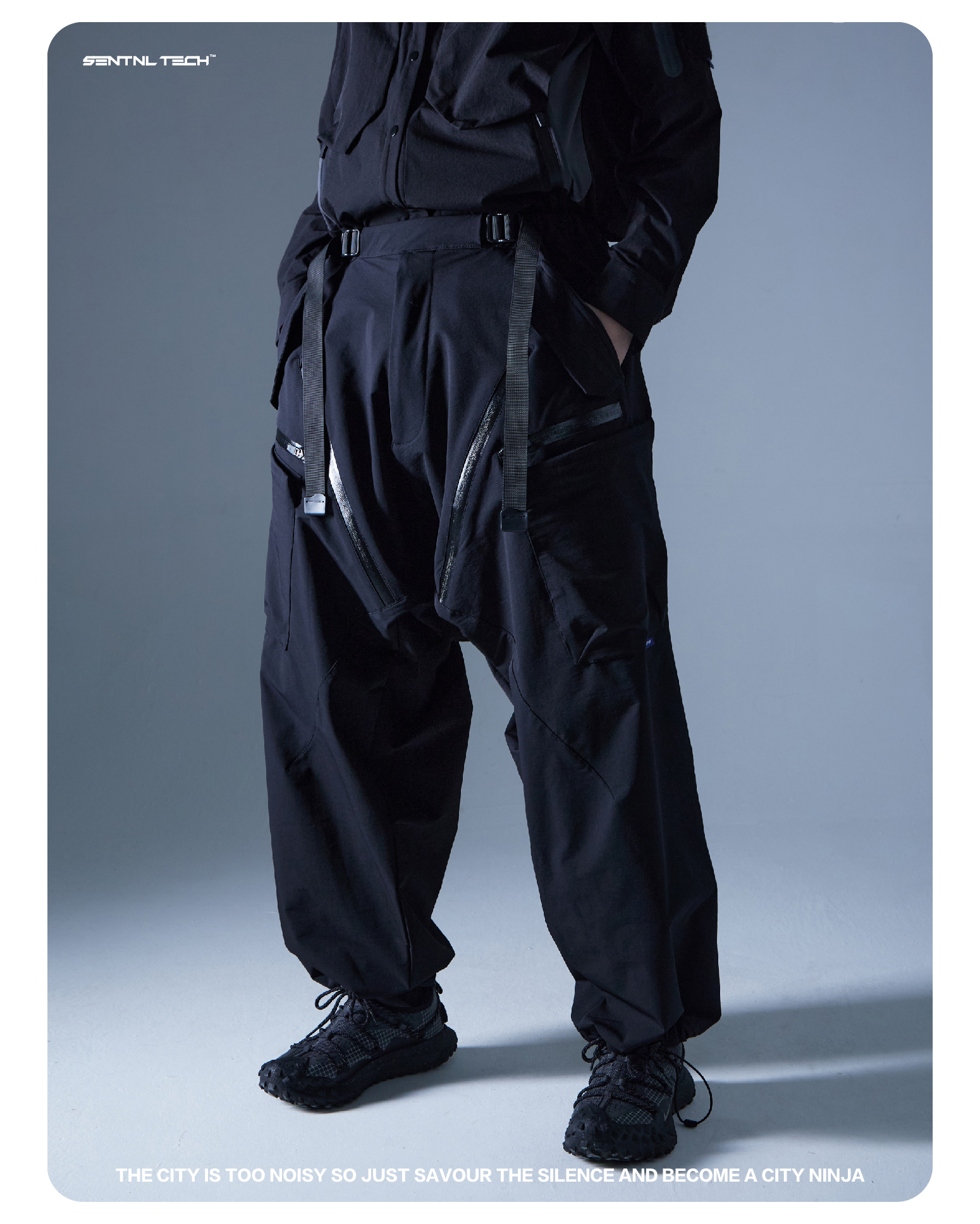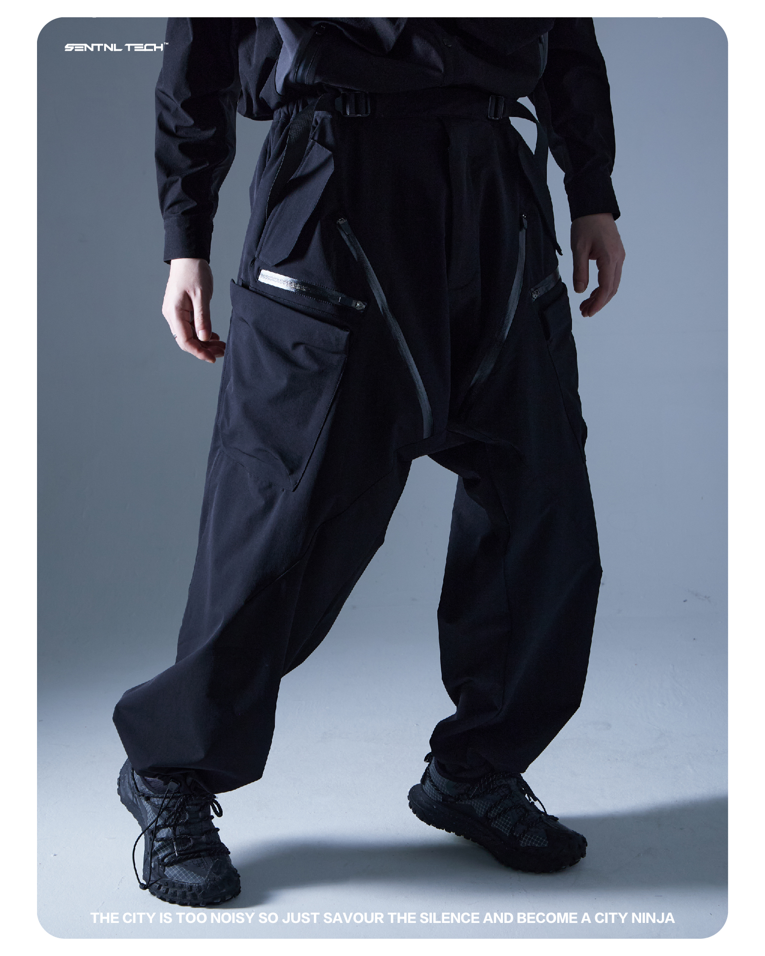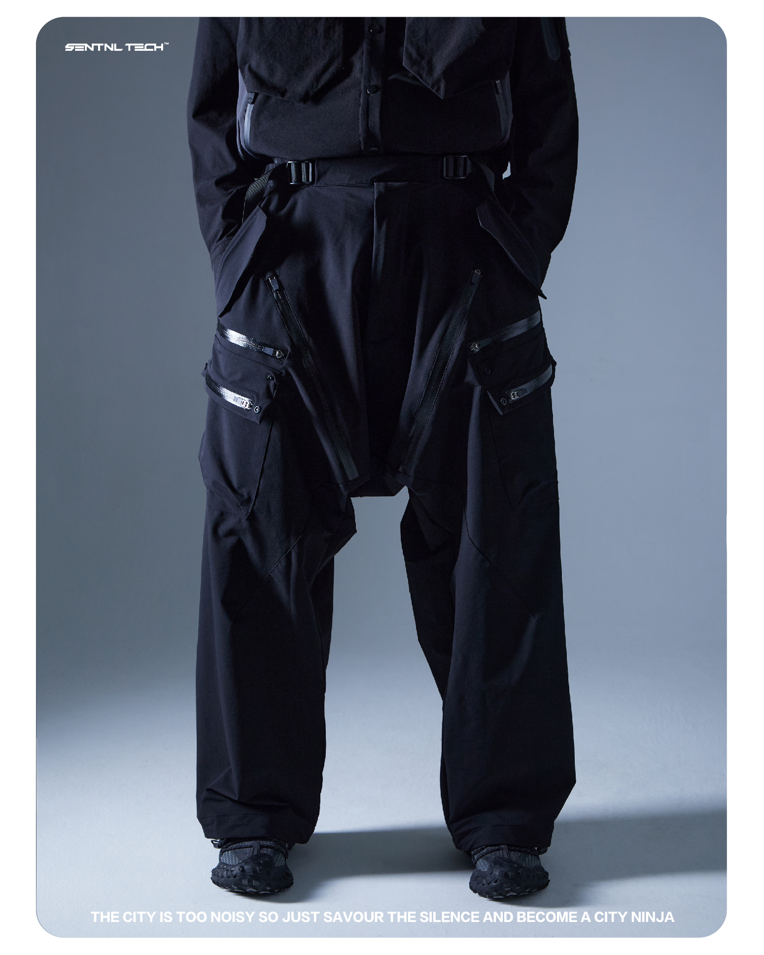 - These drop-crotch pants are designed for full-body adaptability and optimal ventilation. Made from water-repellent brushed mountain fabric, they offer protection against light splashes while maintaining comfort. The ventilation system features black breathable mesh on the inner side of the zippers, allowing natural air exchange during movement, with an air permeability of 297mm/s.